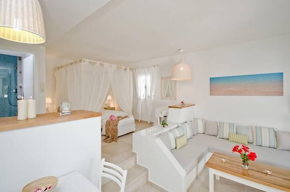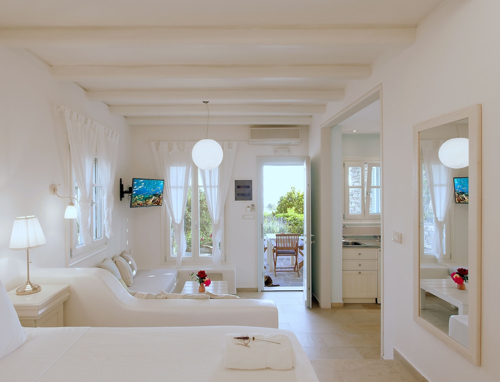 After diligent research we booked our 5 night Naxos stay at the Kavos Hotel and it exceeded our expectations! We wanted a quiet hotel with a beautiful pool and amenities outside Naxos town and away from the crowds. This small hotel was in a perfect location, with a handful of rooms (all very Cycladic in style) with private entrances and patios facing the ocean with a view of the neighboring island, Paros. The rooms were clean, spacious, and comfortable. The hotel grounds are beautifully kept and the pool area with the adjacent restaurant, Stelida, was fantastic. No competition for loungers and there are a few different sitting areas and different types of seating available.