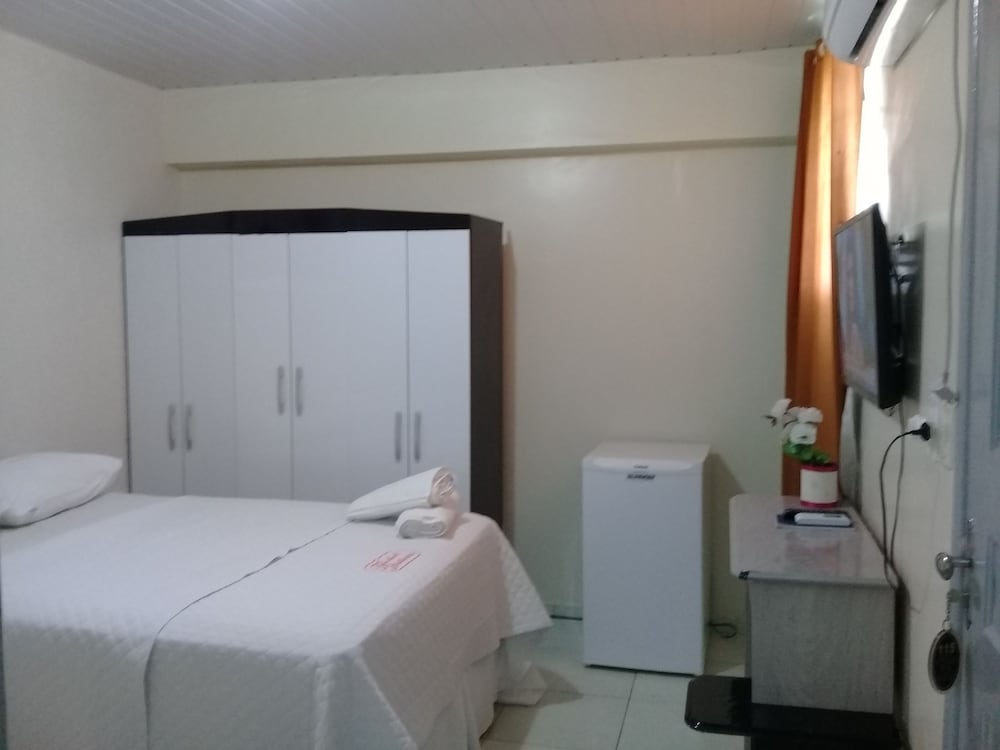 O quarto entrega mais do que imaginei, bem limpo e chuveiro bom. Frigobar e ar funcionado perfeitamente. Quarto espaçoso e com armário. A Cama é um pouco dura, mas confortável.
