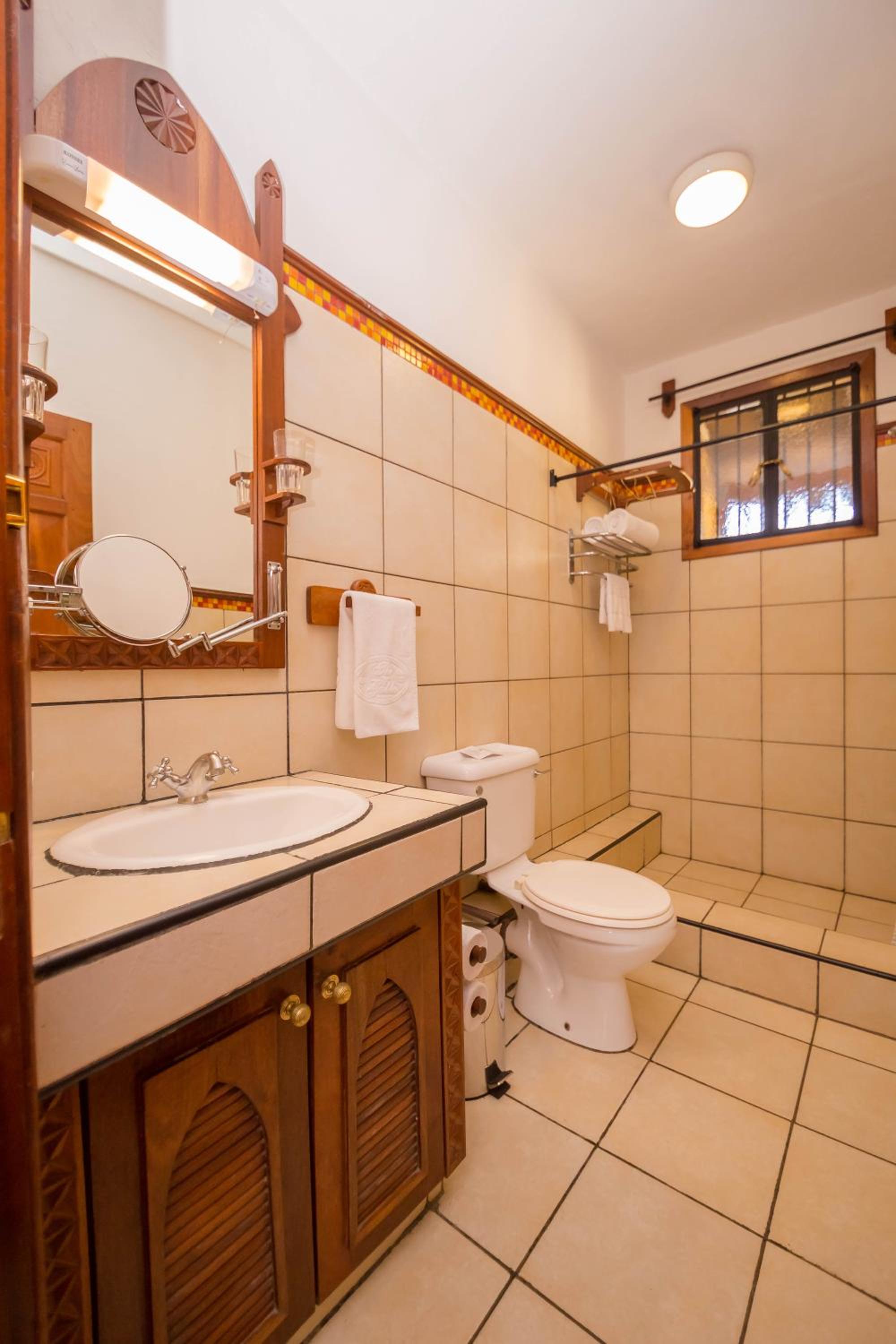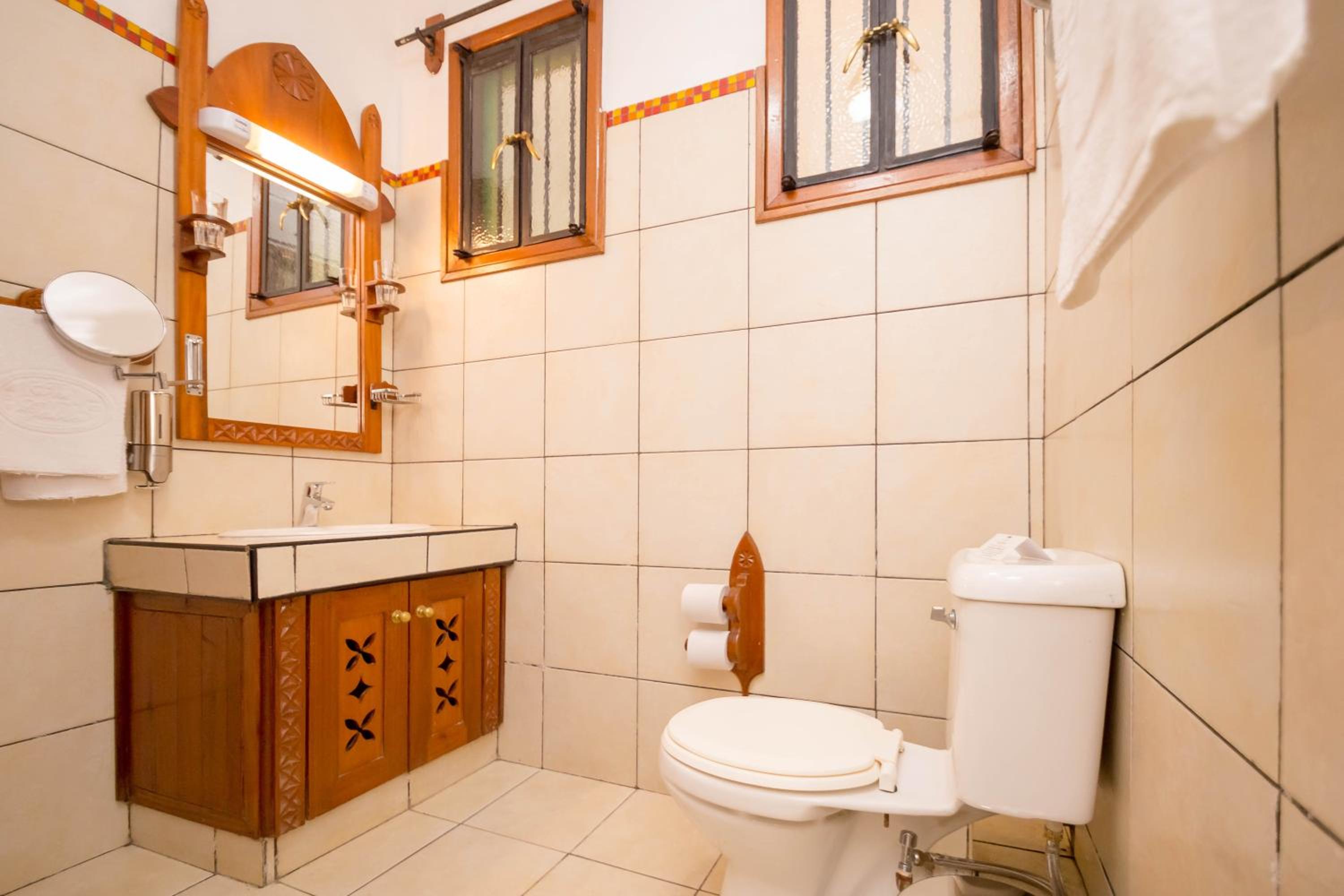 The bathroom is somewhat outdated and could have been cleaner.