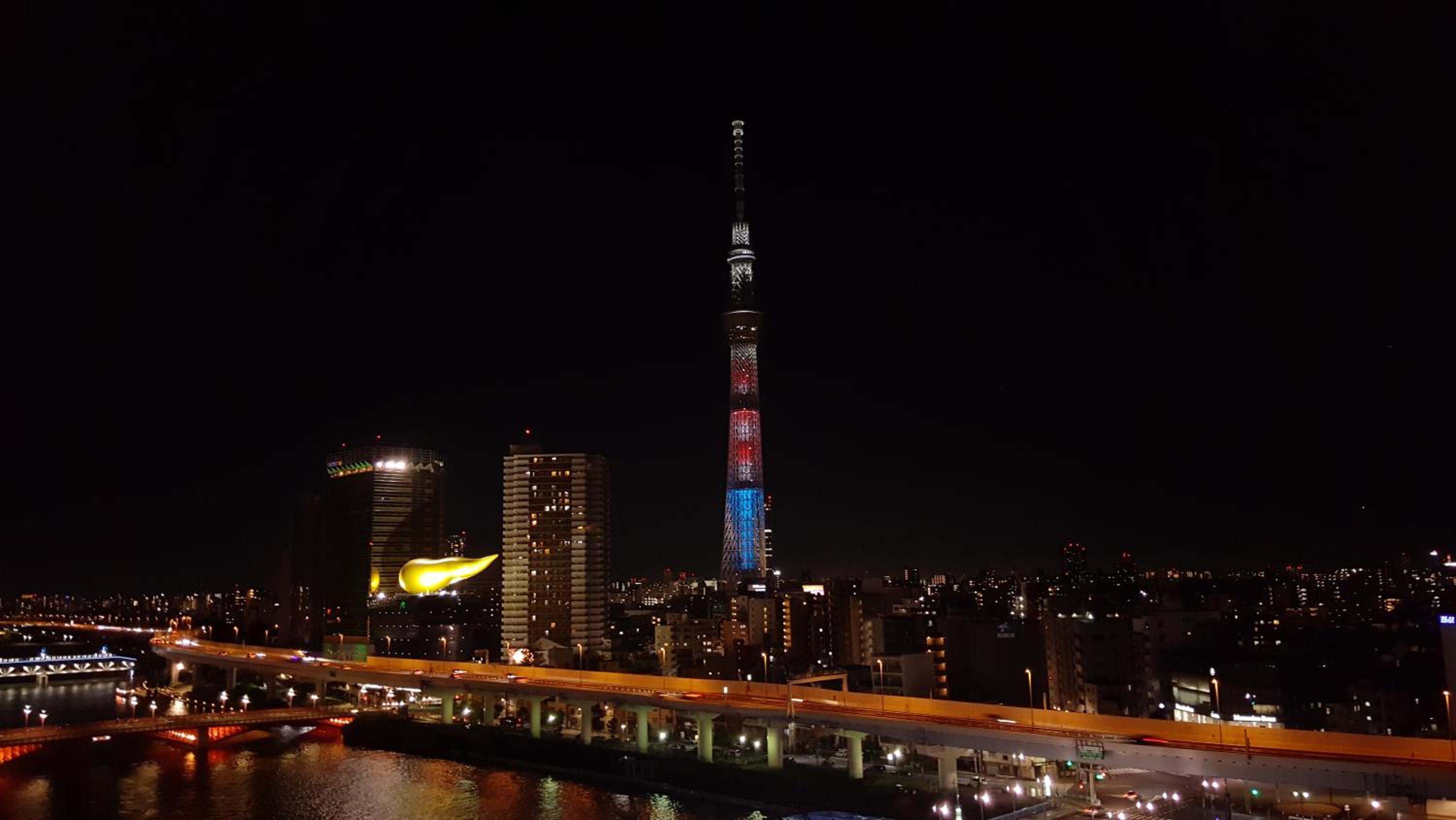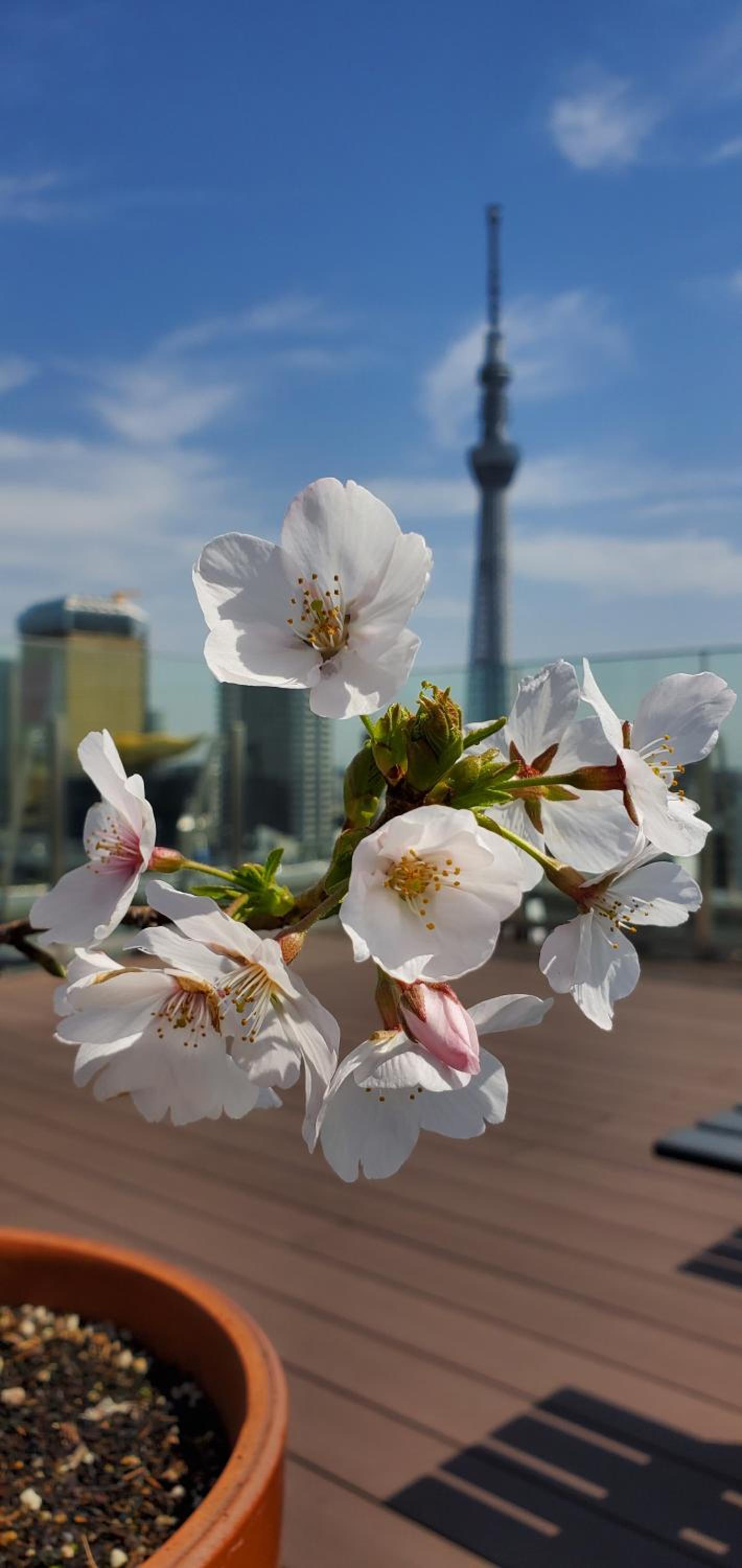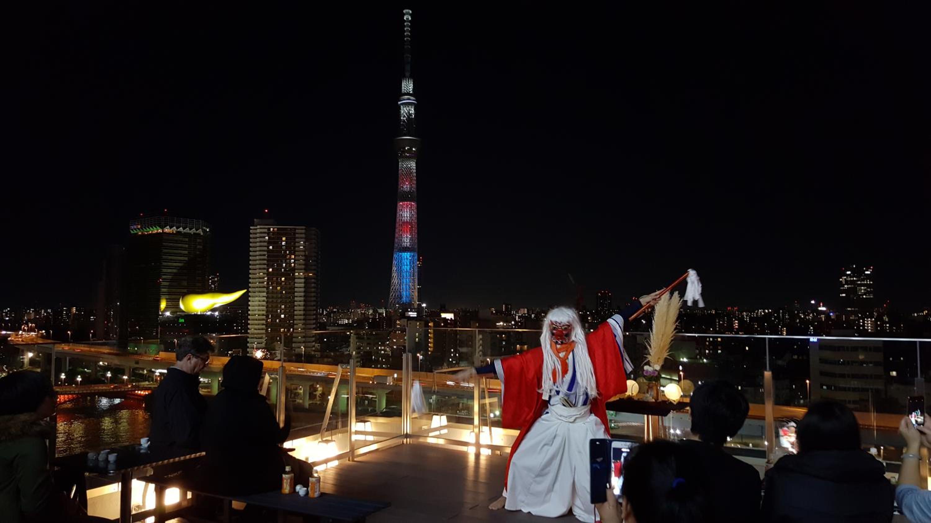 La terraza (con algunos bancos para sentarse y una máquina expendedora de bebidas) tiene una vista al río y al Skytree realmente muy bonita.