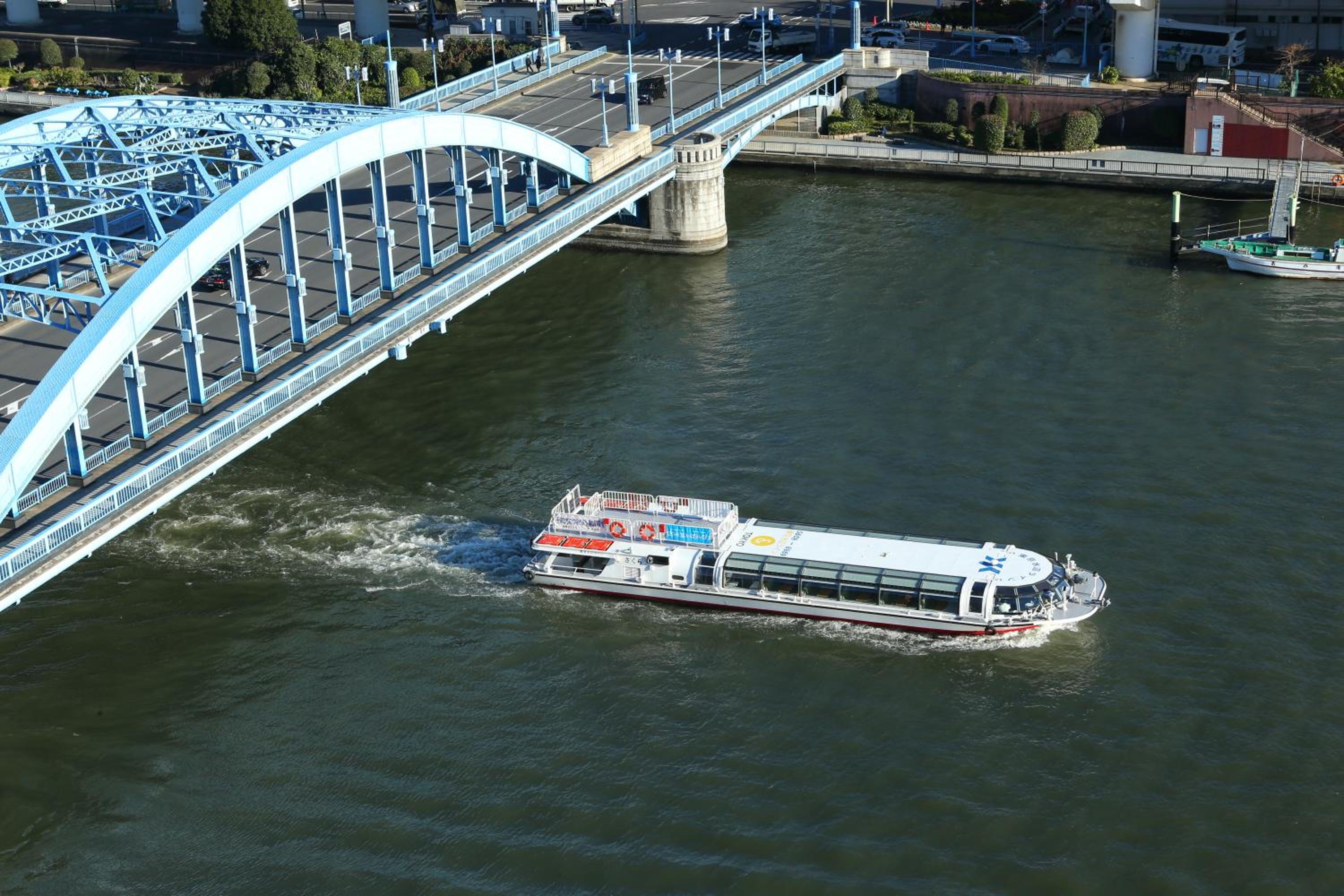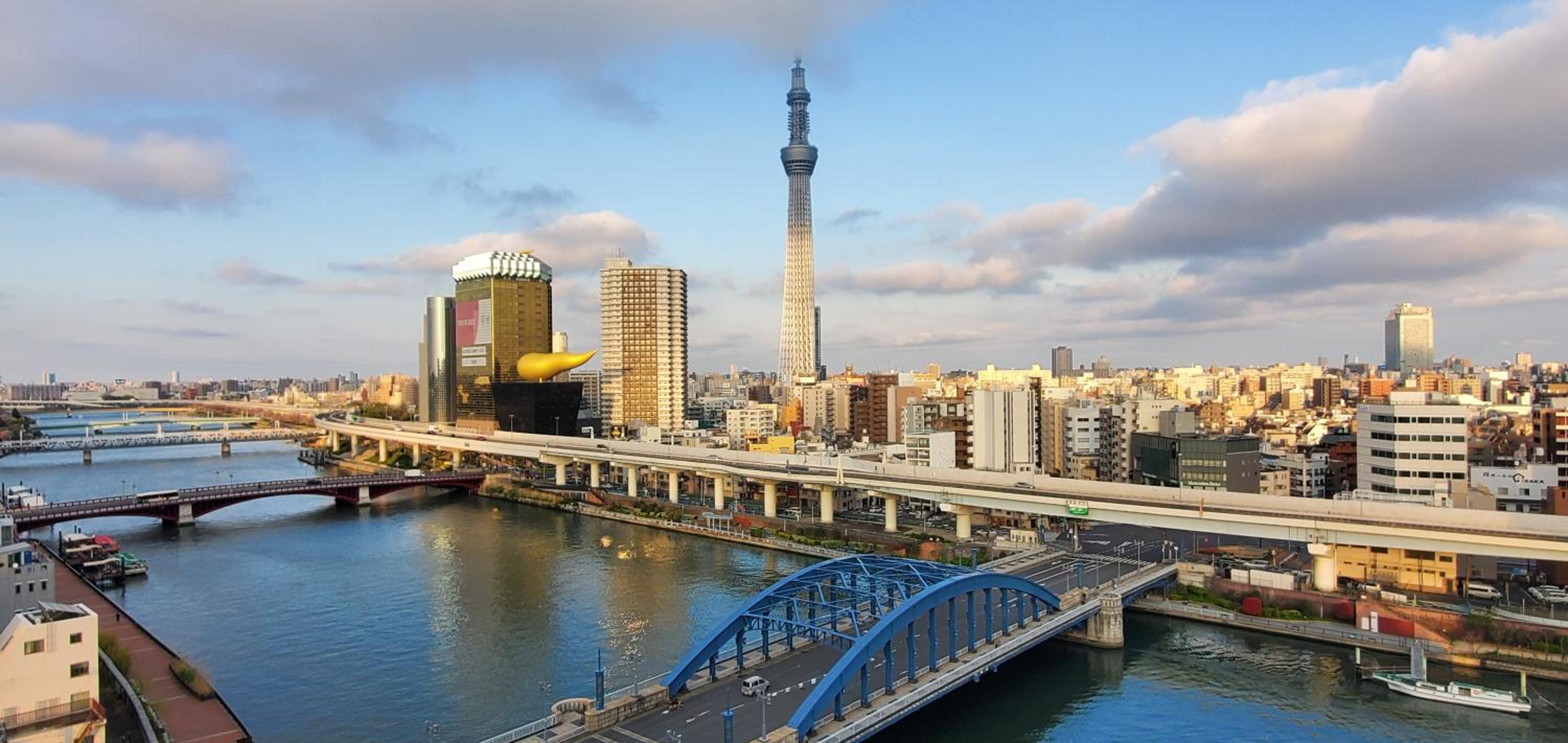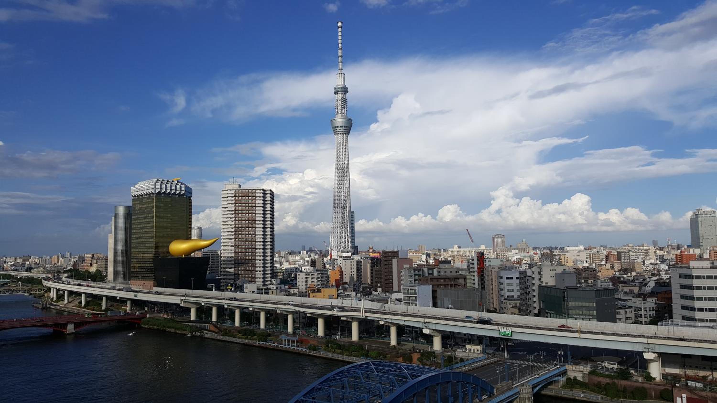 La terraza (con algunos bancos para sentarse y una máquina expendedora de bebidas) tiene una vista al río y al Skytree realmente muy bonita.