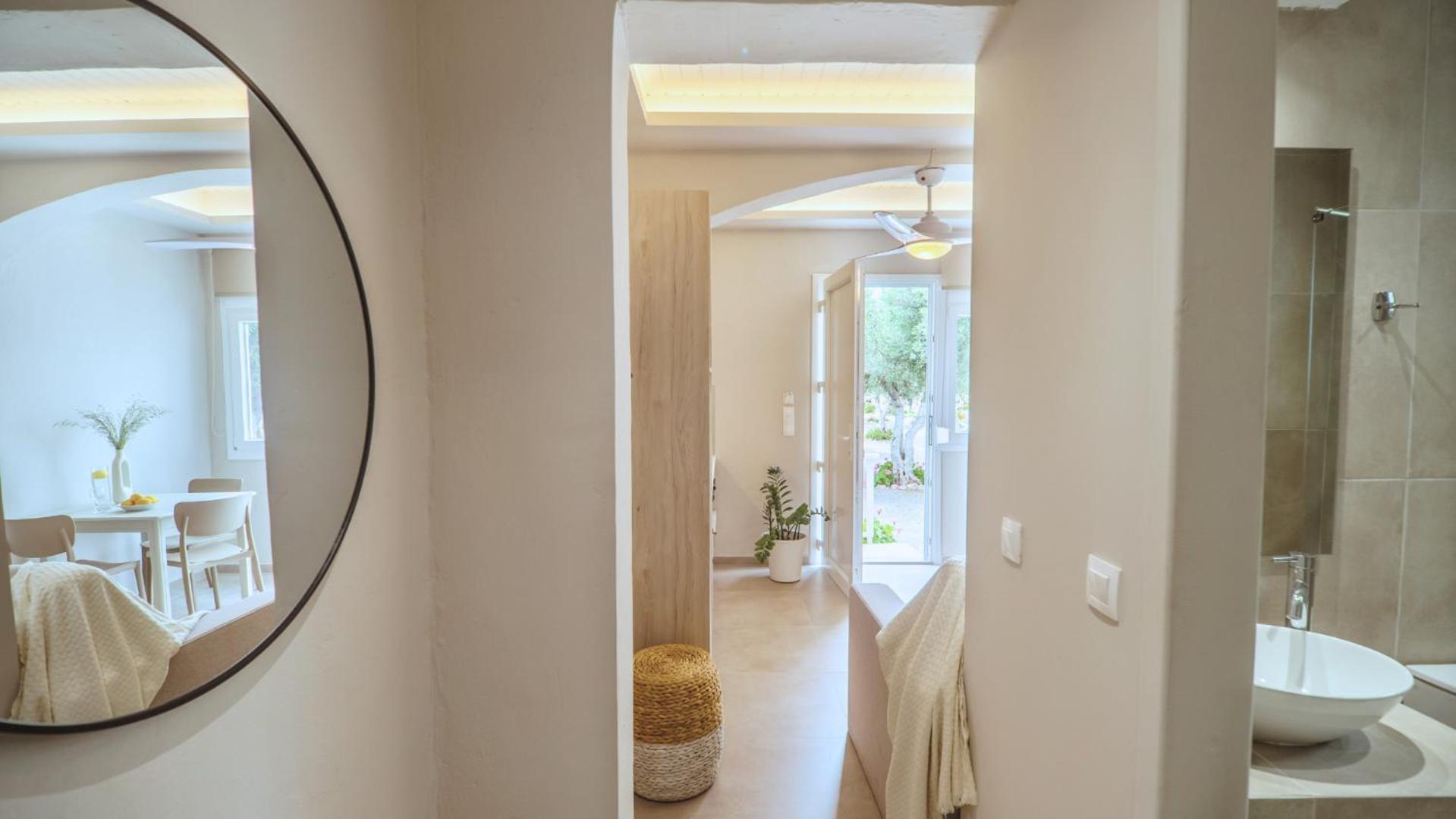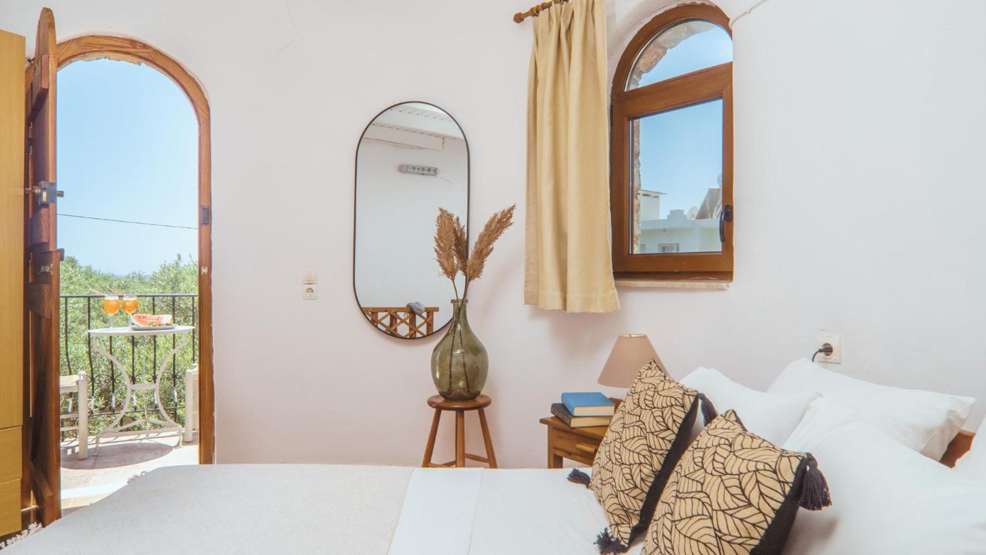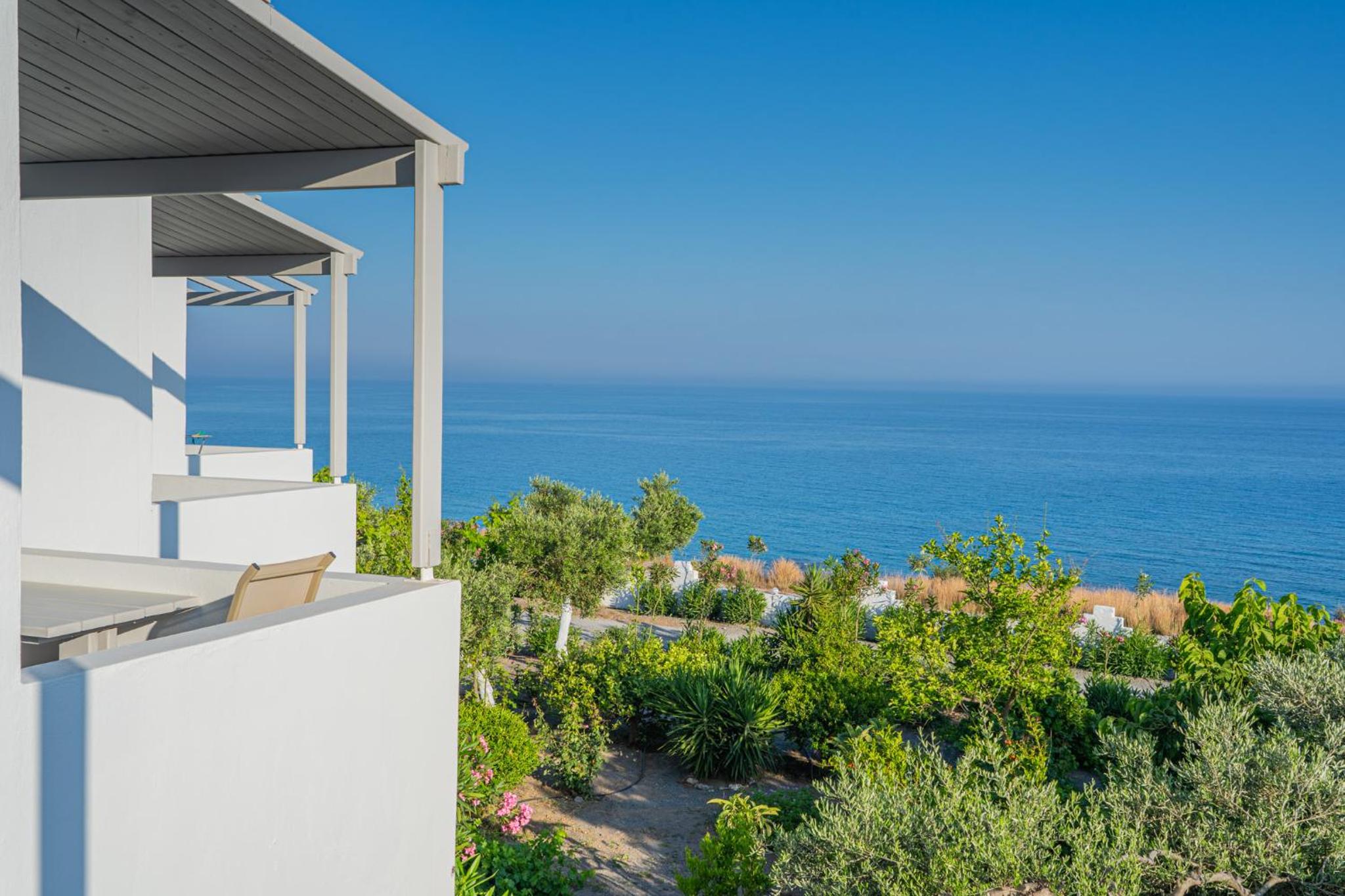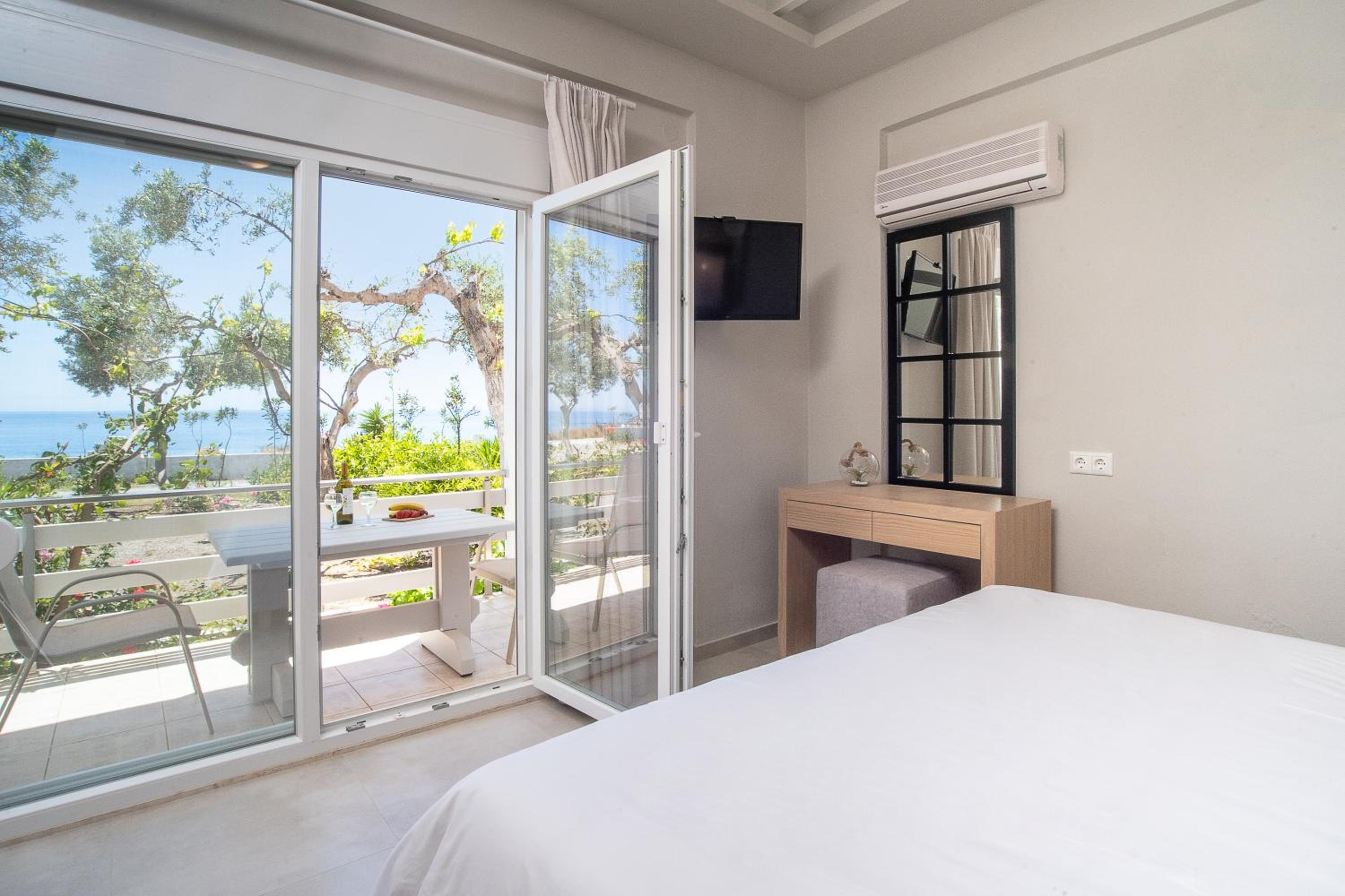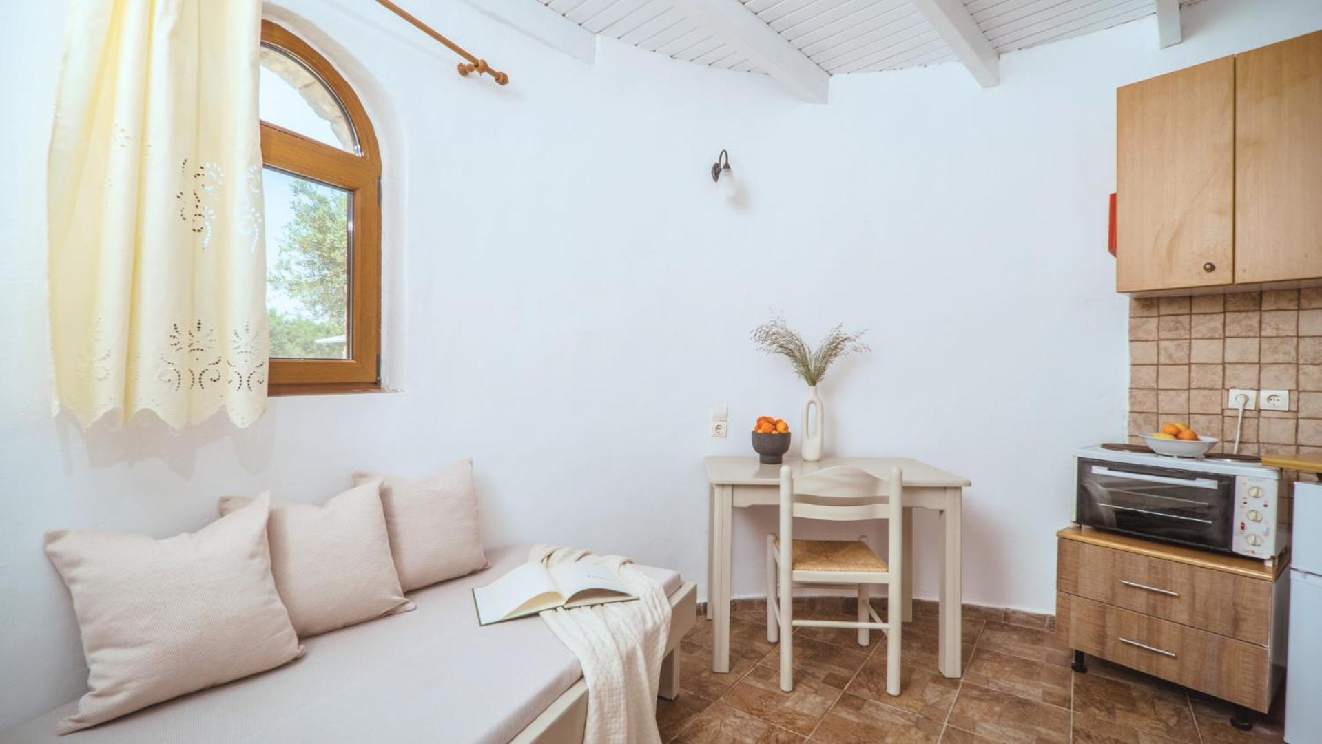 The position is lovely, we could see the sea from our bed. The small terrace where we ate breakfast in the middle of the garden looking at the sea was lovely. The bed is new and very comfortable, the bathroom is very spacious and has enough place for toiletries. The staff was more than friendly, we got beach towels and an umbrella for free. You can have bicycles for free also. The kitchen has everything you need. We received small bottles of family made olive oil and raki. The nearby taverna is great, and the beautiful beach just in front is a blessing. There is a supermarket 2 minutes away where you can buy almost anything you need. We had a wonderful time, we look forward to going back.