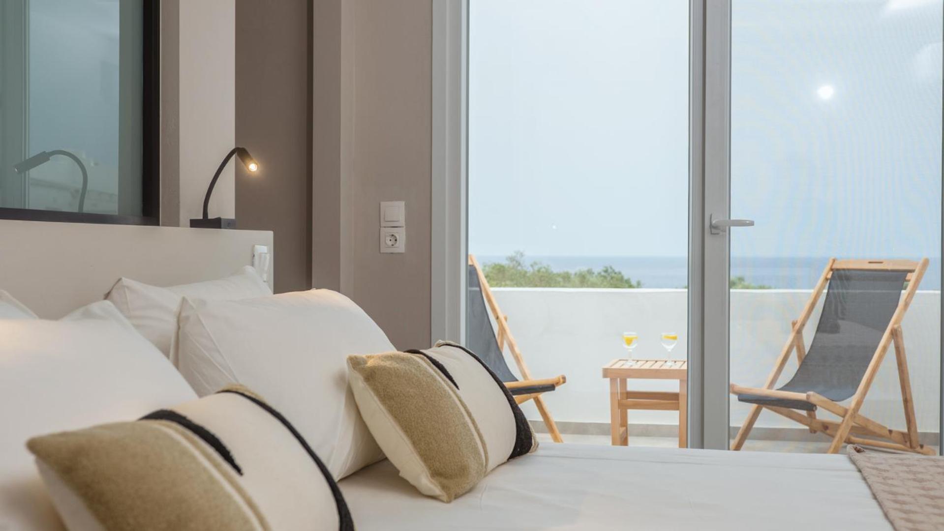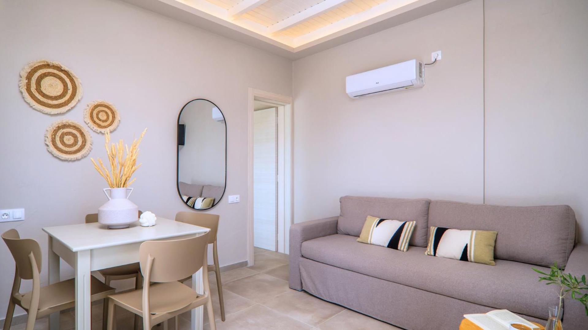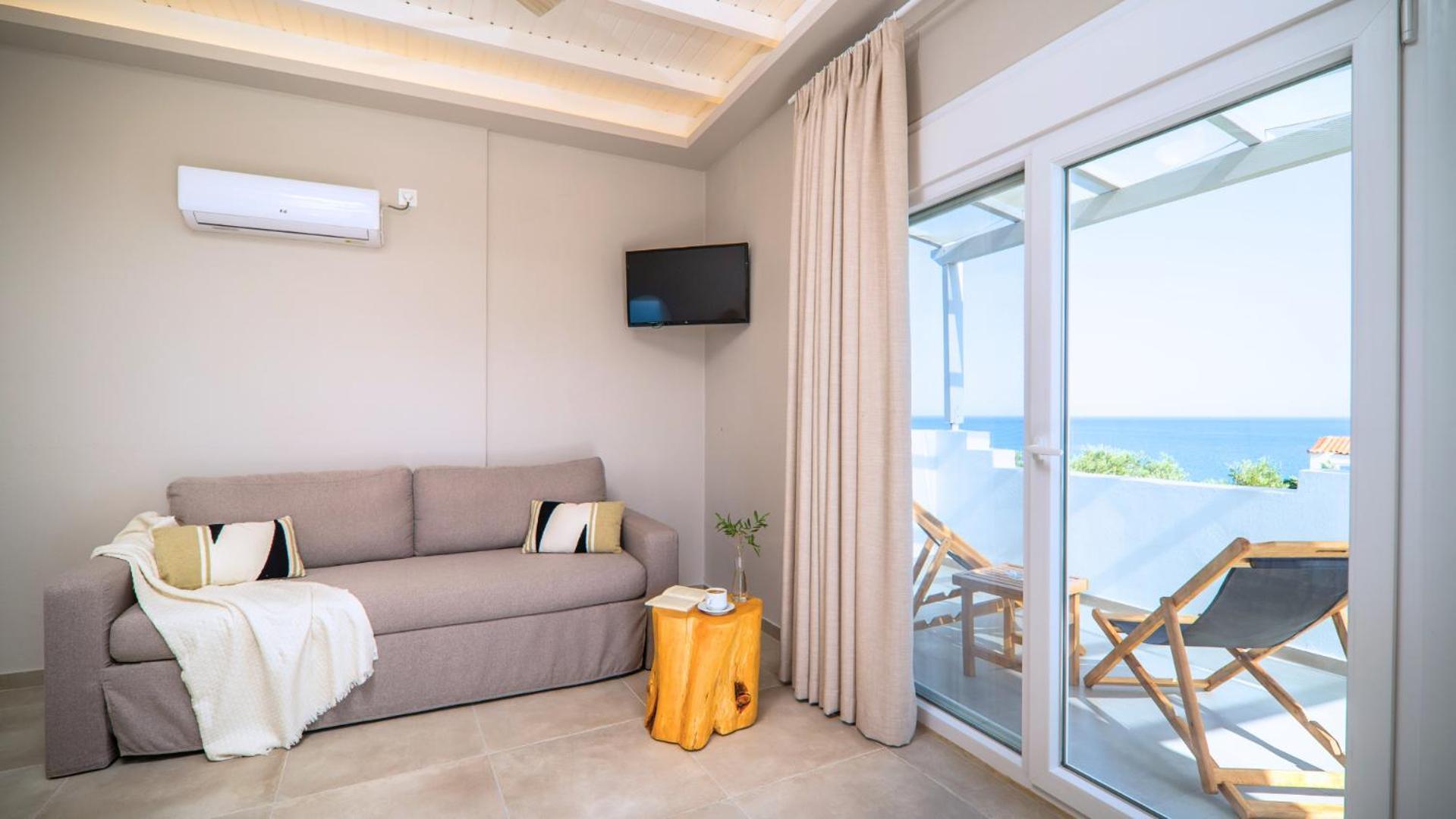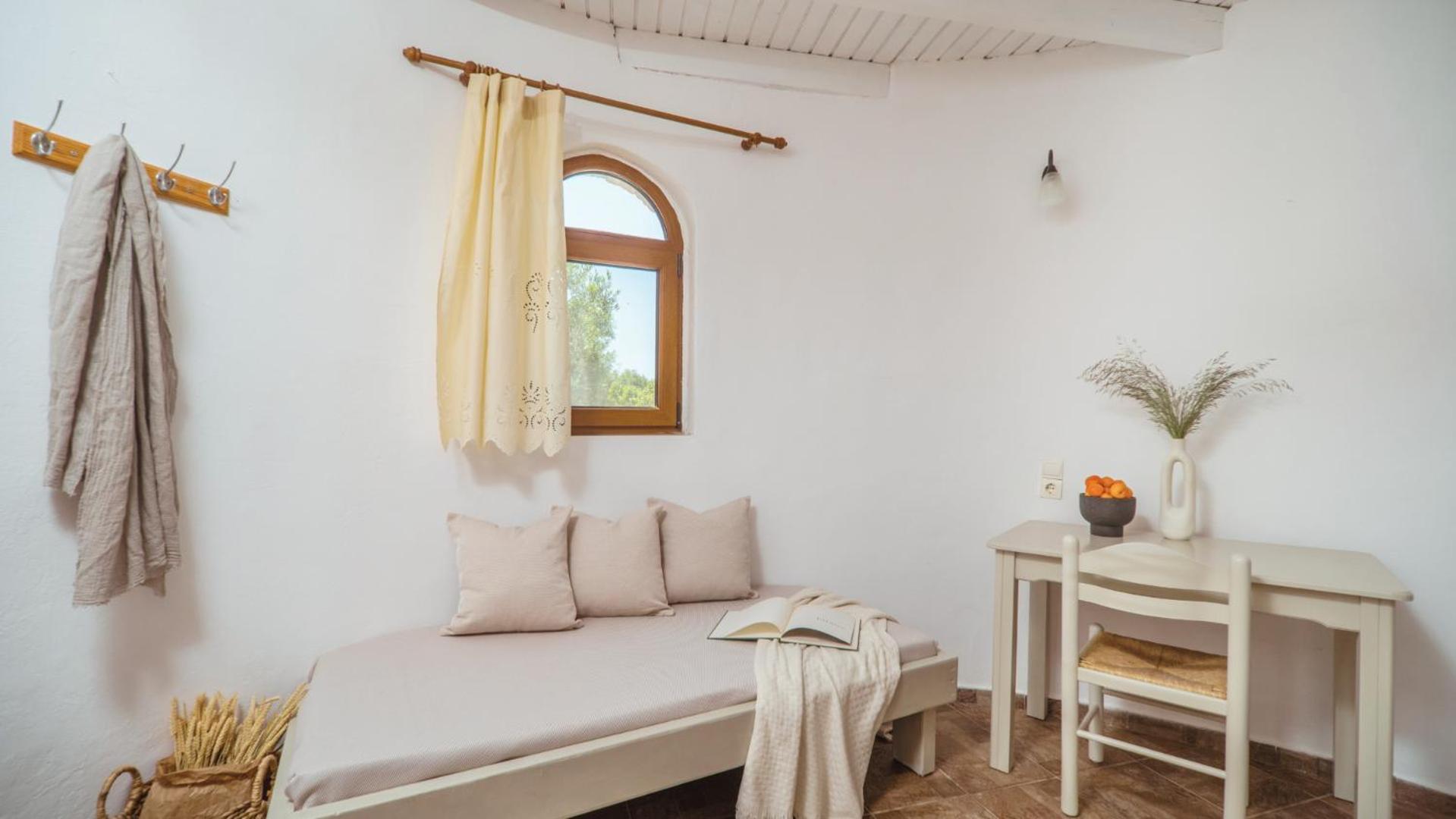 The position is lovely, we could see the sea from our bed. The small terrace where we ate breakfast in the middle of the garden looking at the sea was lovely. The bed is new and very comfortable, the bathroom is very spacious and has enough place for toiletries. The staff was more than friendly, we got beach towels and an umbrella for free. You can have bicycles for free also. The kitchen has everything you need. We received small bottles of family made olive oil and raki. The nearby taverna is great, and the beautiful beach just in front is a blessing. There is a supermarket 2 minutes away where you can buy almost anything you need. We had a wonderful time, we look forward to going back.