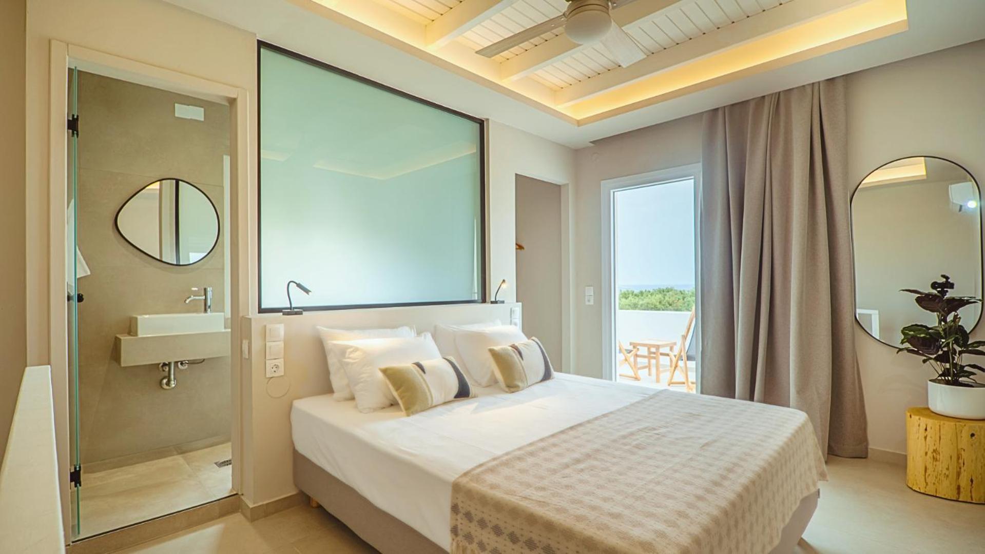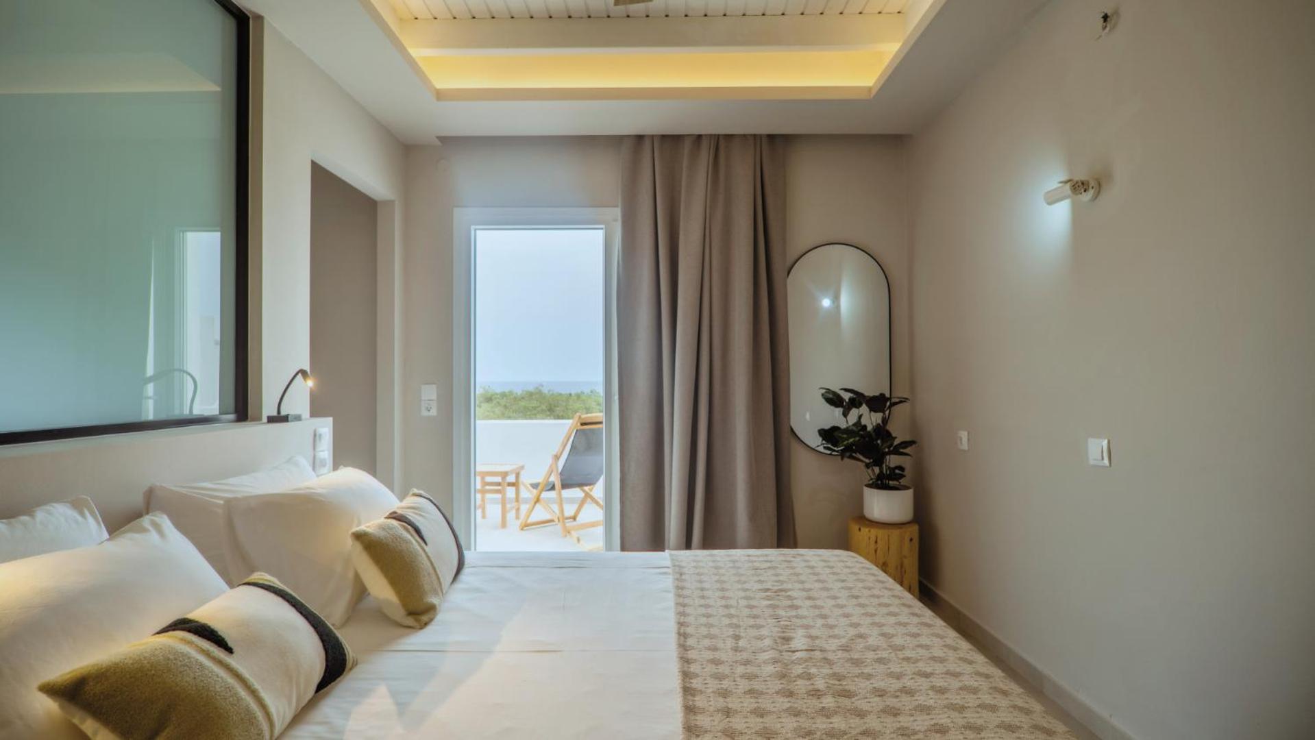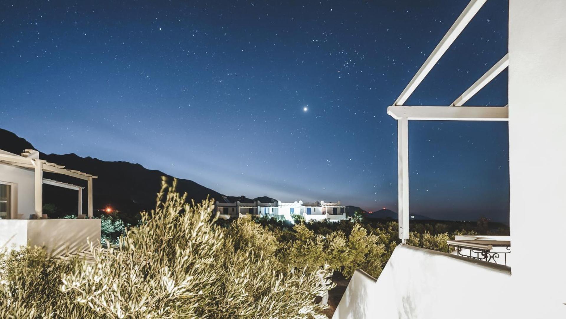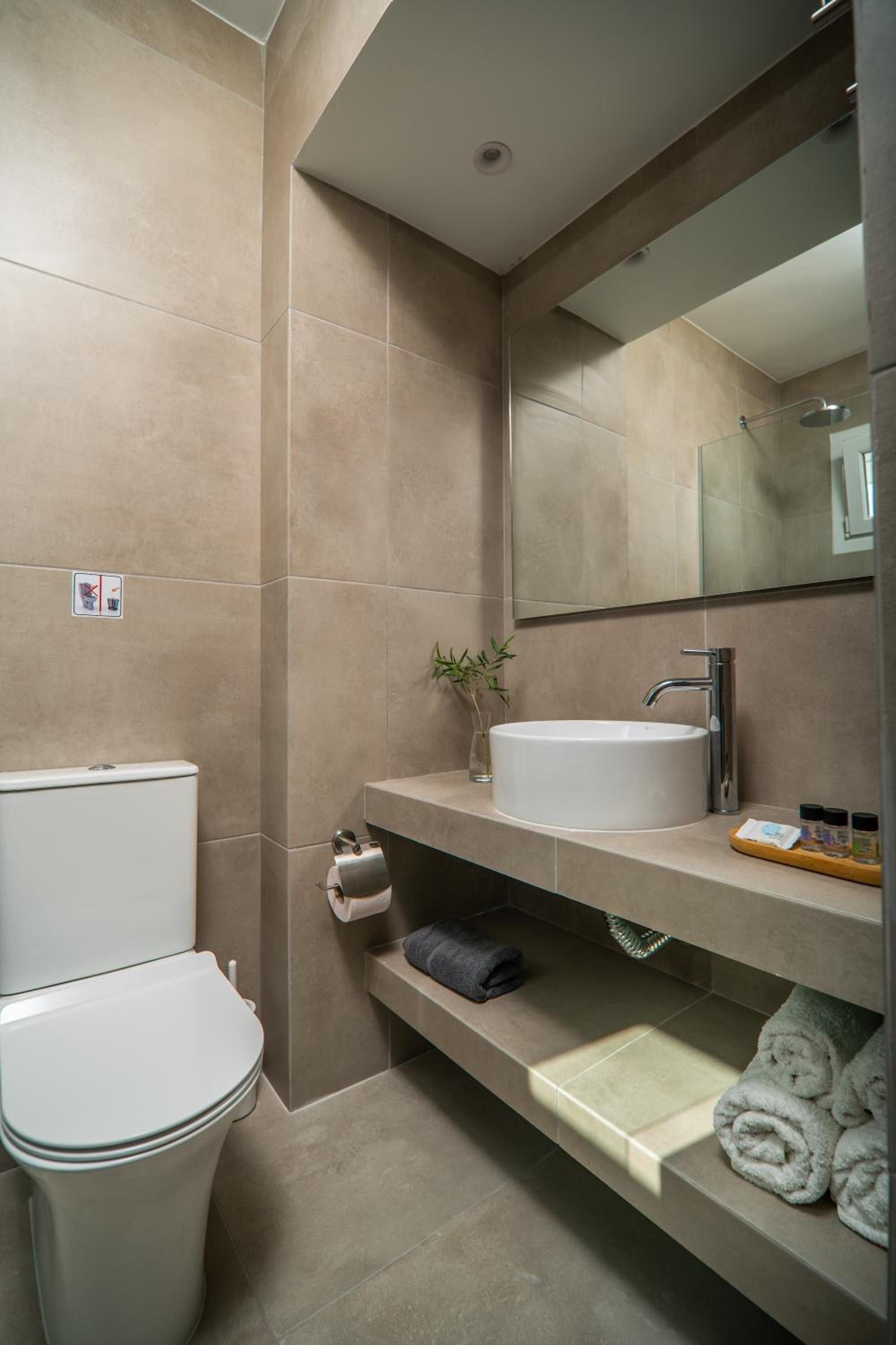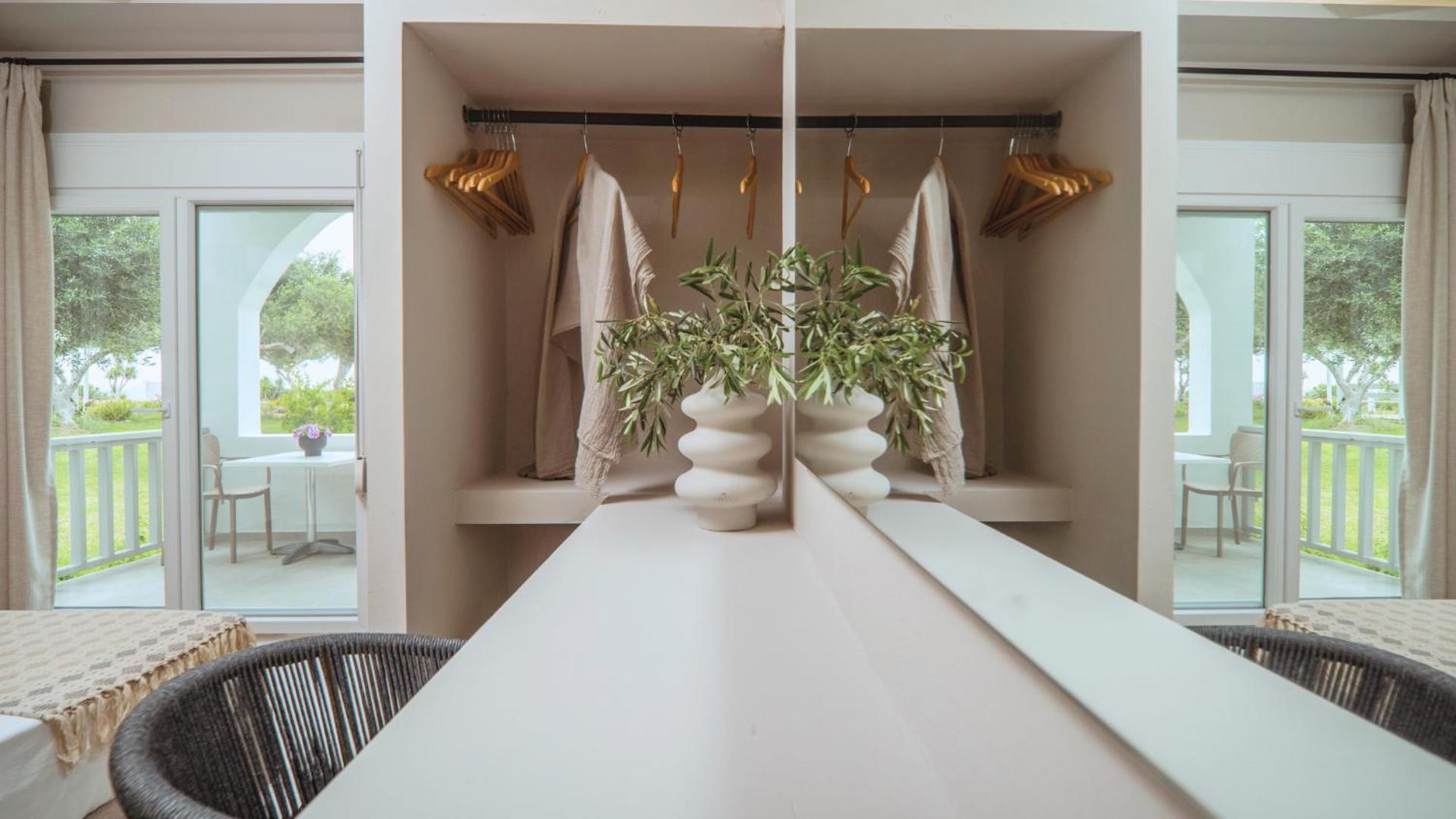 The position is lovely, we could see the sea from our bed. The small terrace where we ate breakfast in the middle of the garden looking at the sea was lovely. The bed is new and very comfortable, the bathroom is very spacious and has enough place for toiletries. The staff was more than friendly, we got beach towels and an umbrella for free. You can have bicycles for free also. The kitchen has everything you need. We received small bottles of family made olive oil and raki. The nearby taverna is great, and the beautiful beach just in front is a blessing. There is a supermarket 2 minutes away where you can buy almost anything you need. We had a wonderful time, we look forward to going back.