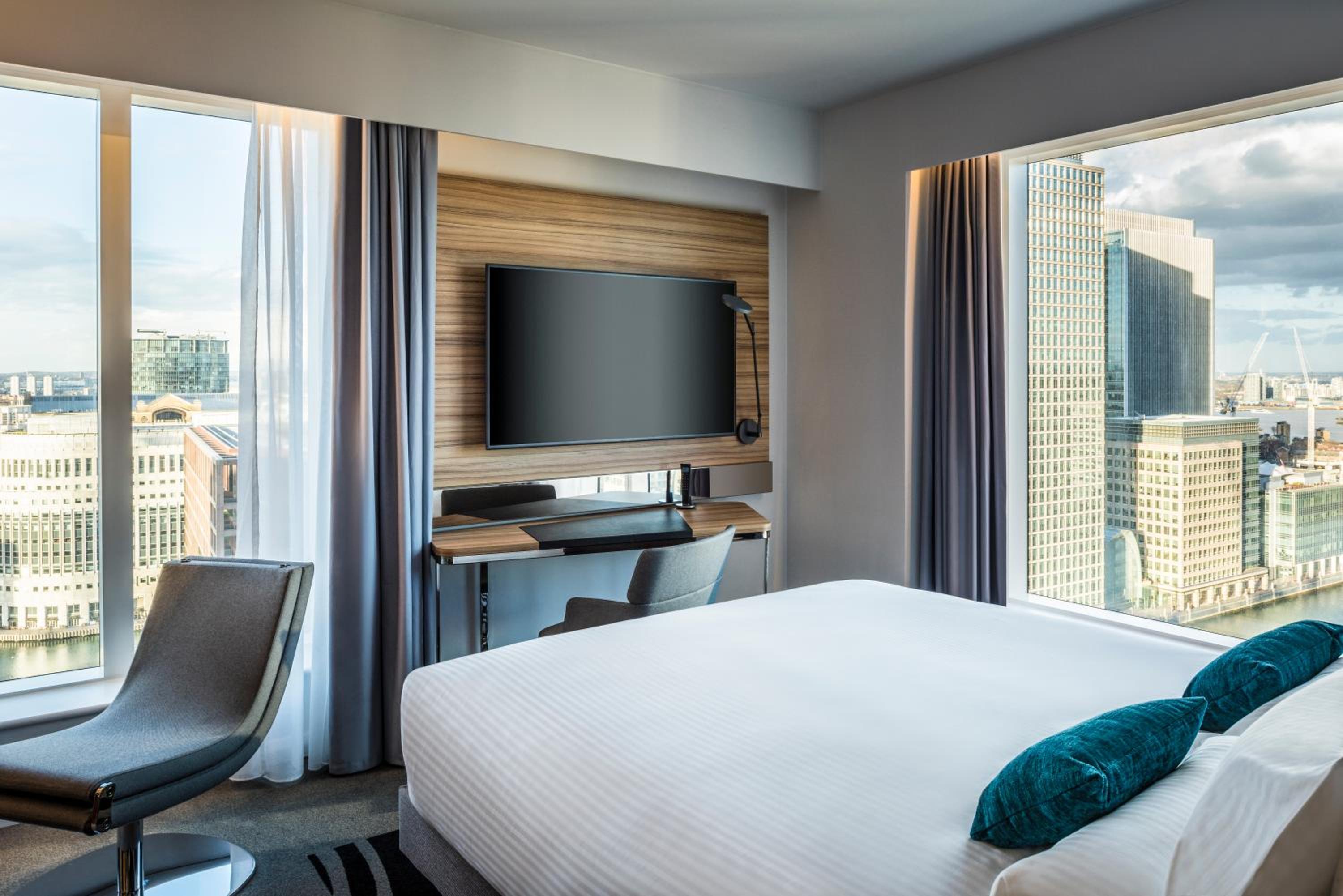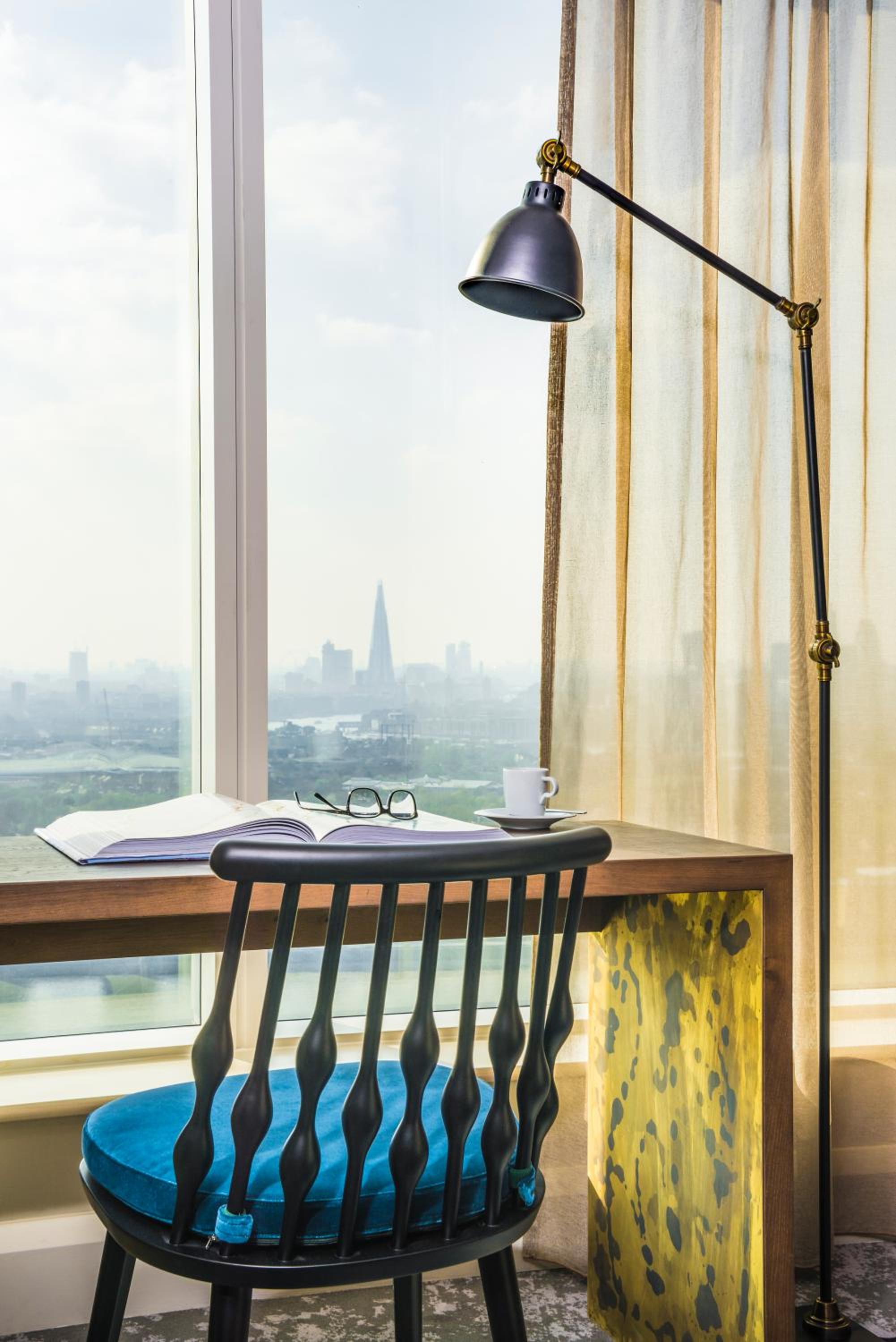 Corner room with views out to Canary Wharf. Lovely