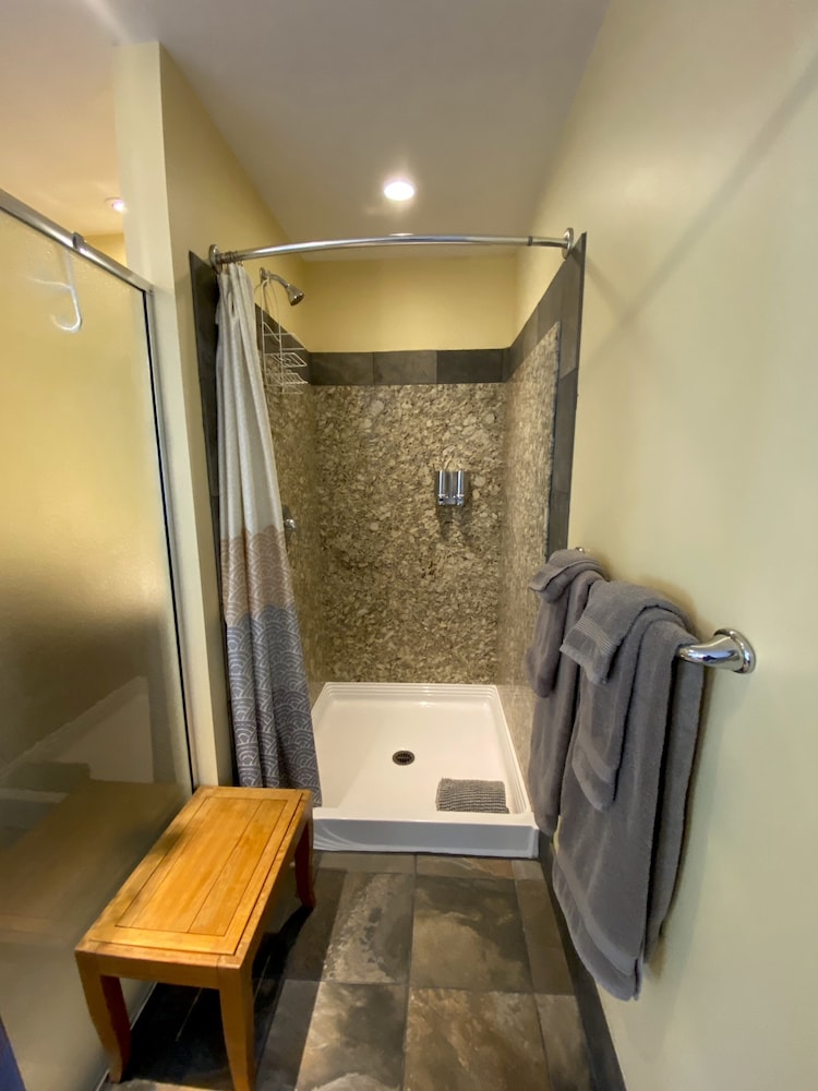 We stayed in the Queen Teepee, and it was wonderful. It was so peaceful and beautiful to fall asleep listening to the leaves rustling in the wind. The teepee is only steps away from the gorgeous pool and well-stocked shared kitchen. The washroom for the teepee is the pool washroom, and it is bright, clean, with plenty of hot water and towels.