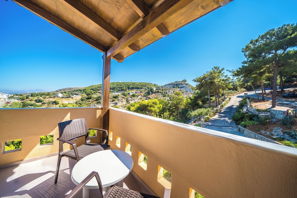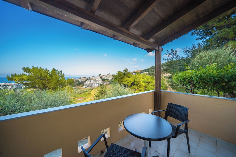 tortuous drive to hotel but worth it for the views. cool shady parking in the pine trees and a steep walk to reception. quick cheerful efficient check in with everything explained in detail and excellent English. modern lift to upper floor with sea view room giving panoramic views. adequate balcony with table & two chairs plus modern compact washing line.,big fridge, clean tidy bathroom & efficient A/C. well priced drinks and snacks at the pool with plenty of loungers. dinner buffet was exceptional but breakfast a tad disappointing. thoroughly recommended