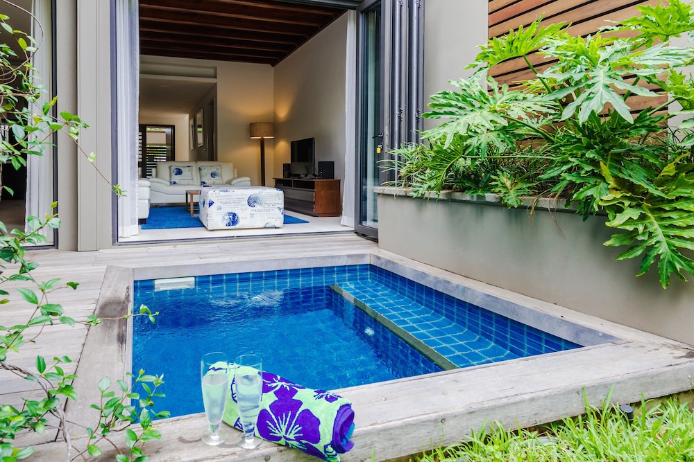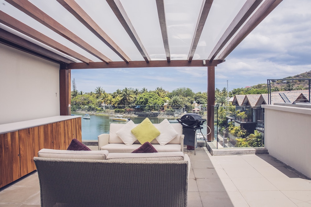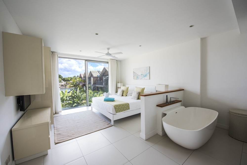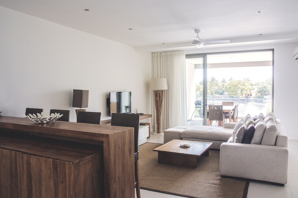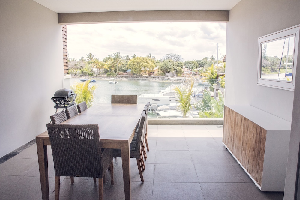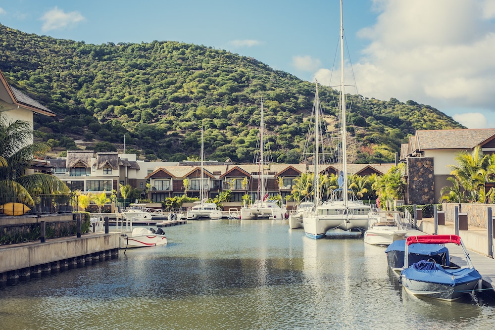 The resort is build on the only marina in mauritius. Originally build for expats as they can not own land within 100m of the beach, the resort is very new and upmarket. There is a spa, restaurant and pool and most rooms overlook the waters of the marina chanels. Exceptional fittings and luxury, the resort is close to shops and the beach is about 300m from resort. Bus service of mauritius run past front of resort. The resort concierge and horizon (administrators and agents for some of the privately owned units) arrange transport to and from airport and if you fly in late they will prestock your fridge. It's advisable to hire a small car once at the resort..units are fully equipped and each have a balcony some units or villas at the resort have a plunge pool