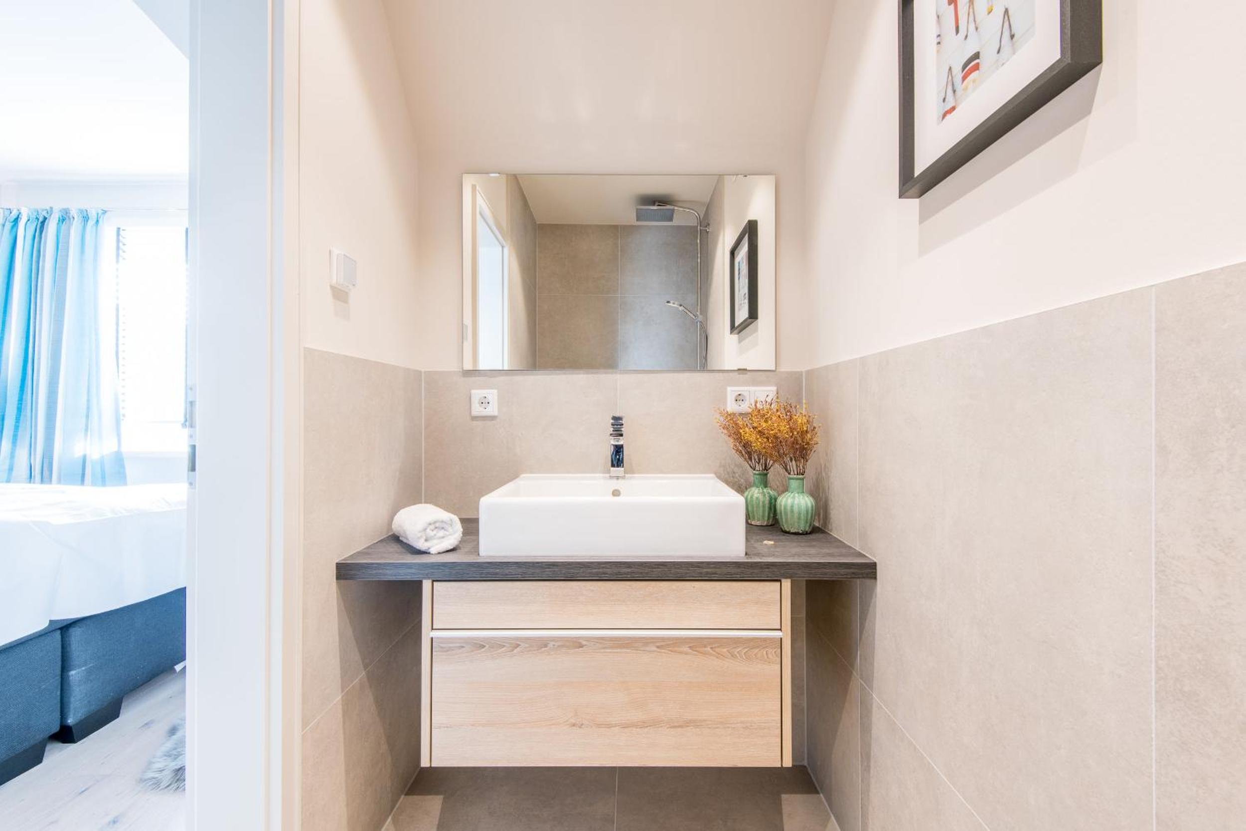 Das Zimmer war schön eingerichtet und groß. Das Bad war modern und stilvoll eingerichtet.