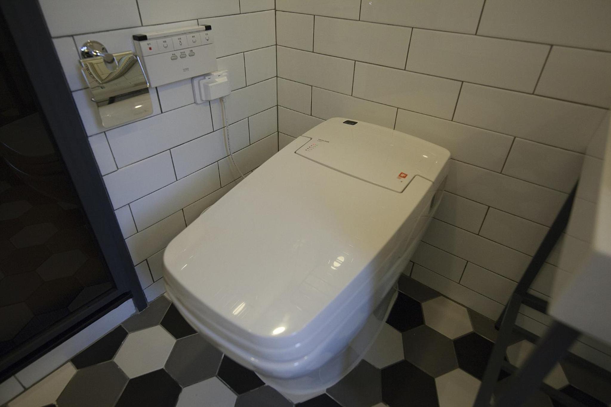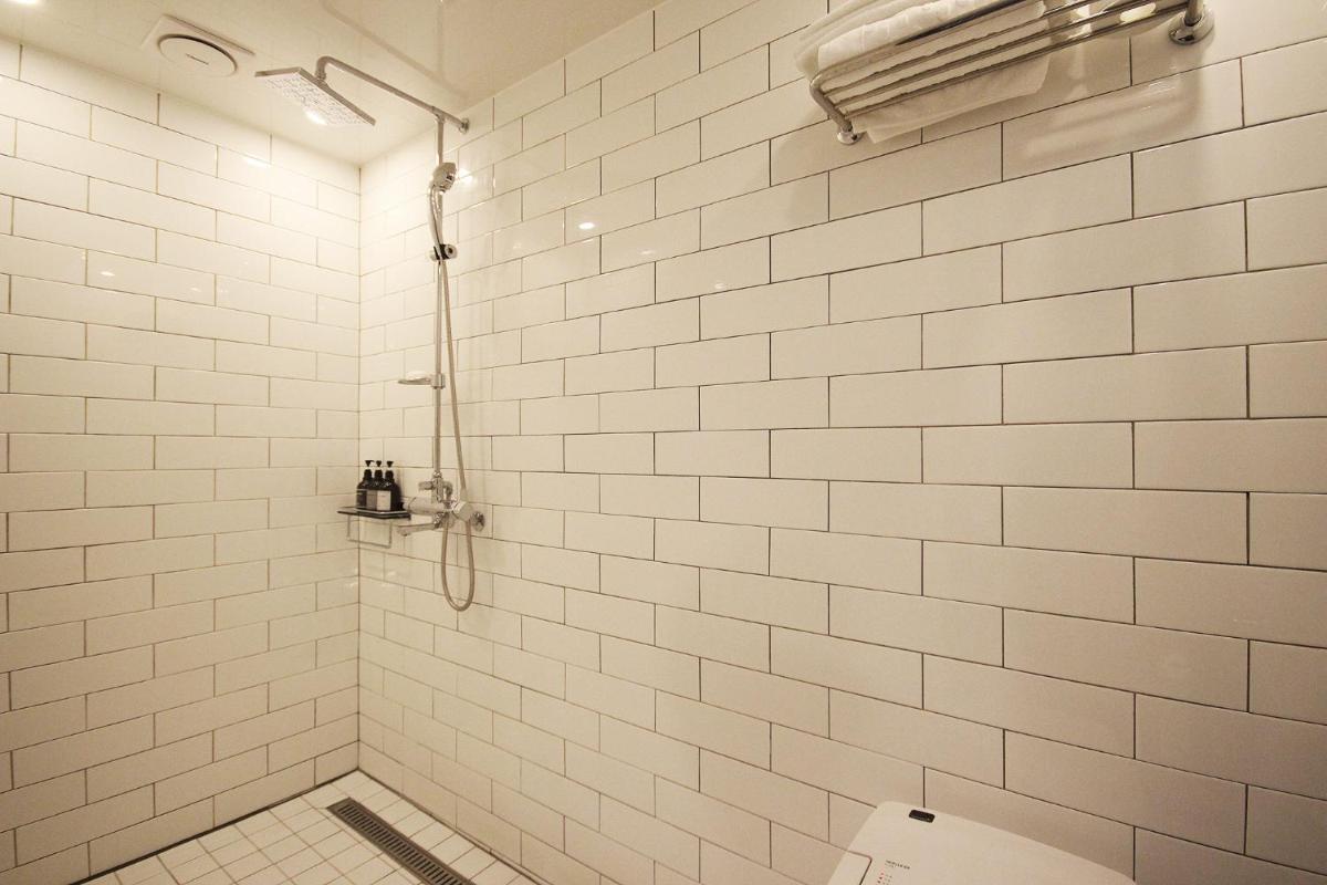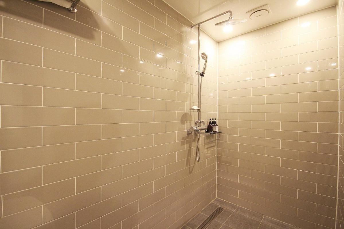 7. 전체 벽은 깔끔하게 회색으로 칠해져 있지만, 화장실 문을 열면 바로 앞에 벽돌 모양의 벽이 쌩뚱맞게 있습니다. 이 벽의 울퉁불퉁한 표면에는 이상한 구멍들이 있어 누군가 휴지를 말아 막아놓은 것 같이 보였습니다. 처음엔 누가 코 같은 것을 파고 휴지를 꽂아 놓았나 하는 생각이 들었음. 화장실 앞의 벽이 찜찜한 느낌을 주니, 샤워 후 샤워실 안에서 옷을 입고 나오는 것이 좋을 것 같습니다.