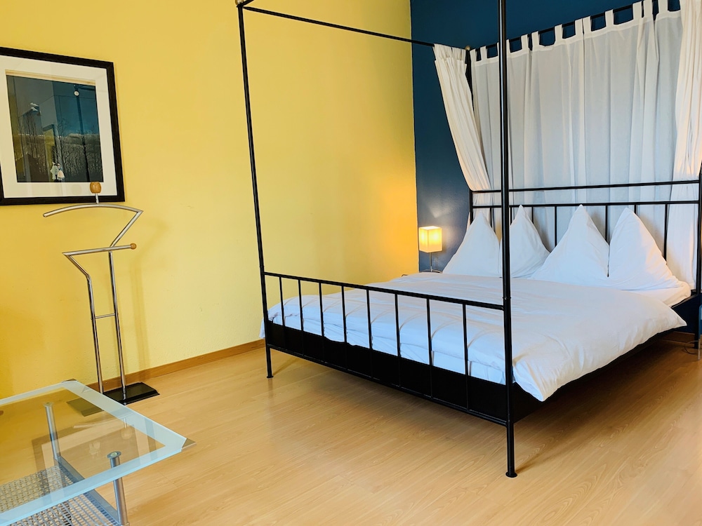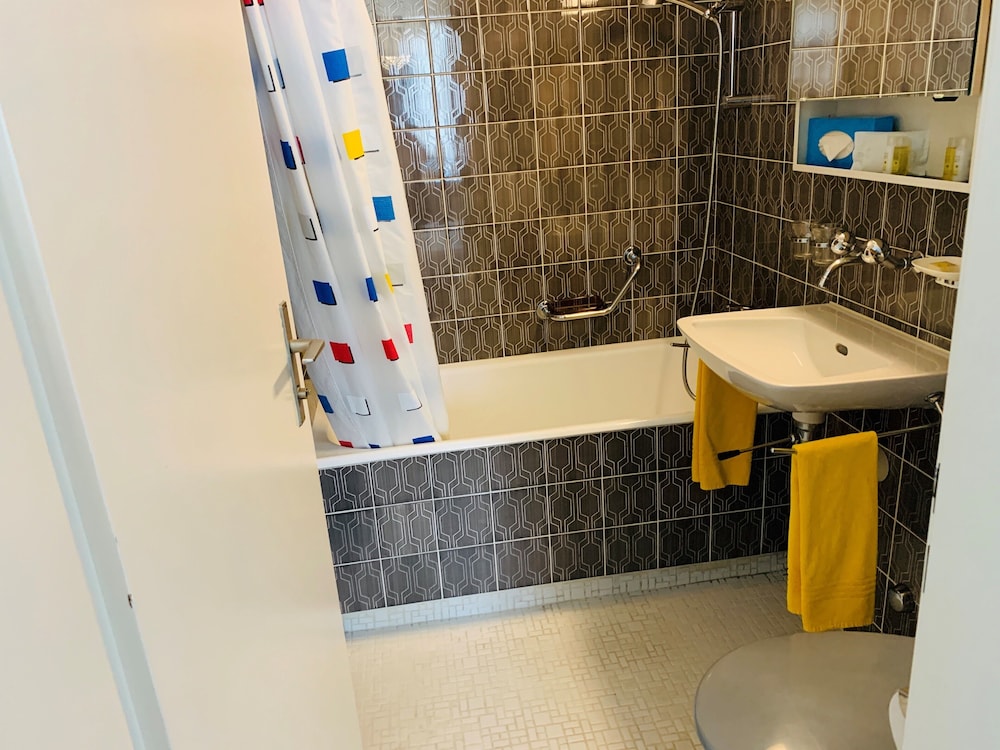 他の方も指摘していますが、チェックインは近くにあるホテル ルツェルナーホフでします。そこでチェックインしたら従業員がアパルトマンに連れて行ってくれます。地図の場所に自分で行っても入れません。このシステムがわからなくて、一時間くらい迷ってしまいました。場所は、非常によいところです。エアコンはないけど、扇風機は置いてありました。冷蔵庫や食器類はあります。スーパーも近くて便利。
