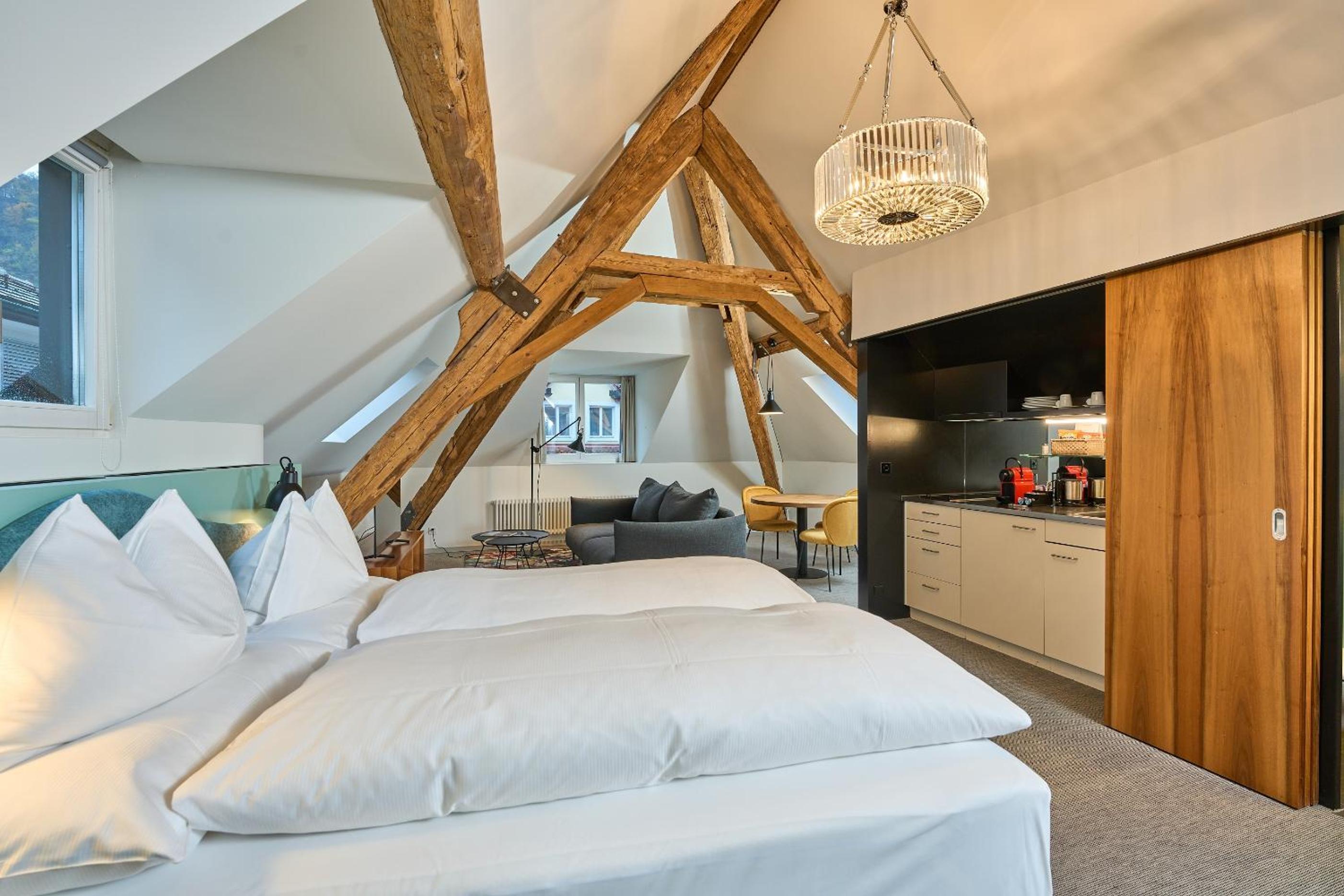 The Limmathof Baden Hotel & Spa offers stylish rooms with modern spa facilities, including a thermal pool, sauna, and state-of-the-art gym. Each room is equipped with upscale amenities such as a Nespresso coffee machine and soft bathrobes, ensuring a comfortable stay.