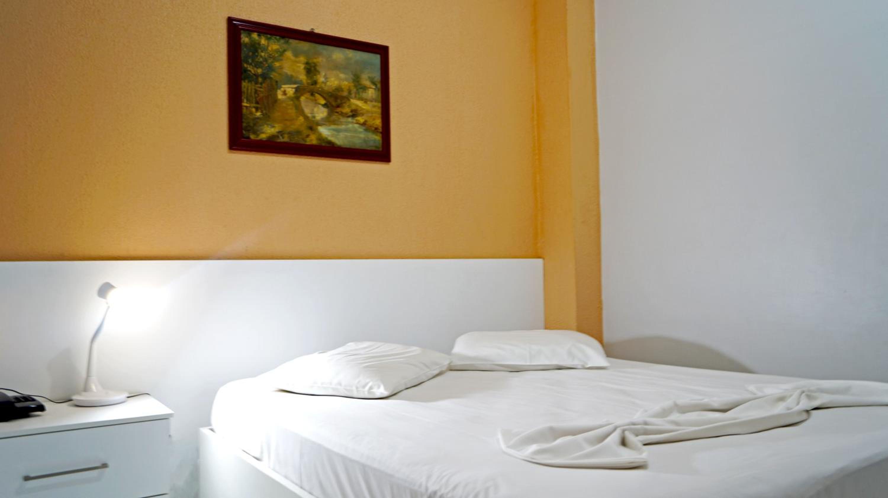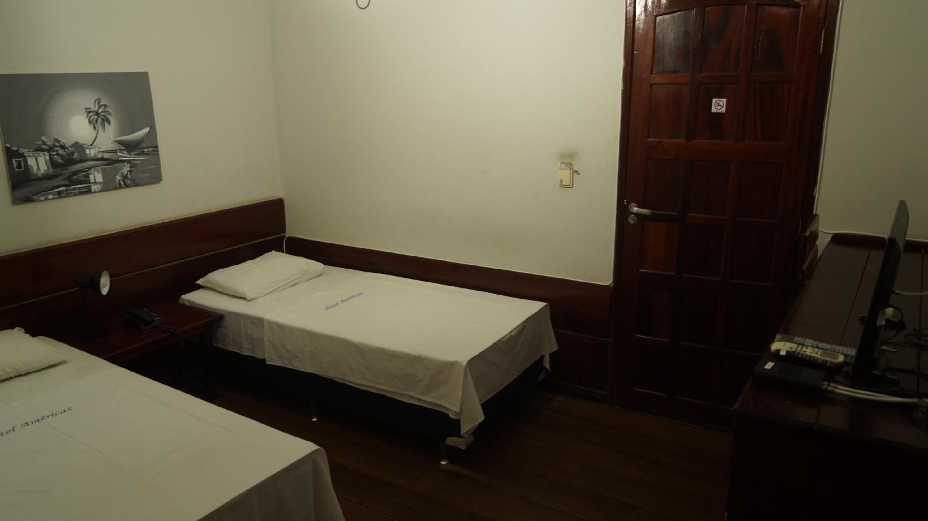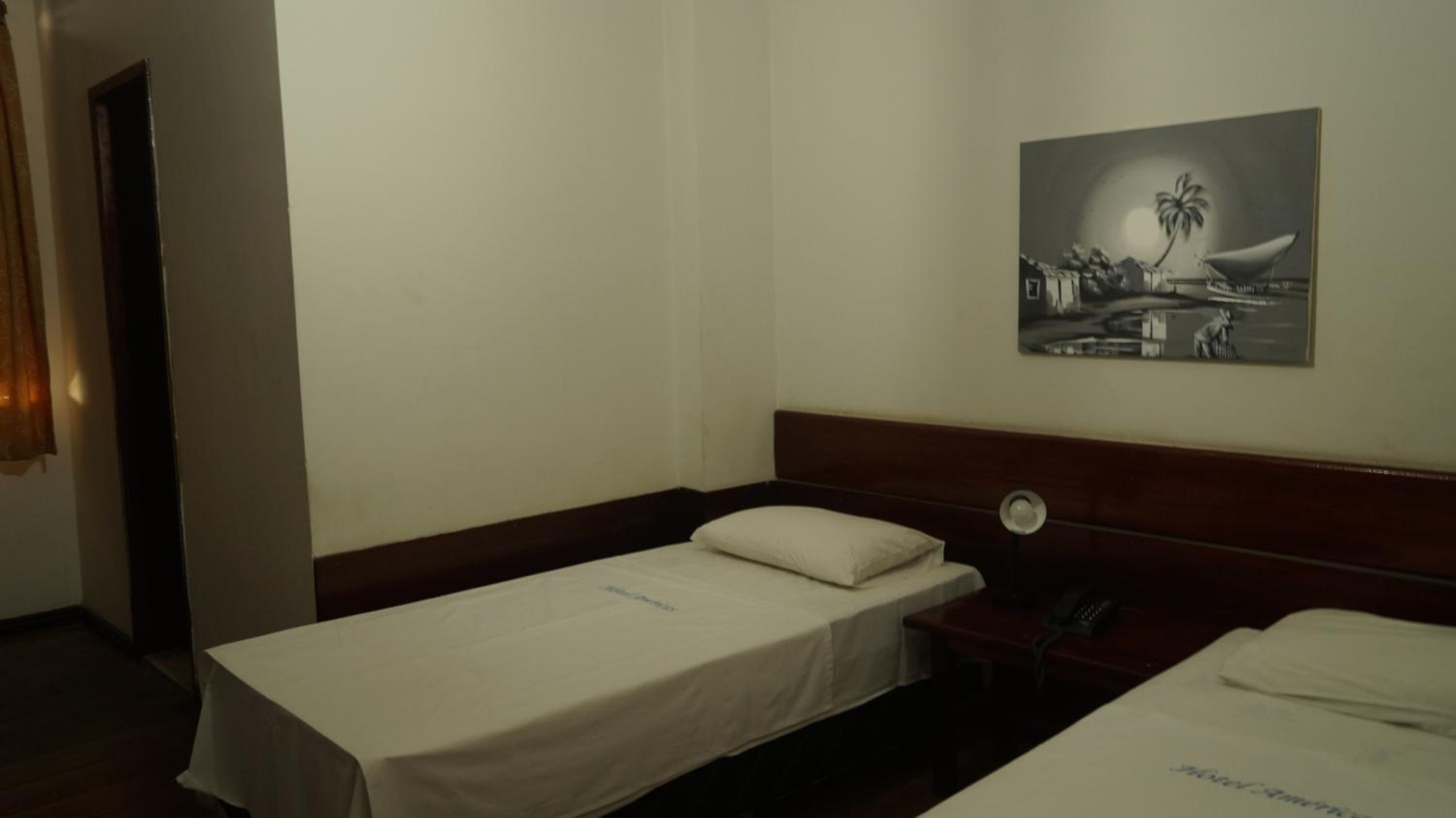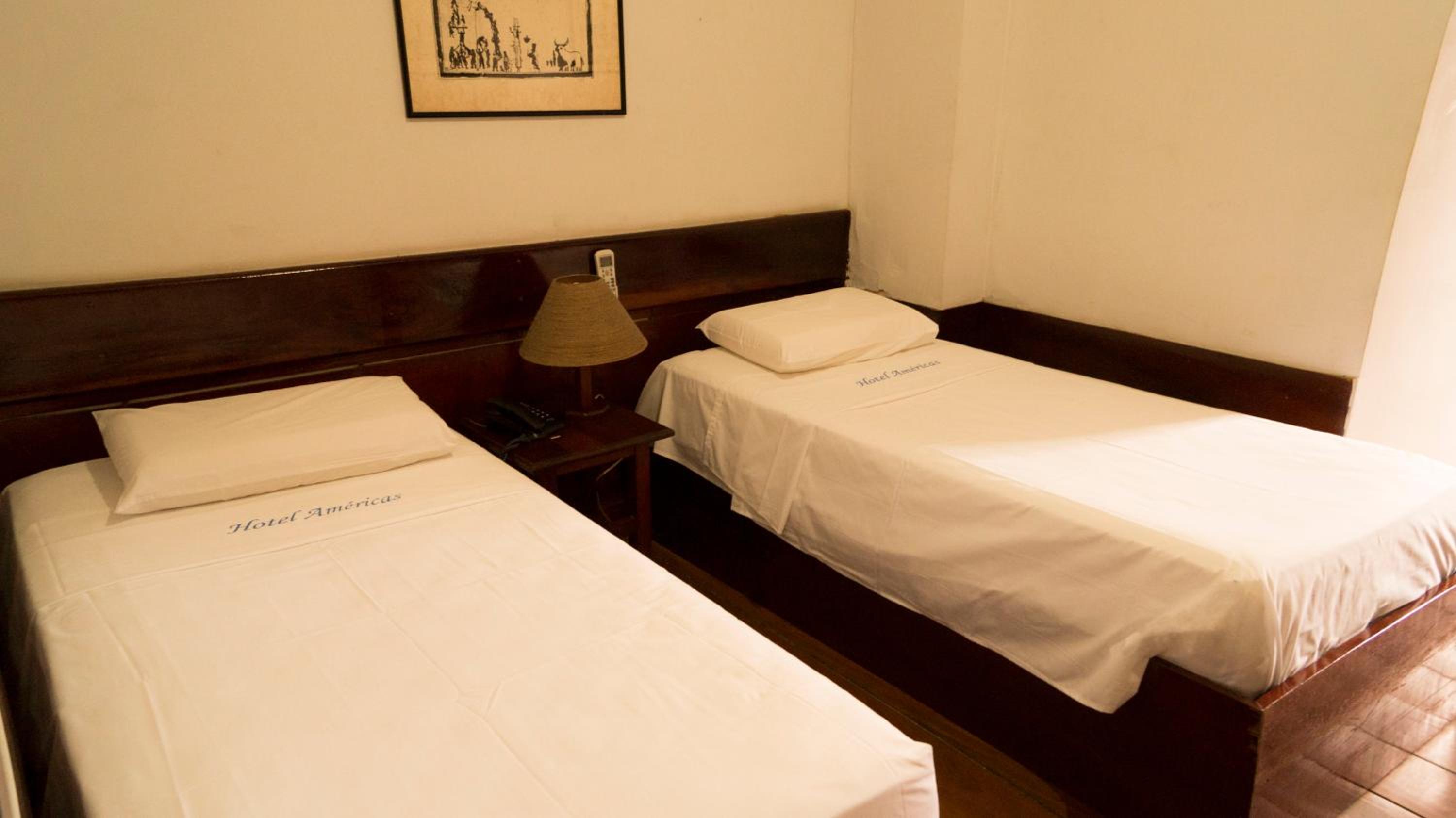 The air-conditioned rooms at Hotel Américas come with a minibar, TV, and safety deposit box, ensuring a comfortable stay for guests. The wooden floors add a touch of warmth to the practical room design.