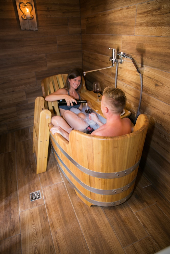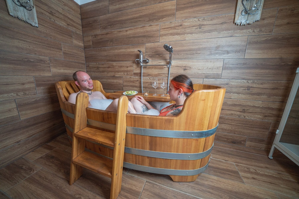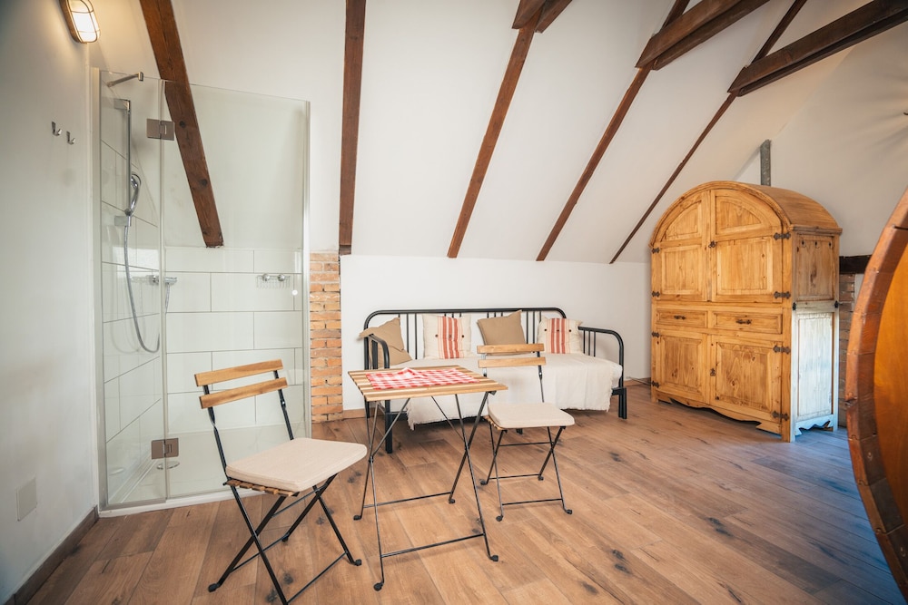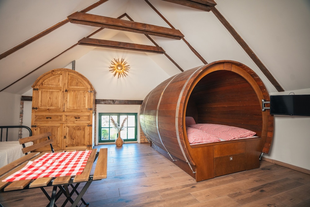 Gastronomie montags nicht offen und in der Umgebung gibt’s wenig Möglichkeiten. Zimmer/Bett in Weinfassform originell, aber sehr klein. Zwei Zimmer im oberen Teil nur über Glasscheibe getrennt. Da stört die Lampe vom Nachbarzimmer und die Schallisolierung ist schlecht. Keine Möglichkeit, Koffer abzulegen und Handtücher aufzuhängen.