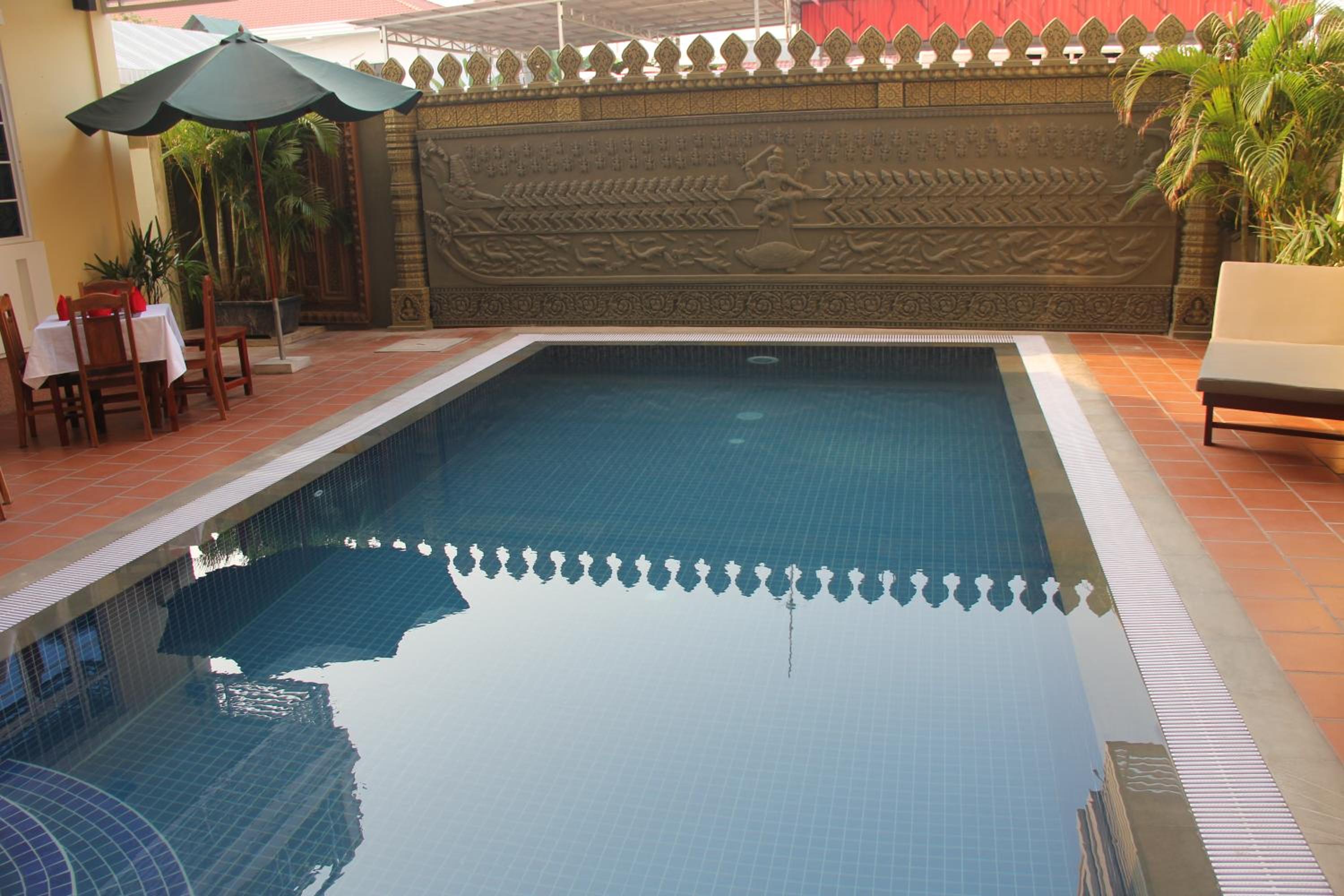 Guests can unwind by the outdoor swimming pool or on the sun terrace. The on-site restaurant serves a variety of authentic Cambodian, Asian, and International dishes, with vegetarian options available. Enjoy a refreshing drink at the bar or indulge in a relaxing massage.
