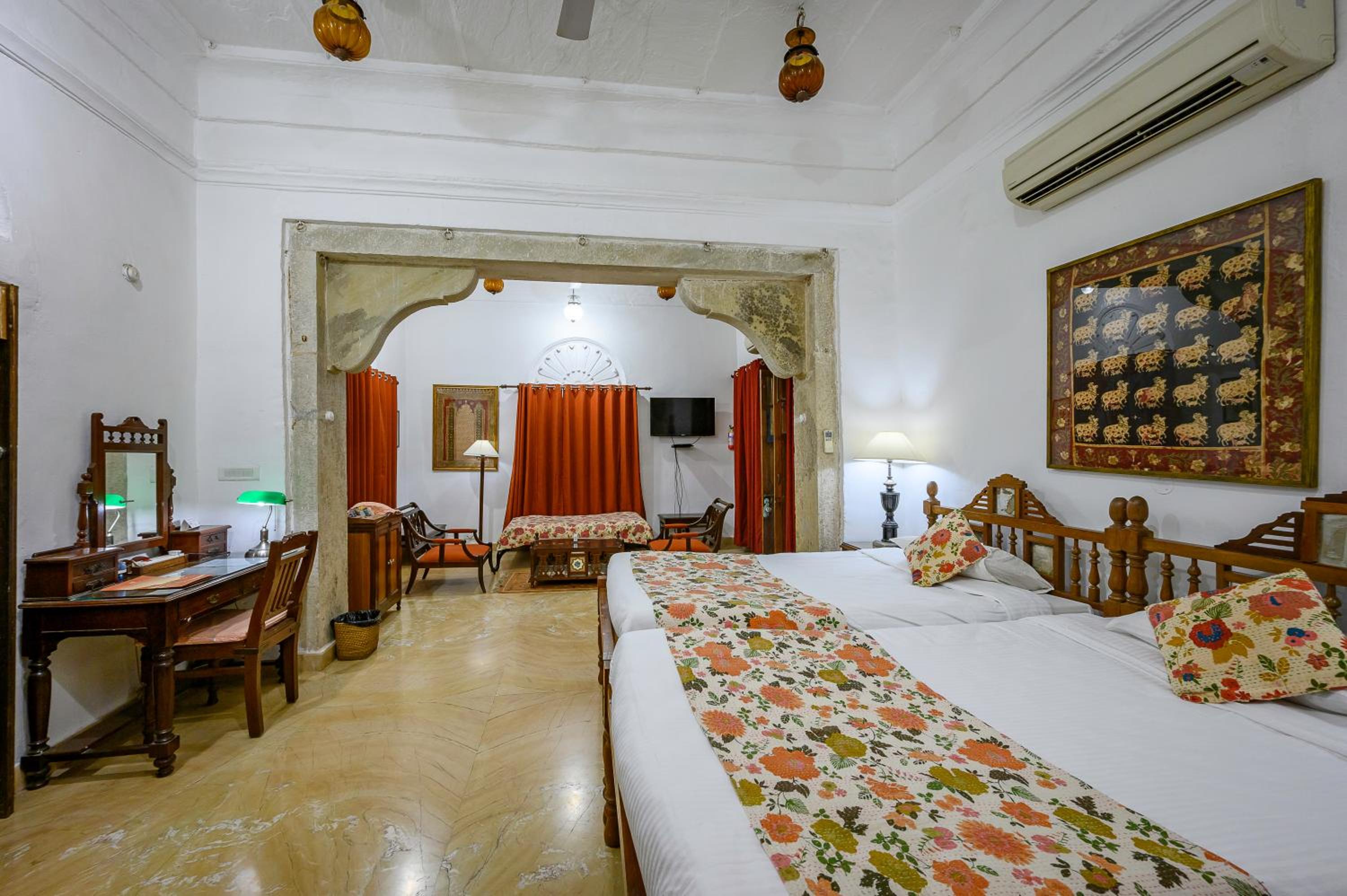 Loved everything. What a privilege to stay n such a historic location. 15c and 17c buildings situated in grand gardens below the Fort with peacocks strutting around. Included afternoon tea on the sweeping lawns a particular treat. Several magnificent private temples are in the grounds and free to visit. Food was nice. Comfortable beds. Hot water. Good help with cars and onward travel . Private terrace ...just wonderful....now planning to stay at other historic hotels in India renovated by the same company.