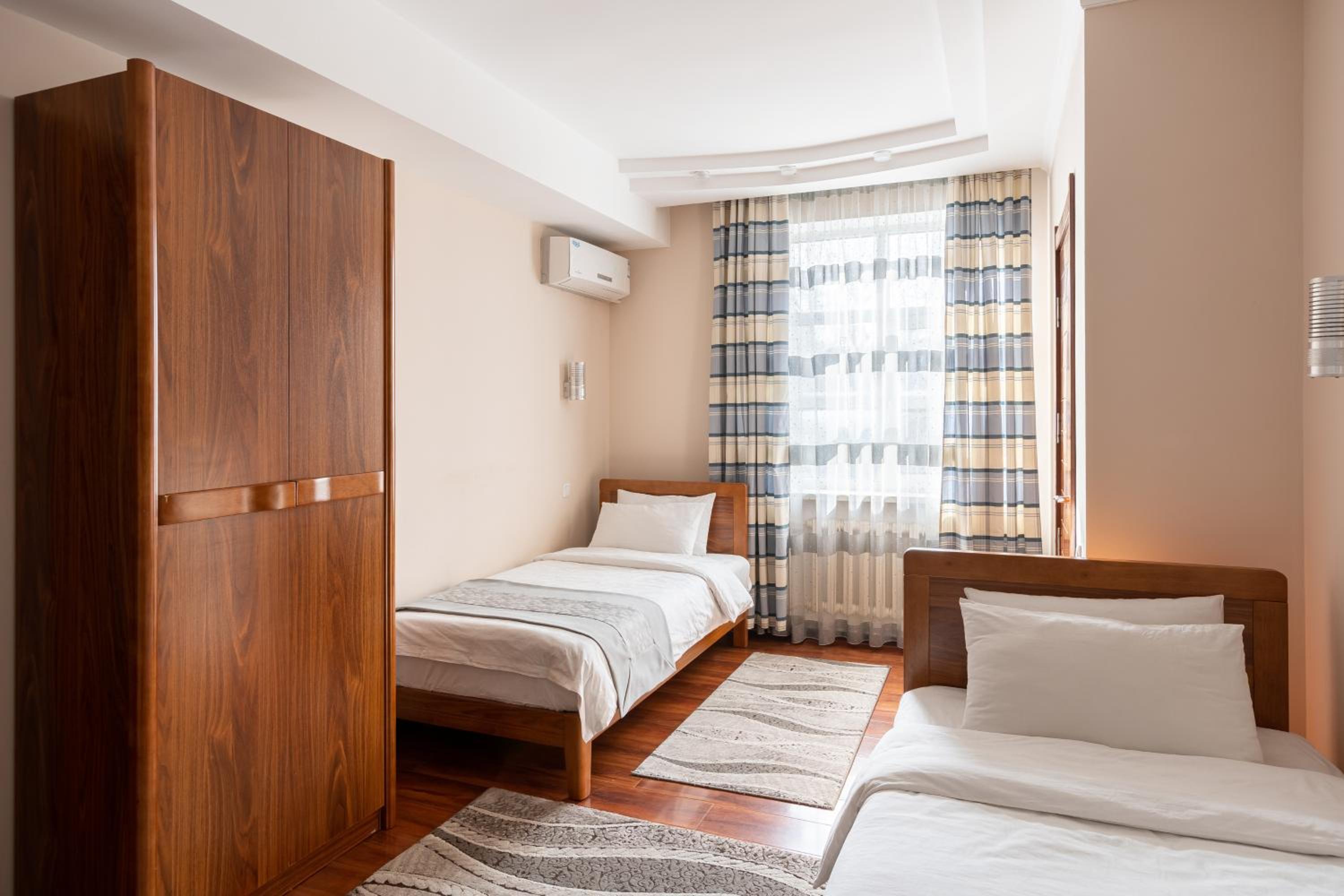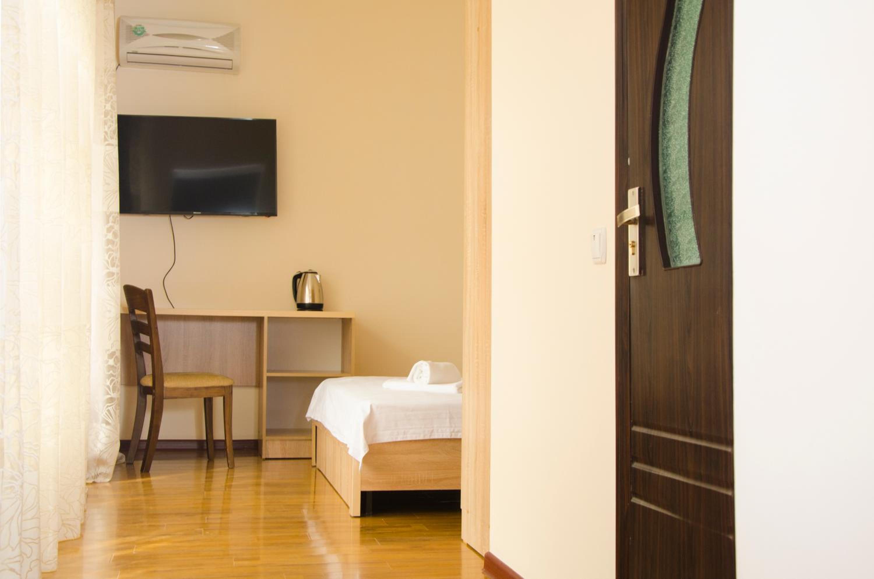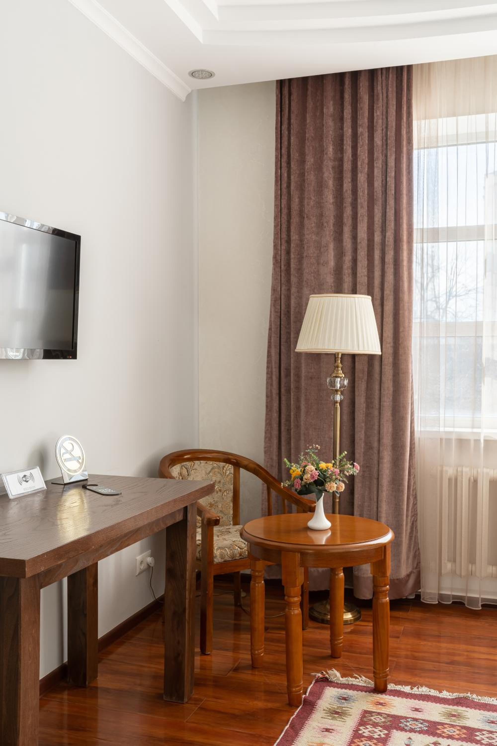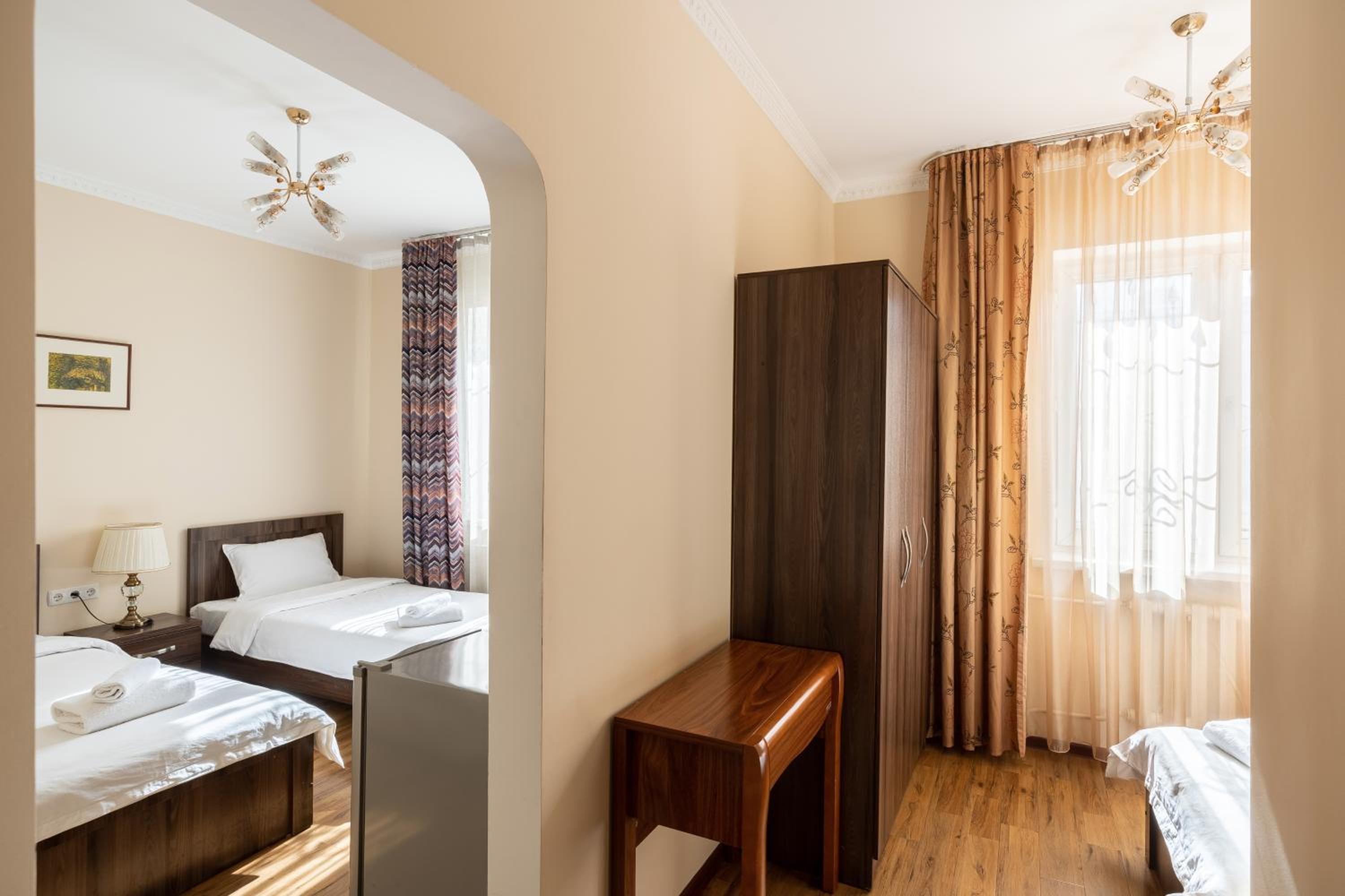We stayed in the studio, which is two generously-sized rooms overlooking a green courtyard. The bed was very comfortable and there is excellent service - a daily clean, sheets changed every three days. There is solid, good quality furniture (wardrobe, bedside lockers). The decoration resembles a high-status Soviet apartment in the 1980s, but is new. The main room has a cot as well as the advertised sofa bed. There is an excellent breakfast (you can get hot food cooked to order as well as the buffet) and there is a half-litre bottle of water daily, complimentary. There are small shops locally, the Osh Market is just 15 minutes away, and Okean, towards the Philharmonia Hall, has fresh fish. The hotel is generally extremely quiet, though we had trouble on one night with some inconsiderate guests talking loudly in the courtyard below - I had to ask them to quieten down at 1.15 a.m. and again at 3.30 a.m. (really not reasonable).