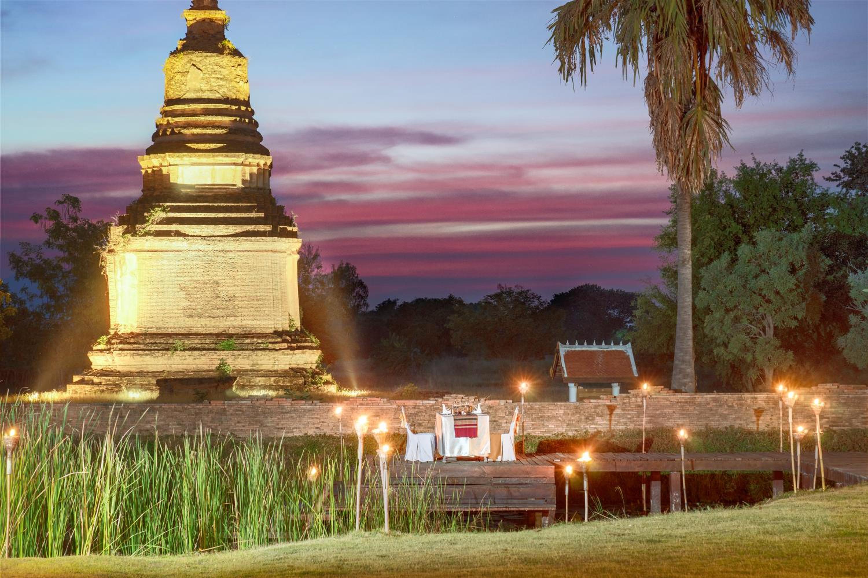 C'est bien plus beau que sur les photos du site Booking ! Une large pelouse, joliment éclairée le soir, donne sur un magnifique chedi. Notre chambre (la 702), très vaste et belle, occupait une maison ancienne, avec terrasse et vue exclusive sur un plan d'eau et ce même chedi. Spectacle merveilleux au coucher du soleil.
