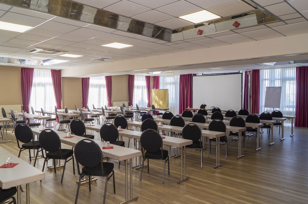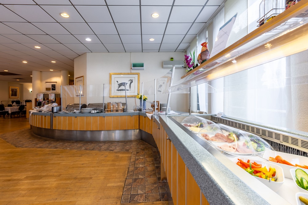 The hotel is on an industrial estate and seems popular with workers in transit. The communal areas look very smart and give off a good impression but the rooms are a different story. My room (119) was small, dark and gloomy - the walls were painted dark blue. Everything looks worn, run down and dated. The so called restaurant and bar opened at 7pm and only offers three varieties of pizza - as soon as you had eaten it was closed and you were told to sit in the lobby. Scruffy individuals were hanging around outside the entrance smoking and drinking bottles of beer. Underground car park was grim. OK for a one night stopover.