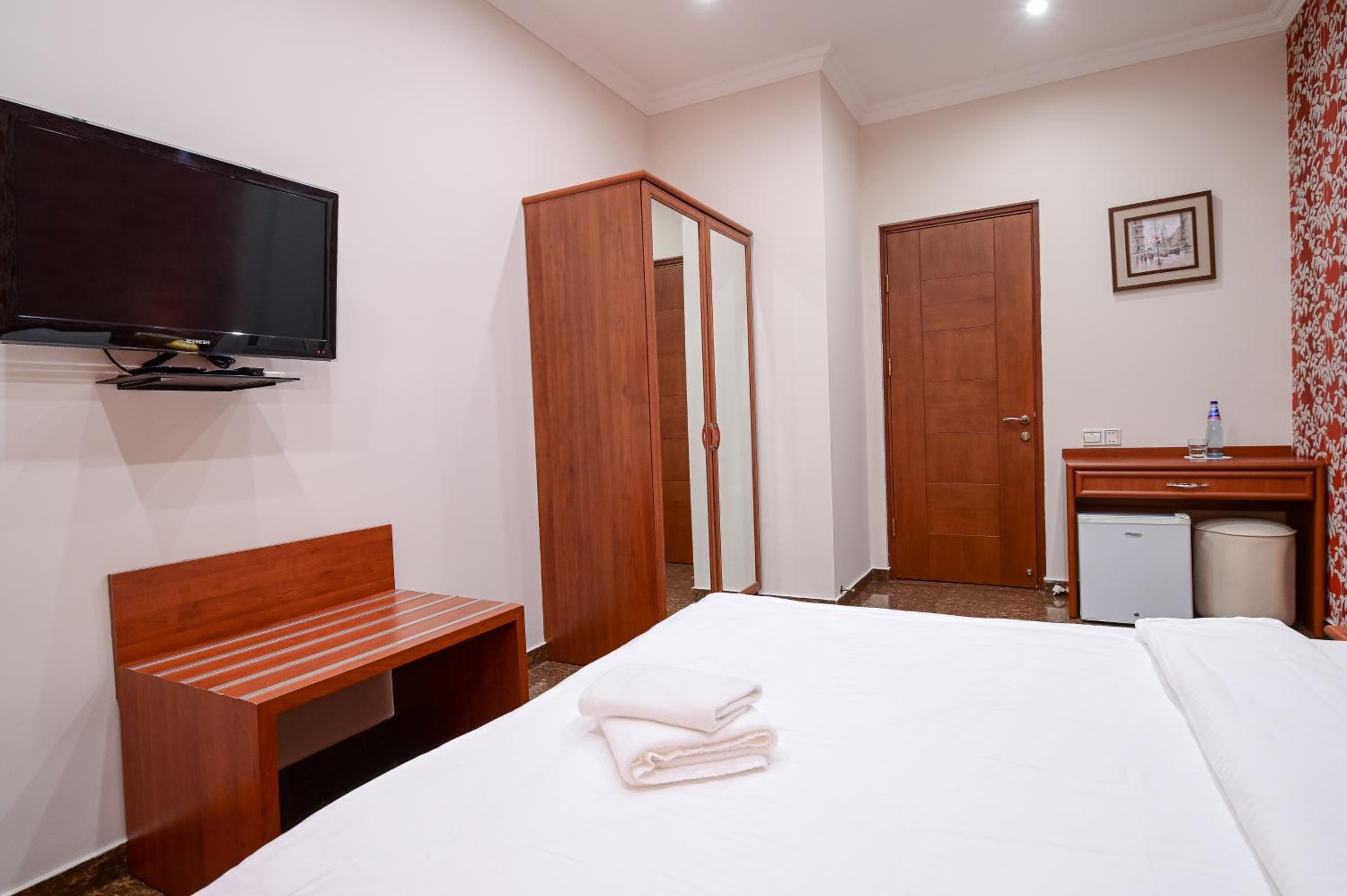 Хорошая гостиница с прекрасным расположением, основные достопримечательности в пешей доступности, даже местный рынок и Вернисаж. Доброжелательный, отзывчивый персонал. Номер брали улучшенный. Номер был не новый, но ухоженный и чистый. Удобная постель, сантехника не самая новая, но и не убитая, нет застоя воды в душевой. Есть мыло, гель для душа, шампунь, тапочки, холодильник, телевизор, фен, все рабочее. Завтраки хорошие и сытные, но однообразные. Прекрасное соотношение цены качества, все согласно оплачиваемому тарифу. Если вы из тех, кто любит заплатить копейки и получить на миллион, то вам точно не сюда.