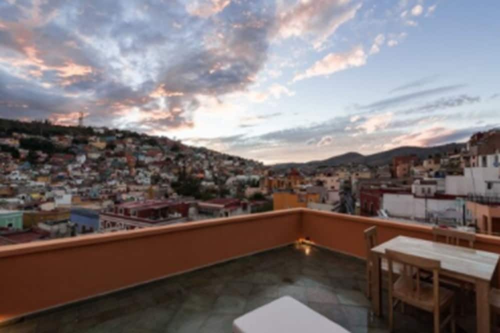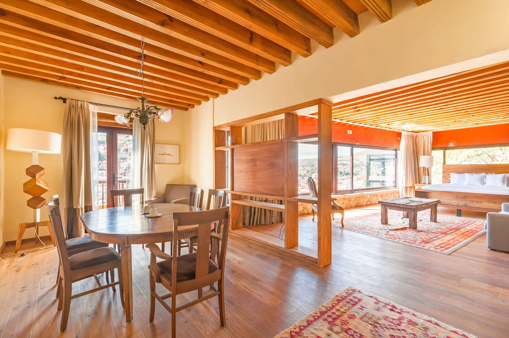We reserved the Master Suite for 3 nights at Casa Del Rector (directly through the website) and were pleasantly surprised when we checked in and walked to our room. It turned out to be the Presidential Suite, offering a stunning view of the city, the pool, and the sky bar. With over 800 square feet of space, the room was incredibly spacious. The bathroom and shower were modern—very different from the hotels we stayed at in Querétaro and San Miguel de Allende. The staff assisted in carrying our suitcases up several flights of stairs (while also utilizing the elevator) to our room on the ninth floor. This would have been quite challenging for us prior to becoming acclimated to Guanajuato's high elevation of 6,500 feet.