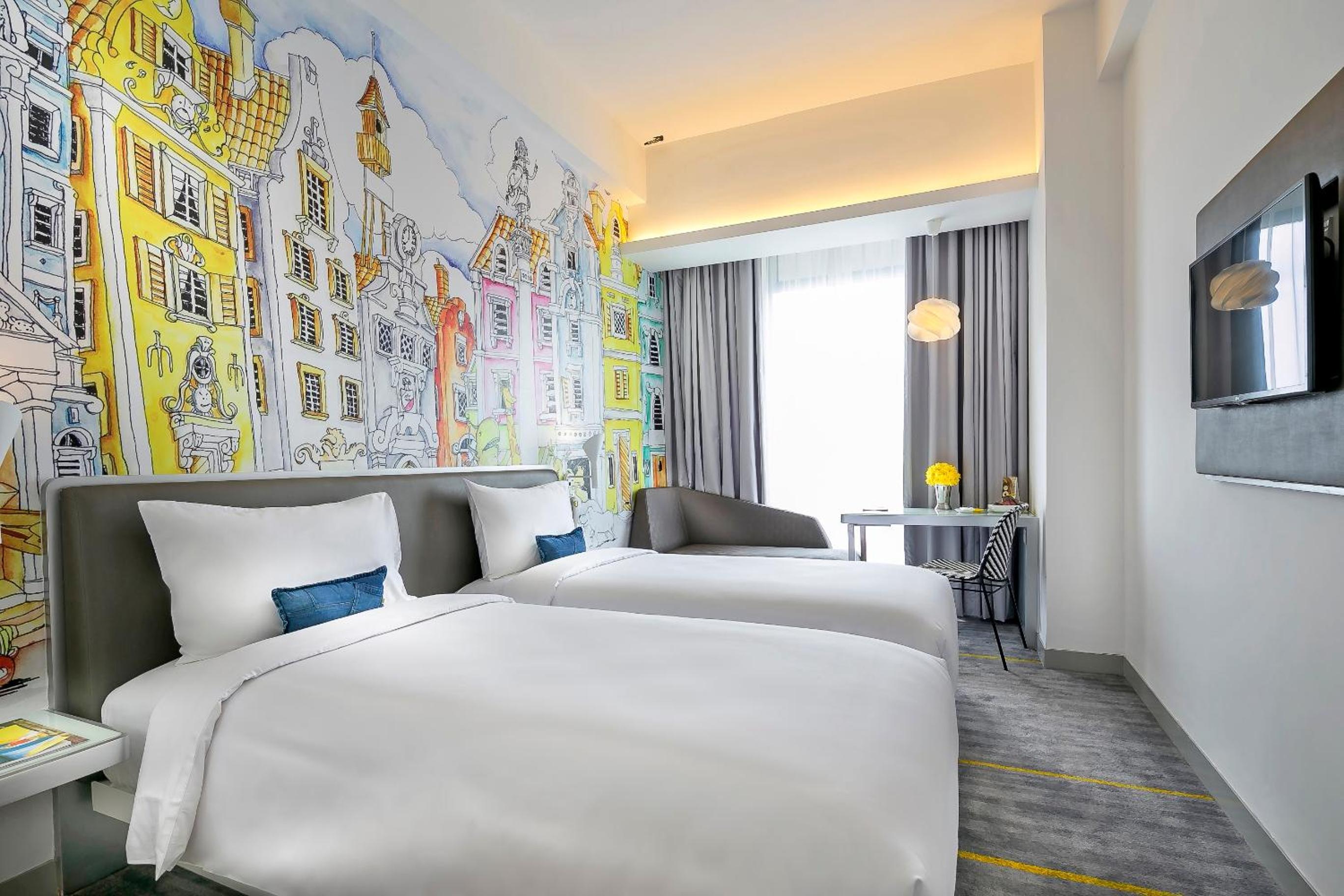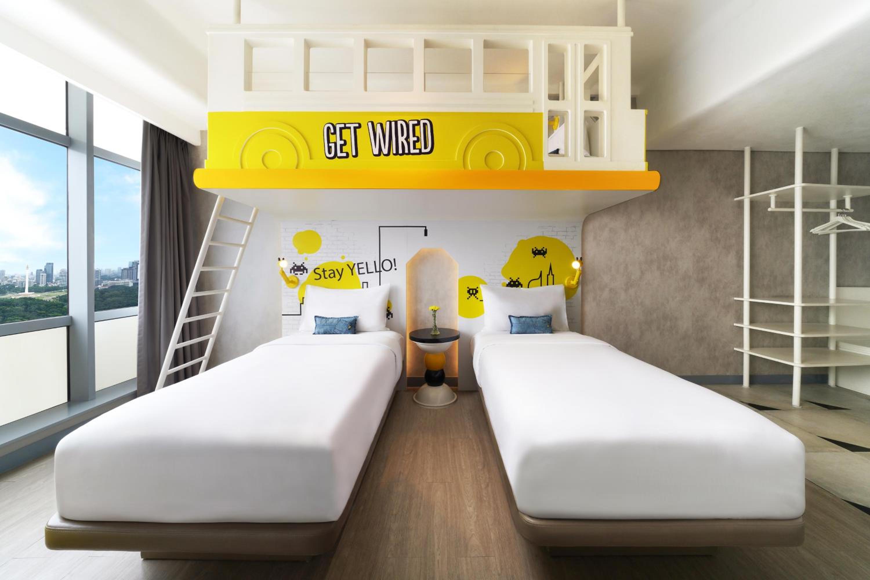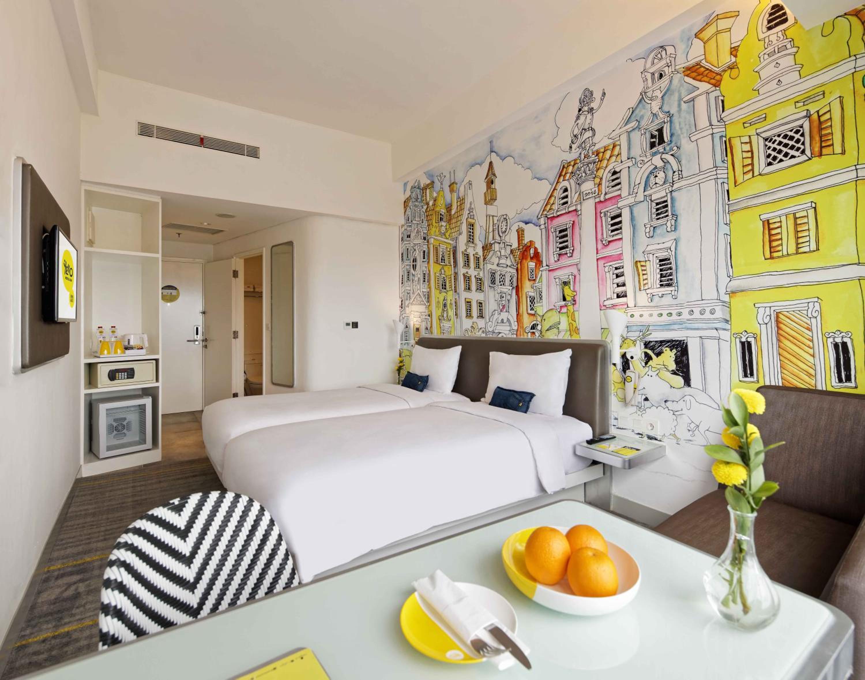 YELLO Hotel Harmoni offers a stylish stay in Hayam Wuruk, near Jakarta's main attractions. The modern rooms are adorned with bright wall art and quirky decorations, providing a unique and vibrant atmosphere for guests to enjoy.