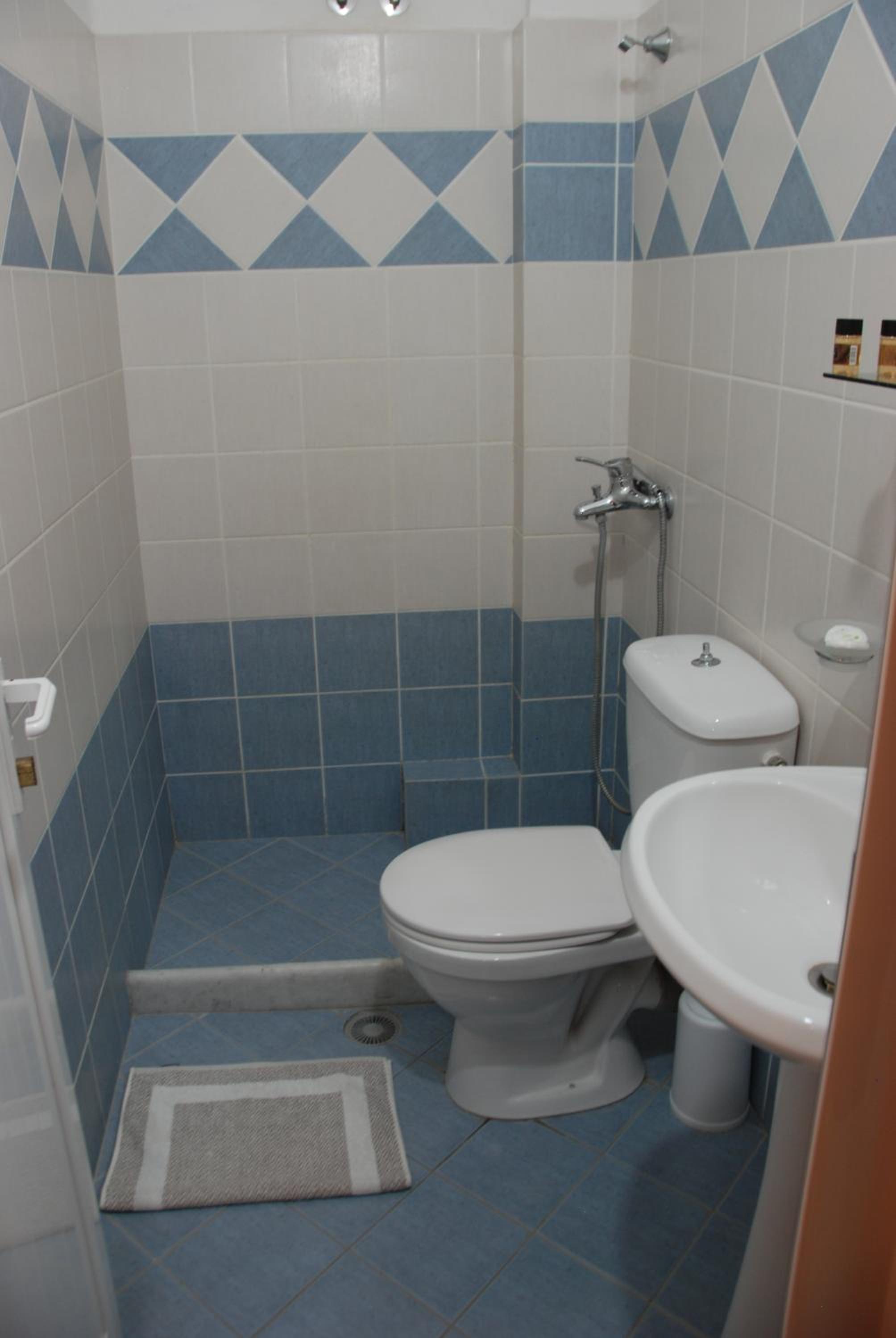 A shower curtain would have been useful, though it might have made the space feel smaller. Still, the water tended to spill out even though we were careful.