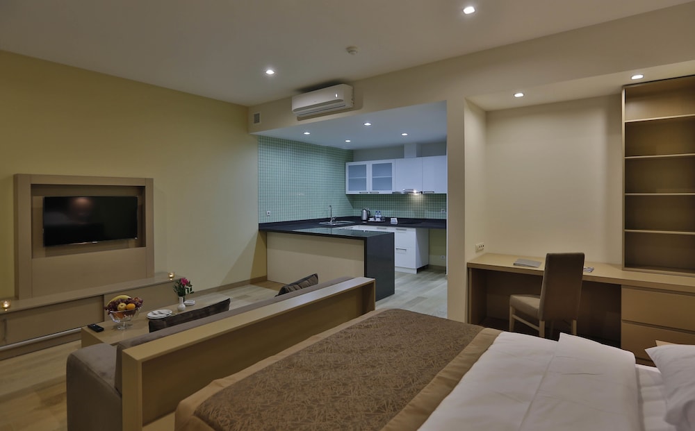 Начну с того, что заявленные двуспальная кровать "King Size" и диван-"кровать" таковыми не являются. Кровать стандартного размера, а диван не раскладной - взрослый человек на нем не сможет лежать. Сказал об этом администратору - обещали исправить описание. При заселении номер не был готов к приему троих взрослых человек, хотя бронировал заранее. Правда, достаточно быстро организовали третье спальное место - сначала матрас, а на утро и целую кровать принесли. Во всем остальном были только положительные эмоции. Персонал отличный, приветливый, доброжелательный. В апартаментах большая кухонная зона с индукционной двухкомфорочной плитой. Единственно, чего нам не хватало, так это микроволновки. Но, может, это и к лучшему, ведь от них уже начали отказываться в некоторых странах. В целом я остался доволен!