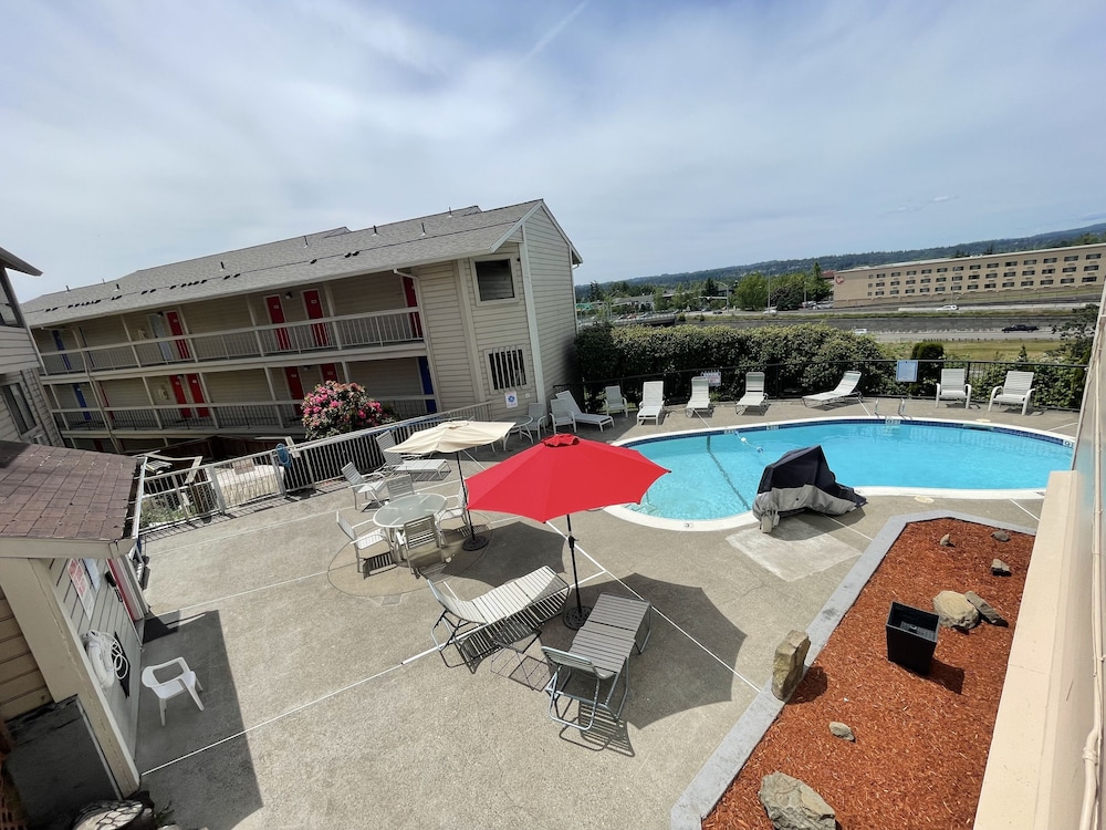 A lovely motel with a nice pool in close proximity to transport and food.