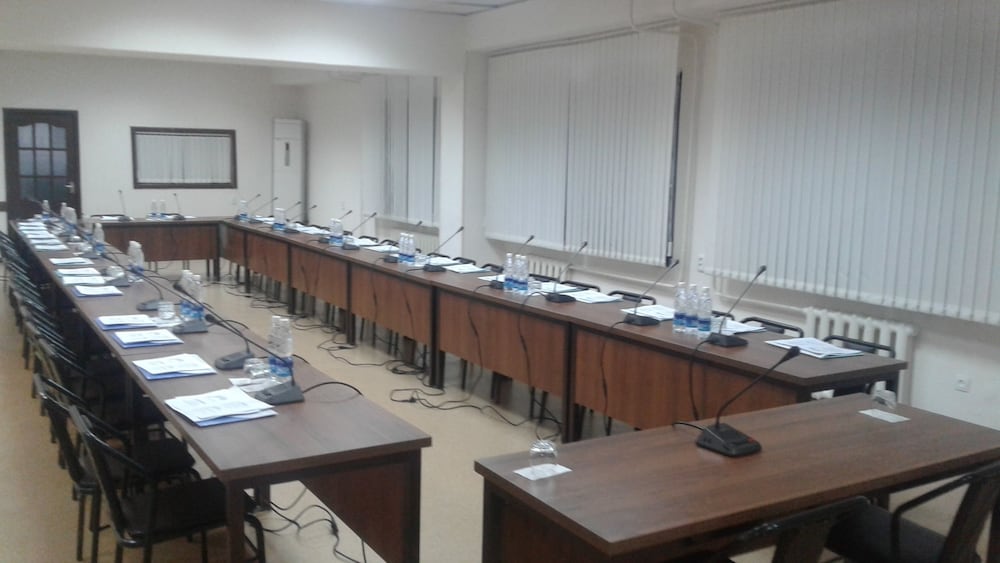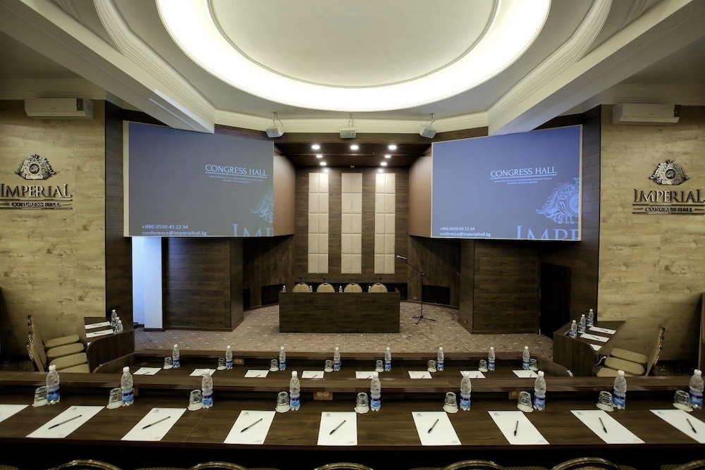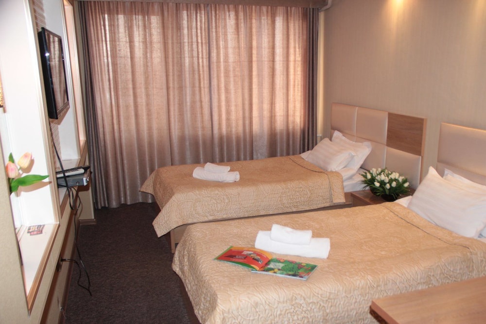 It is a three star hotel located at the centre of the city Bishkek. Rooms are clean and good at size with hot and cold showers. Each room has also a balcony that you can see outside scene. Hotel has a restaurant and bar. Restaurant serves vegetarian foods of good taste. People at restaurant can speak English. Break-fast is provided of national standard. I found the people at the reception and room service very friendly, cooperative and service-oriented. There are three lifts, one with express service.