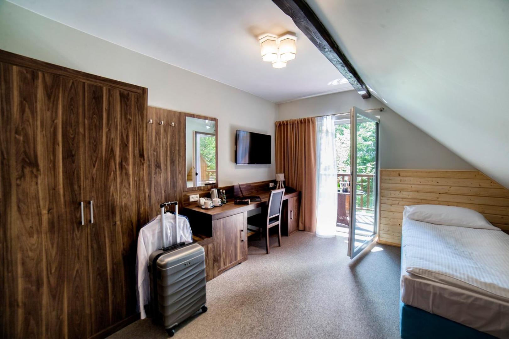 Piękny, kameralny hotel, wśród natury. Bardzo duży wybór produktów na śniadaniu. Czysta strefa SPA, gdzie można odpocząć w ciszy. Pokój w formie osobnego domku to strzał w 10 - spokój, prywatny tarasik, ładnie urządzony. Co najważniejsze, hotel jest bardzo przyjazdy psom 💕