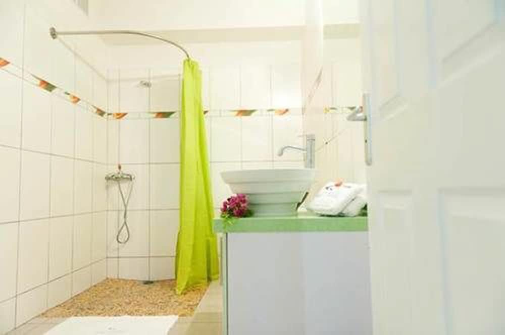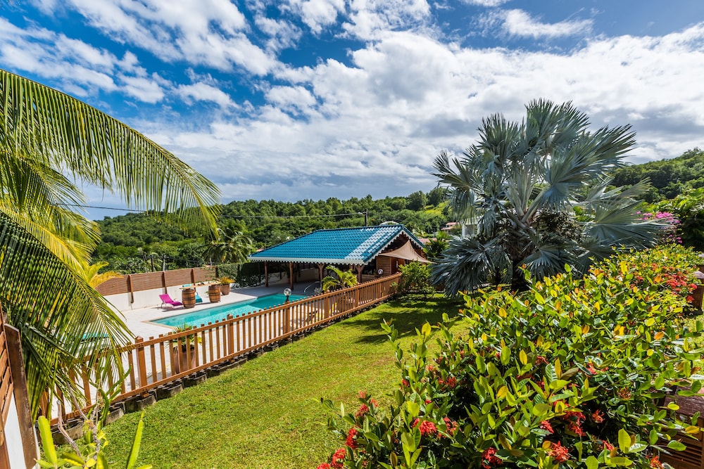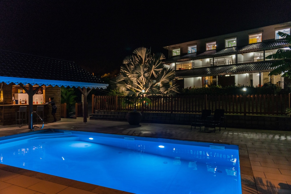 The location is nice quiet local village about half an hour from the airport. Our room was spacious and meticulously clean. The kitchen was very well equipped. There is a beautiful view to the upfront green hill and a crystal clear swimming pool surrounded by a tropical garden which is even nicer in the evening because of garden spot lightning.