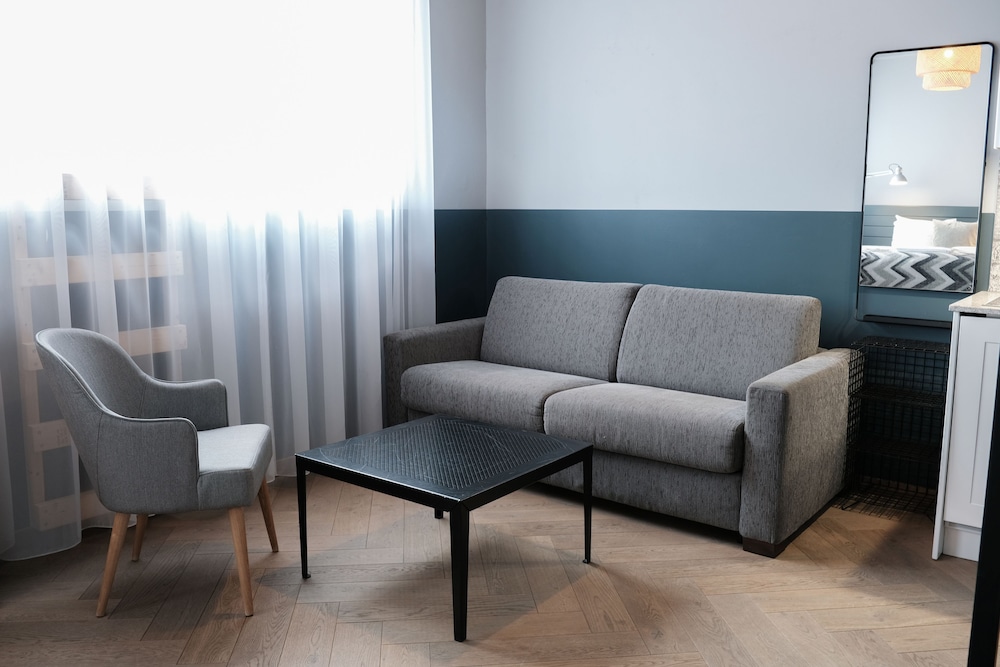 Location on a side street, down a hill. No check in personnel, a small waiting area with a locked luggage storage room, which could be accessed with a code. Our studio had a door to a private balcony which wouldn't lock, but after a call to the management, a repair man came and fixed it.