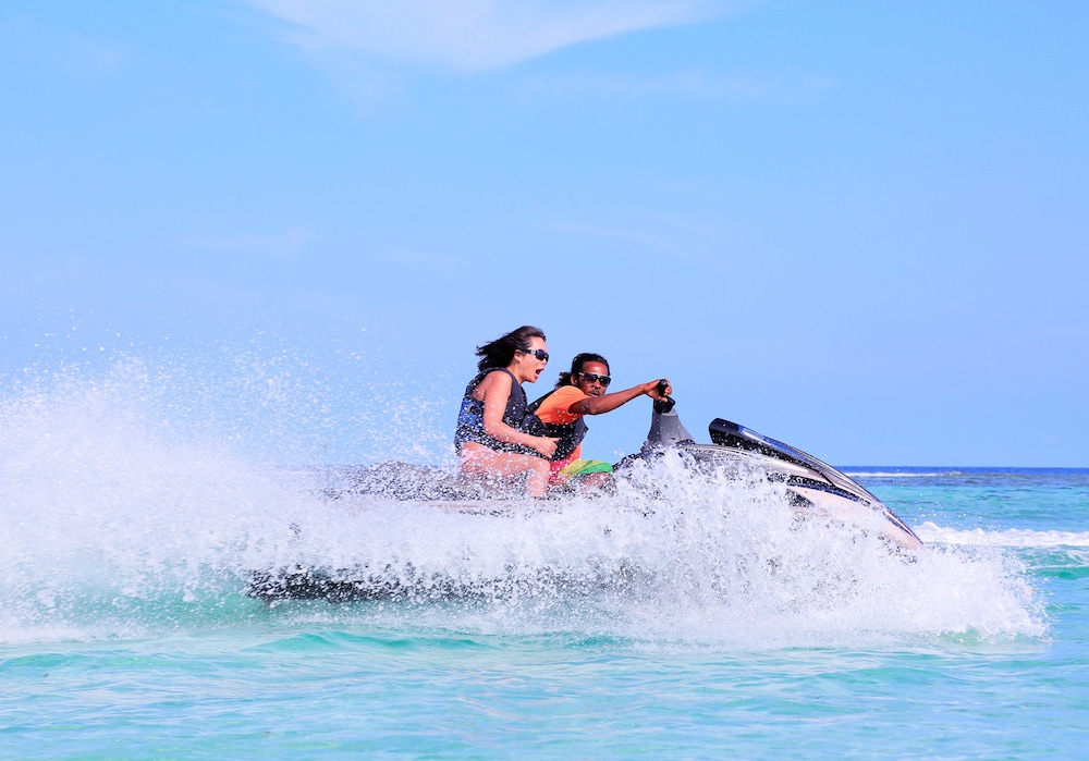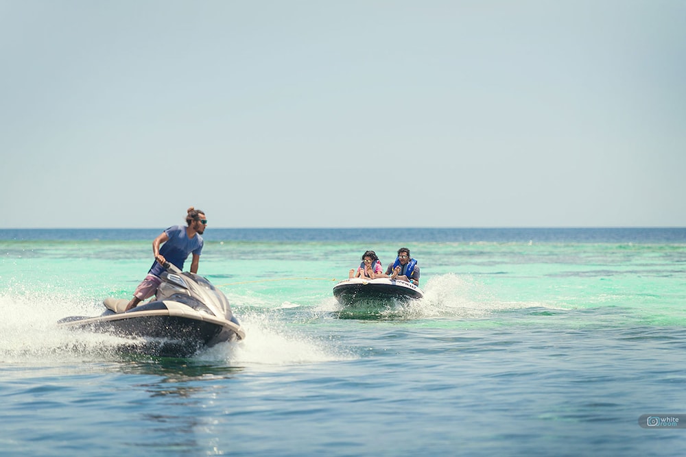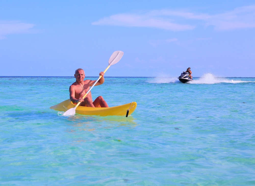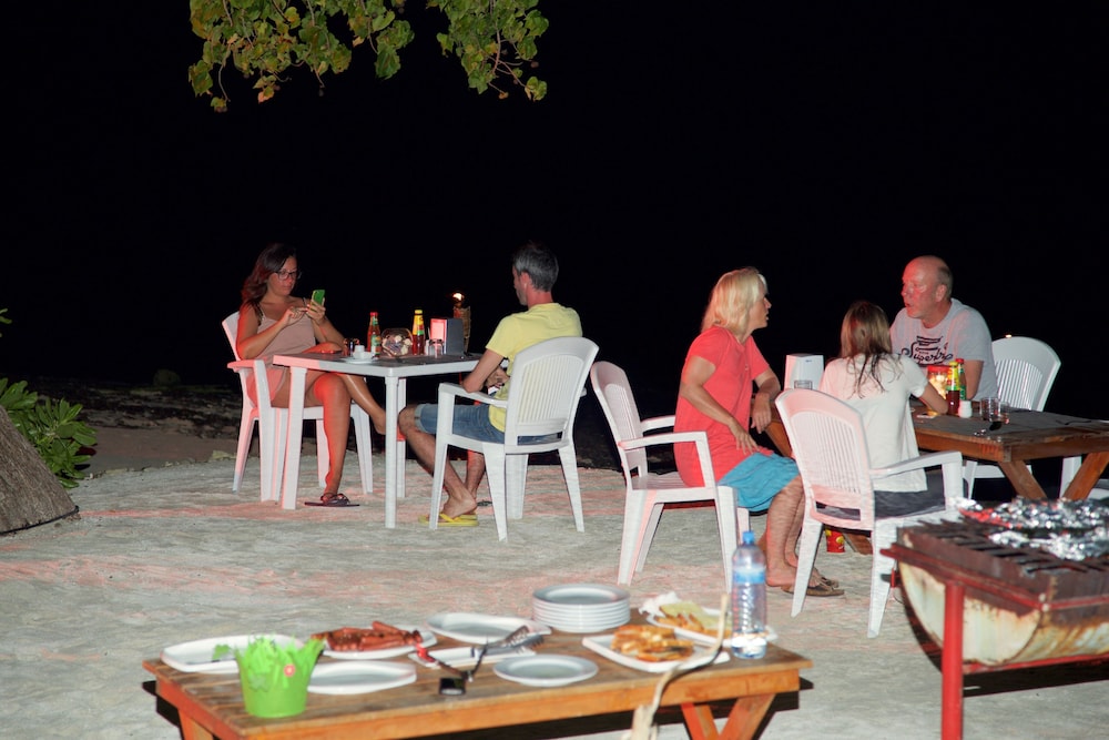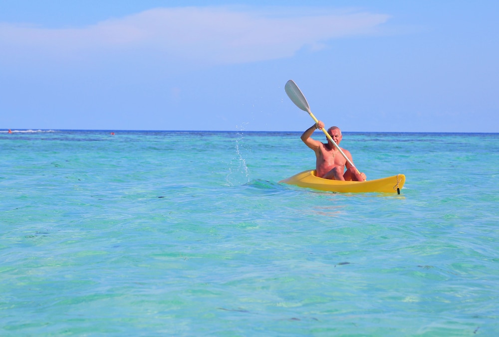 There is a PADI Dive School and a Water Sport Center on the Island. Excursions are offered by the guesthouse and the Watersport Center. There is a bikini beach with for the tourists.