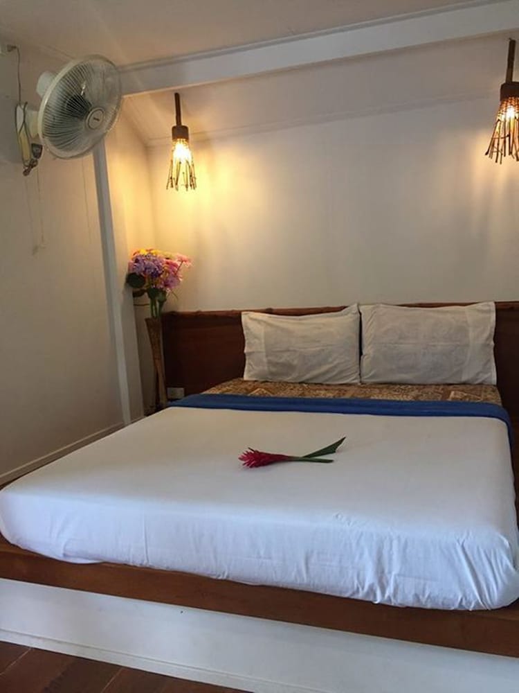 J'ai donc réservé une chambre sur photo de 30m2 avec des équipements tels que wifi, eau chaude et tv. Au final je me suis retrouvé dans une espèce de loge de gardien de 10m2 sans tv sans wifi et avec un espèce de sommier en grille métallique à la place du lit, rien à voir avec ce que j'ai réservé. Quand j'ai voulu aller voir le type de la réception j'ai vite déchanté car à 19h il n'y a plus personne. Une nuit en enfer plus tard j'explique que j'ai payé 14€ pour une chambre avec équipement et que ce n'est pas ce que j'ai payé. Il ma donc changé de chambre. J'avais bien un.lit avec matelas mais ni tv ni eau chaude ni wifi. J'ai encore change de chambre le surlendemain toujours sans wifi, avec EAU CHAUDE sans tv et sans lavabo ni miroir. Si vous voulez vous laver les dents vous devez le faire sous la douche. Hyper pratique pour mettre des lentilles de contact. .. En gros les équipements sont au choix et non en package. Nous avons vu les gens défiler pour se plaindre de l'eau froide et du wifi inexistant en chambre mais que a laccueil. Cependant gros point positif l'emplacement. La description est donc erronée ce qui ma valu d'être déçu car c'est une ile très isolé et dépourvue de chose à faire. Donc sans wifi ni tv c'est un koh lanta assuré. L'accueil est sympas mais rien d'extraordinaire. Petit conseil si il vous enmmene dans la hutte orange demandez à changer de chambre de suite...