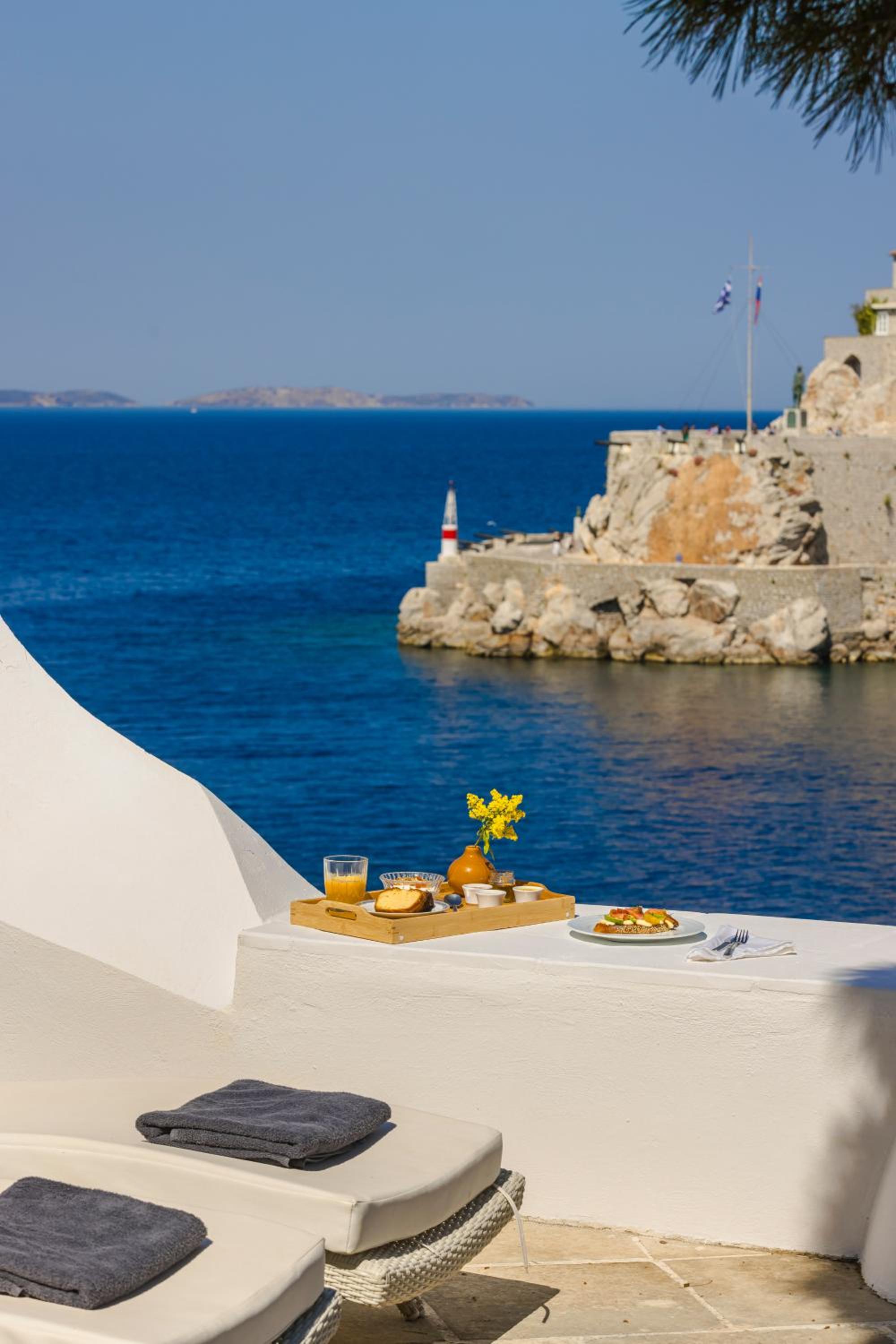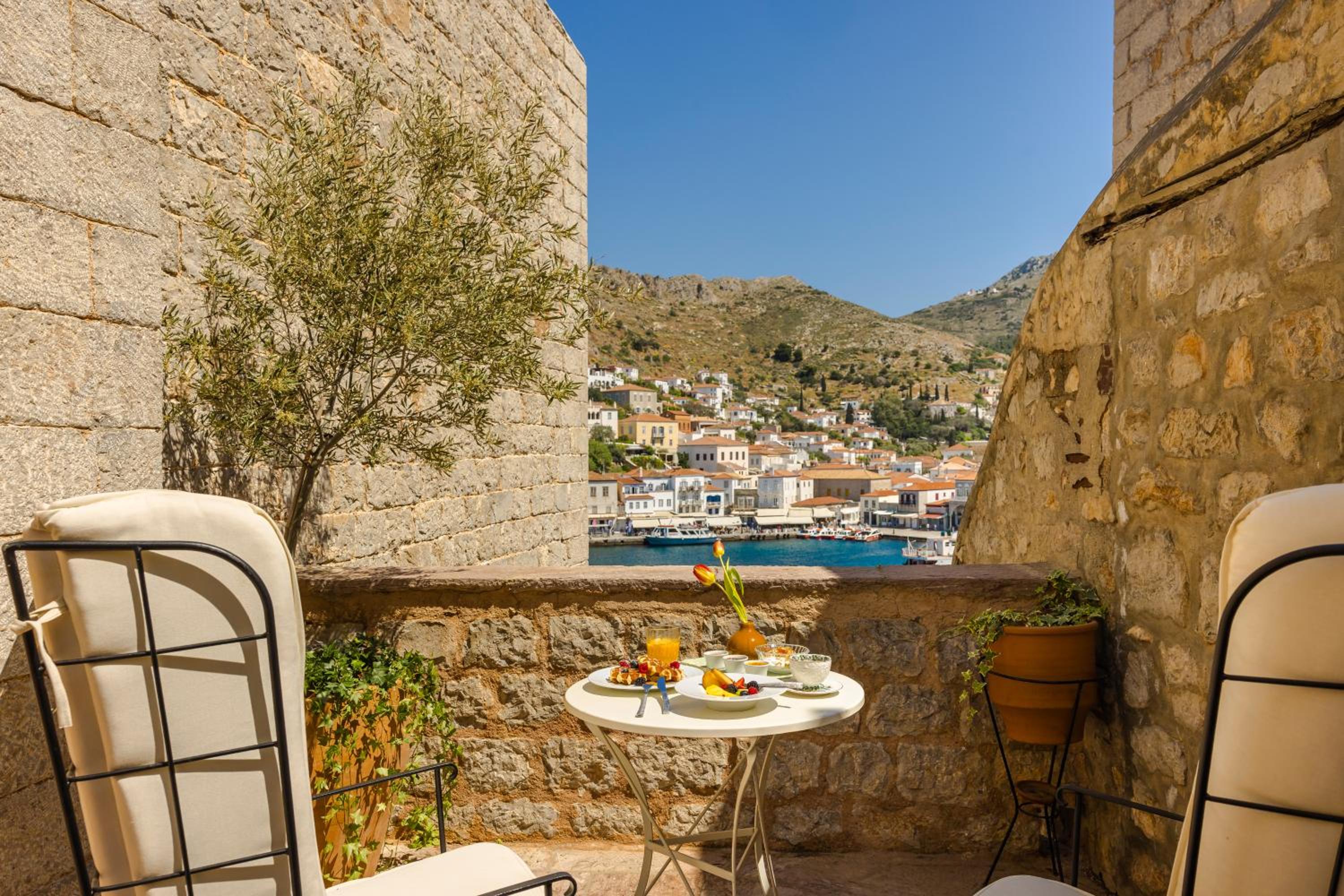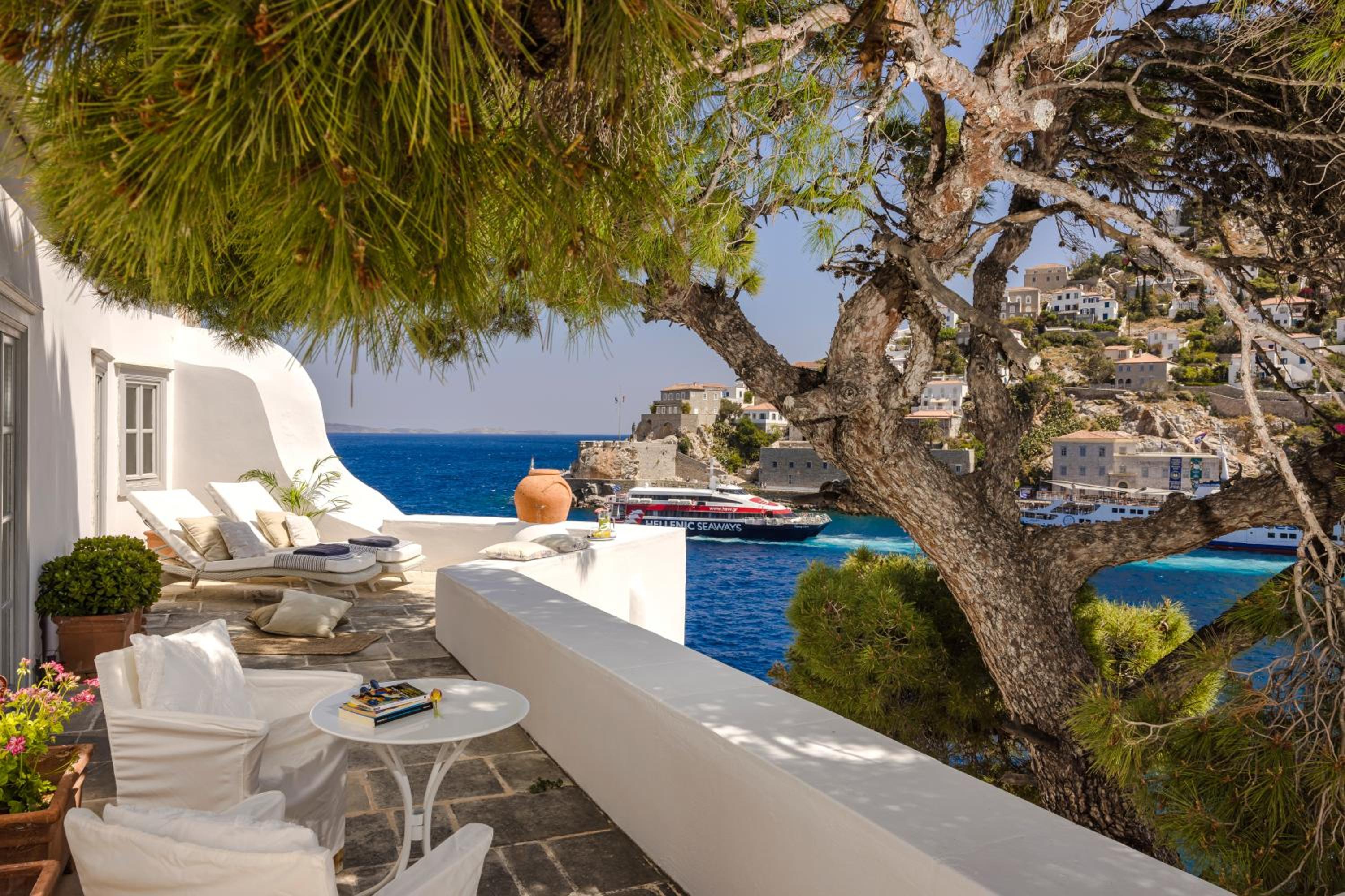 Hydrea Hotel is a stunning, high-end property right on the port of Hydra. The view from the terrace is incredible, overlooking the harbor and town. The location is unbeatable—you’re just steps from all the restaurants and shops.