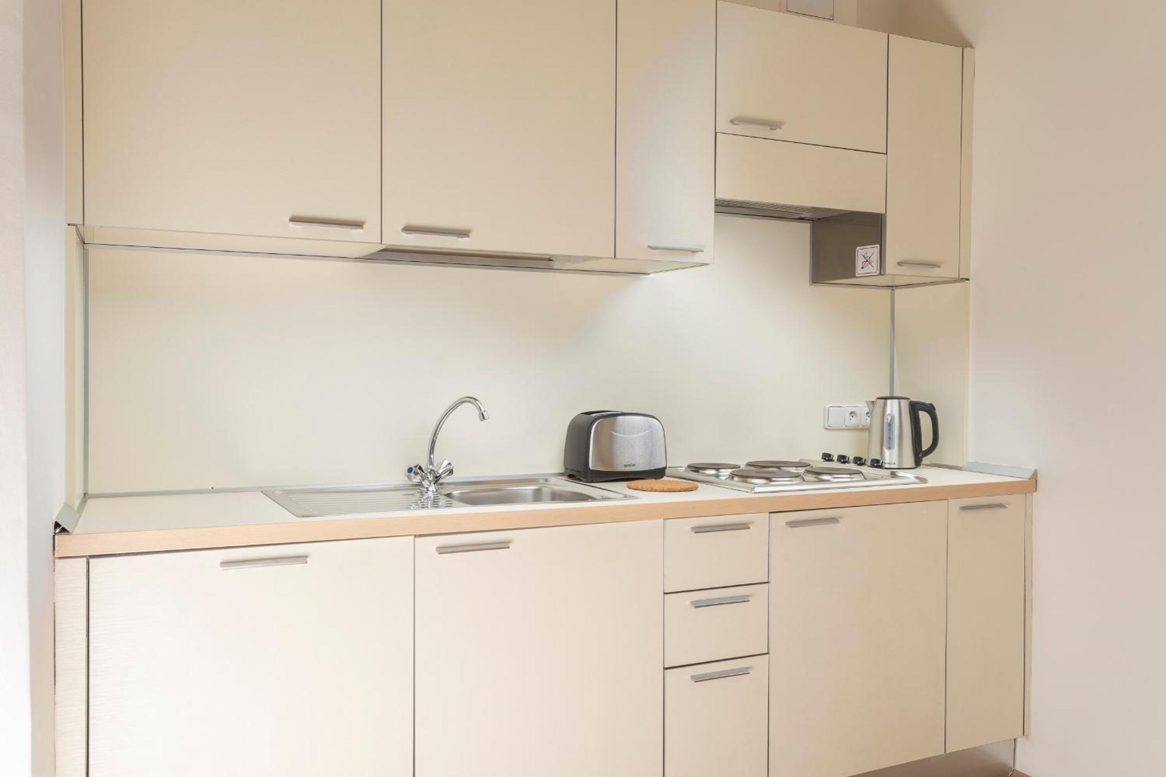 Relax in our units featuring parquet floors, fully equipped kitchens, and comfortable living spaces. Watch your favorite shows on the flat-screen TV or unwind in the private bathroom with a bath or shower. Bed linen, towels, and kitchen essentials are provided for your convenience.