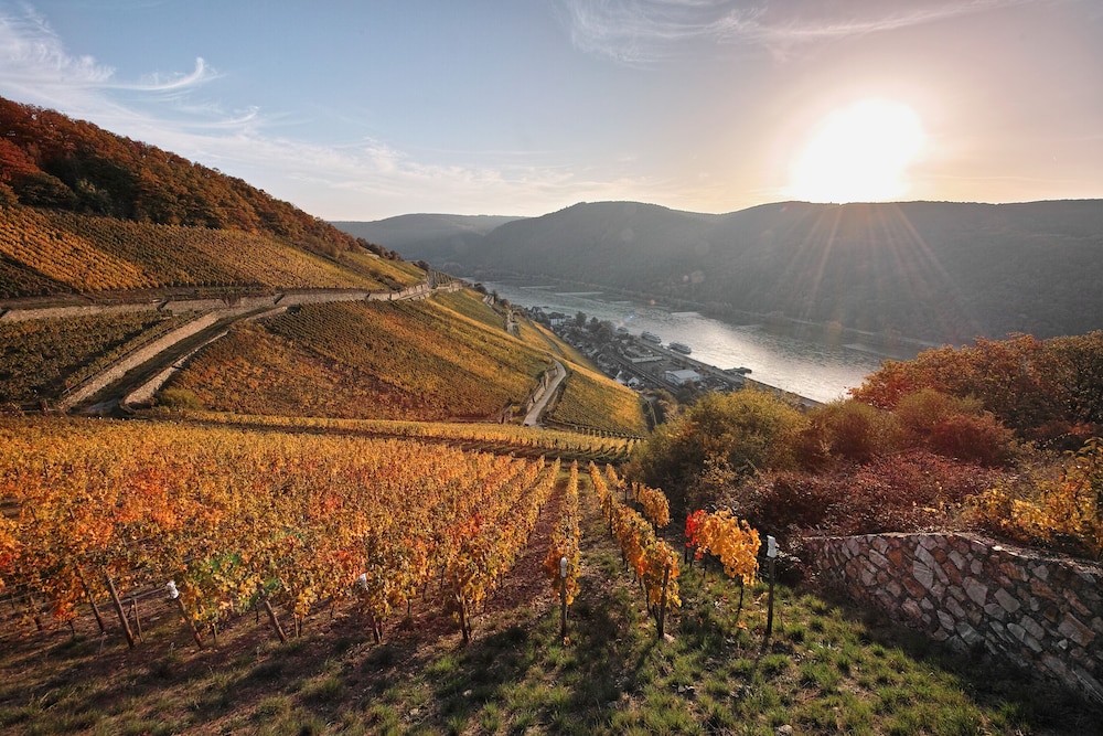 Enjoy breathtaking views from the terrace and garden at Breuer's Rüdesheimer Schloss.