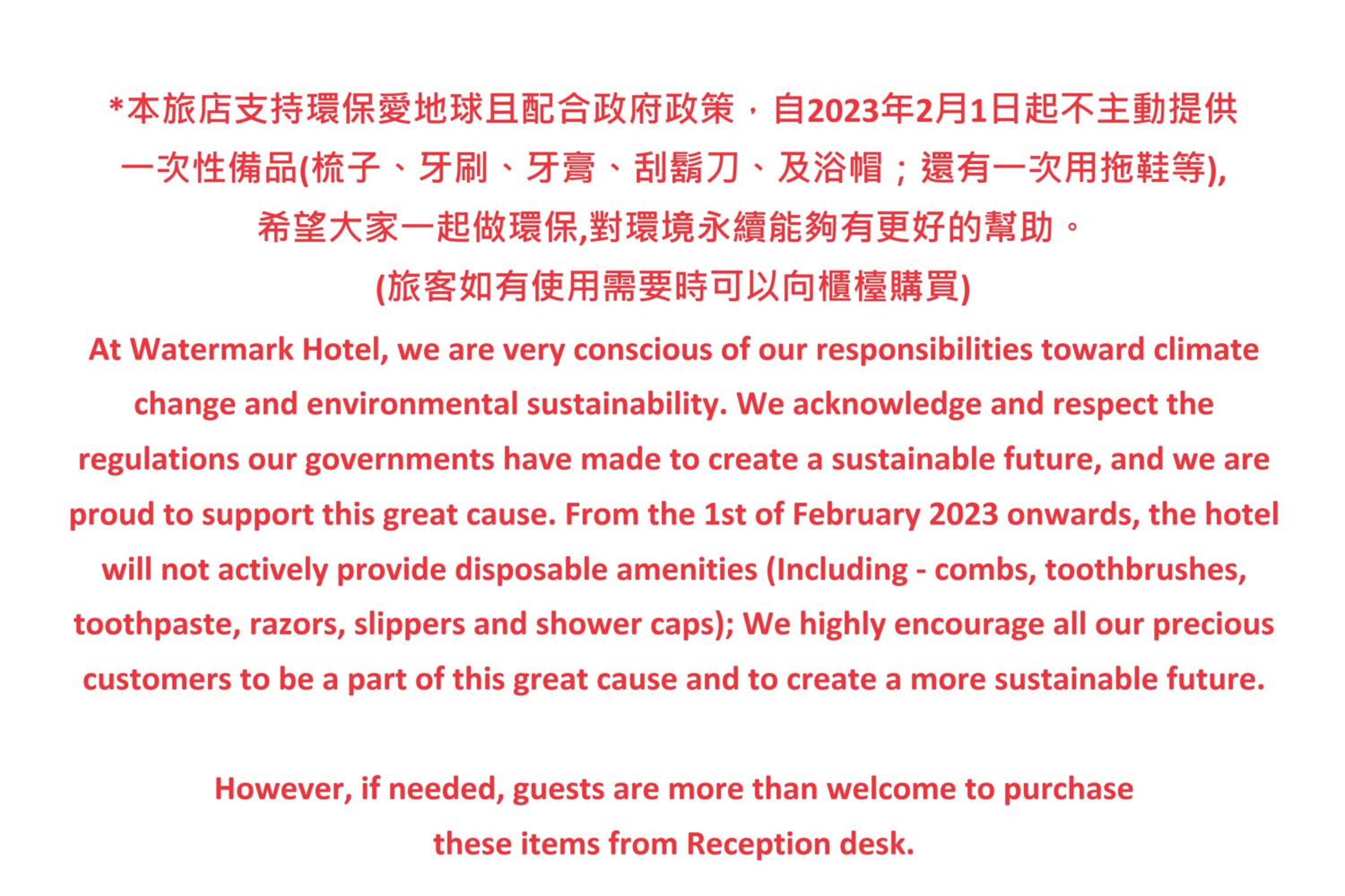 At Watermark Hotel, we are very conscious of our responsibilities toward climate change and environmental sustainability. We acknowledge and respect the regulations our governments have made to create a sustainable future, and we are proud to support this great cause. From the 1st of February 2023 onwards, the hotel will not actively provide disposable amenities (Including - combs, toothbrushes, toothpaste, razors, slippers and shower caps); however, if needed, guests are more than welcome to purchase from any of our staff for these items.