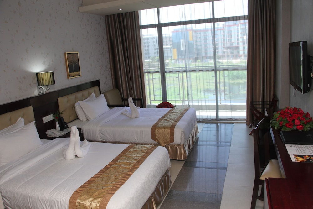 Comfortable Rooms and Convenient Amenities - Experience the comfort of 210 guestrooms with private balconies, LED TVs, and free Wi-Fi. Business center, complimentary buffet breakfast, and airport shuttle add convenience to your stay.