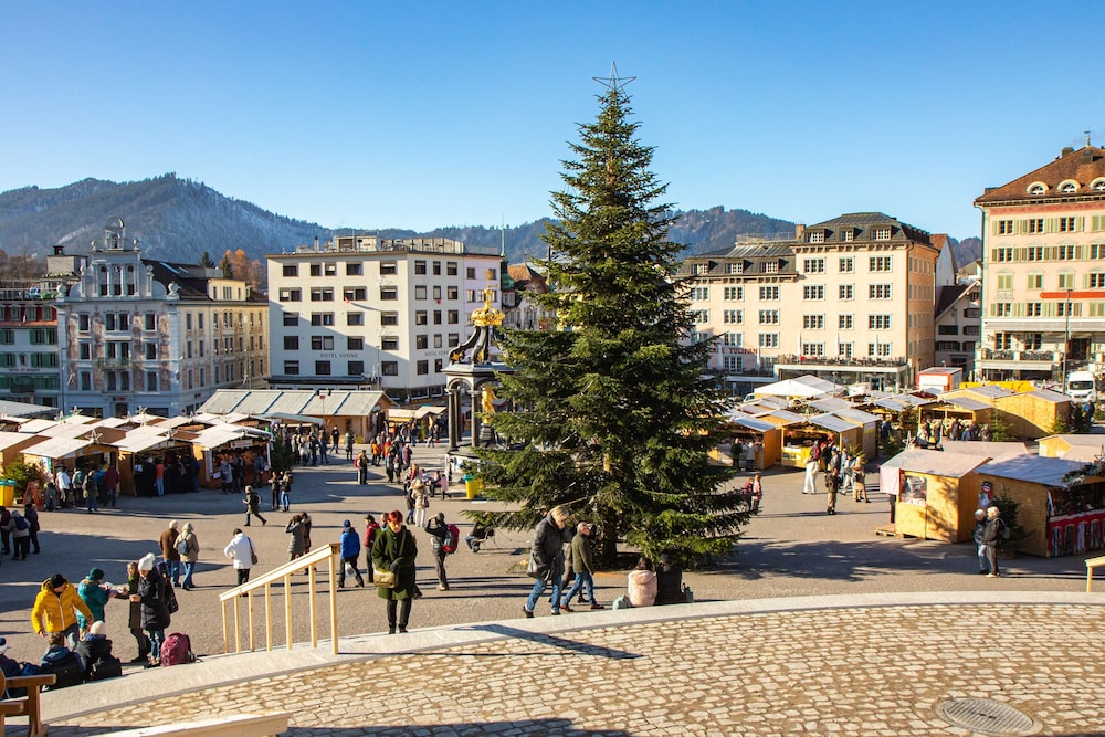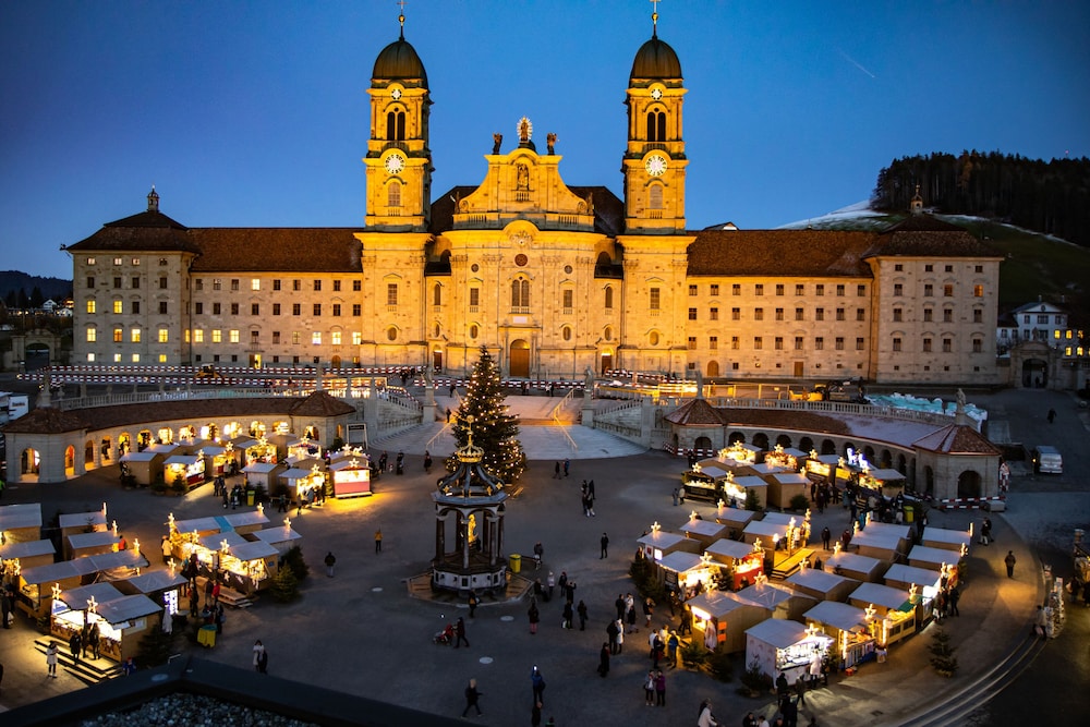 Die Lage des Hotels am Klosterplatz ist ideal für Leute, die Einsiedeln als Wallfahrtsort gewählt haben oder einfach das Dorf erleben wollen.