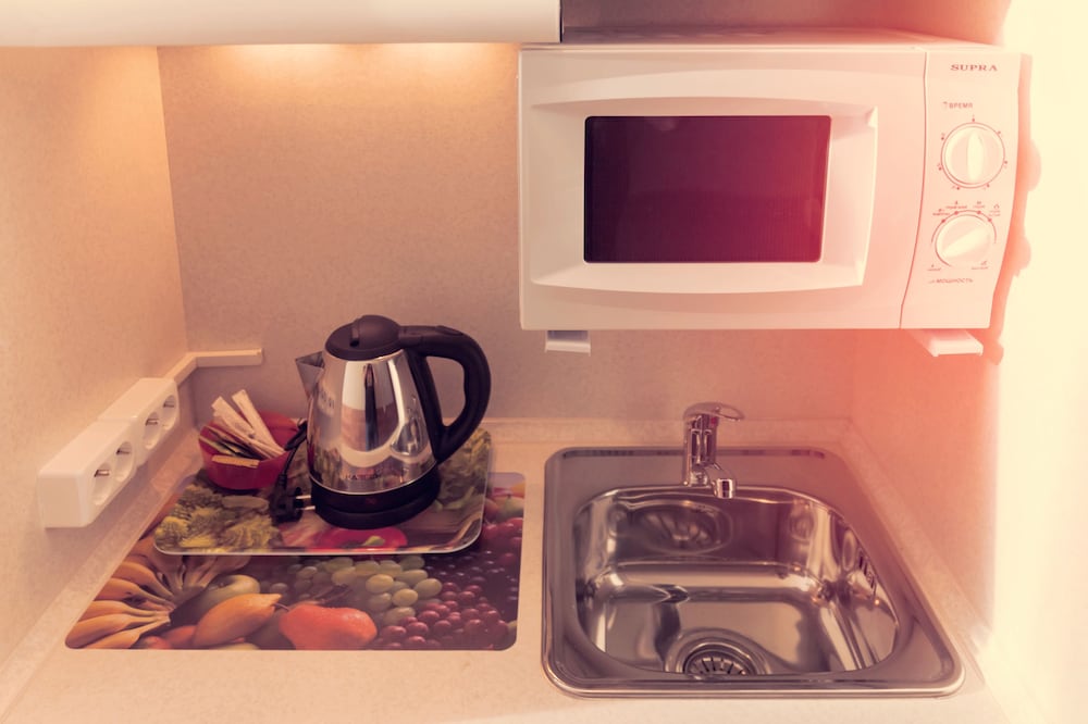 冷蔵庫と簡易なキッチン付きで、近くのスーパーで買い物したのを調理でき、便利です。