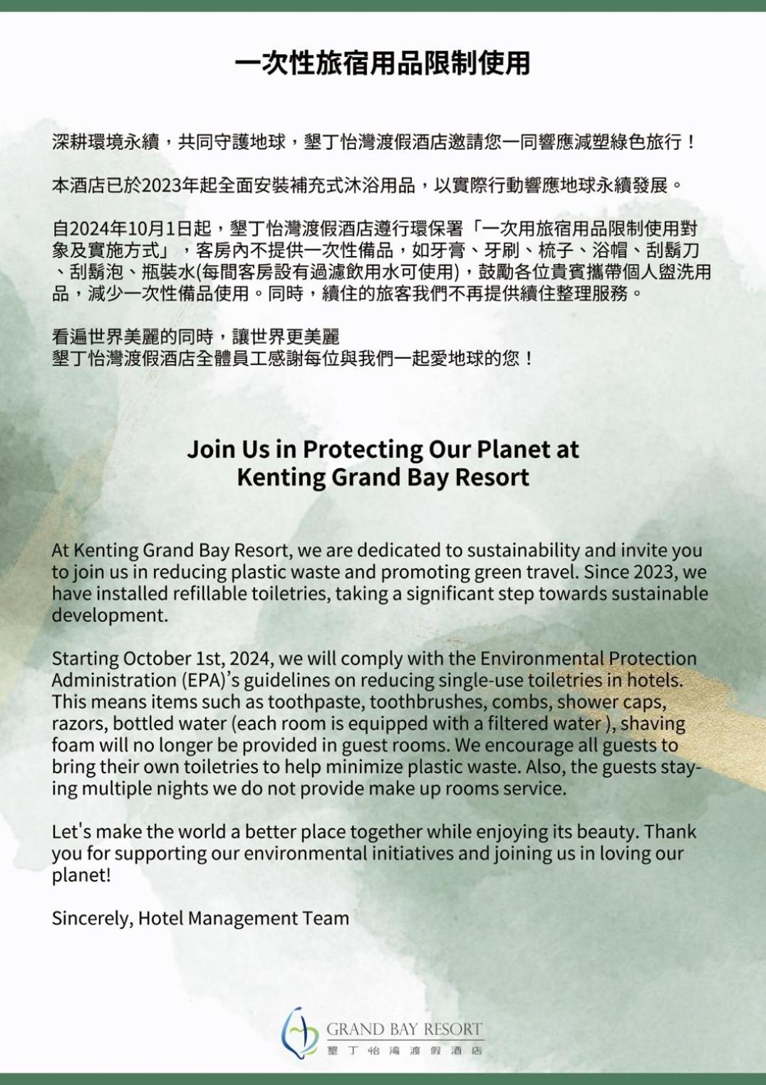 In response to environmental protection, the hotel no longer provides bottled water. All rooms have drinking water facilities for use.