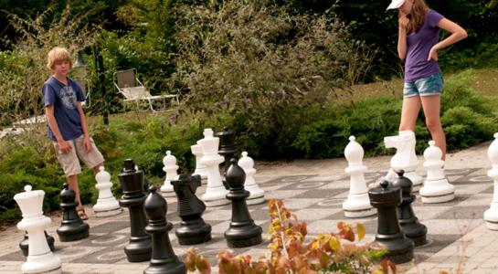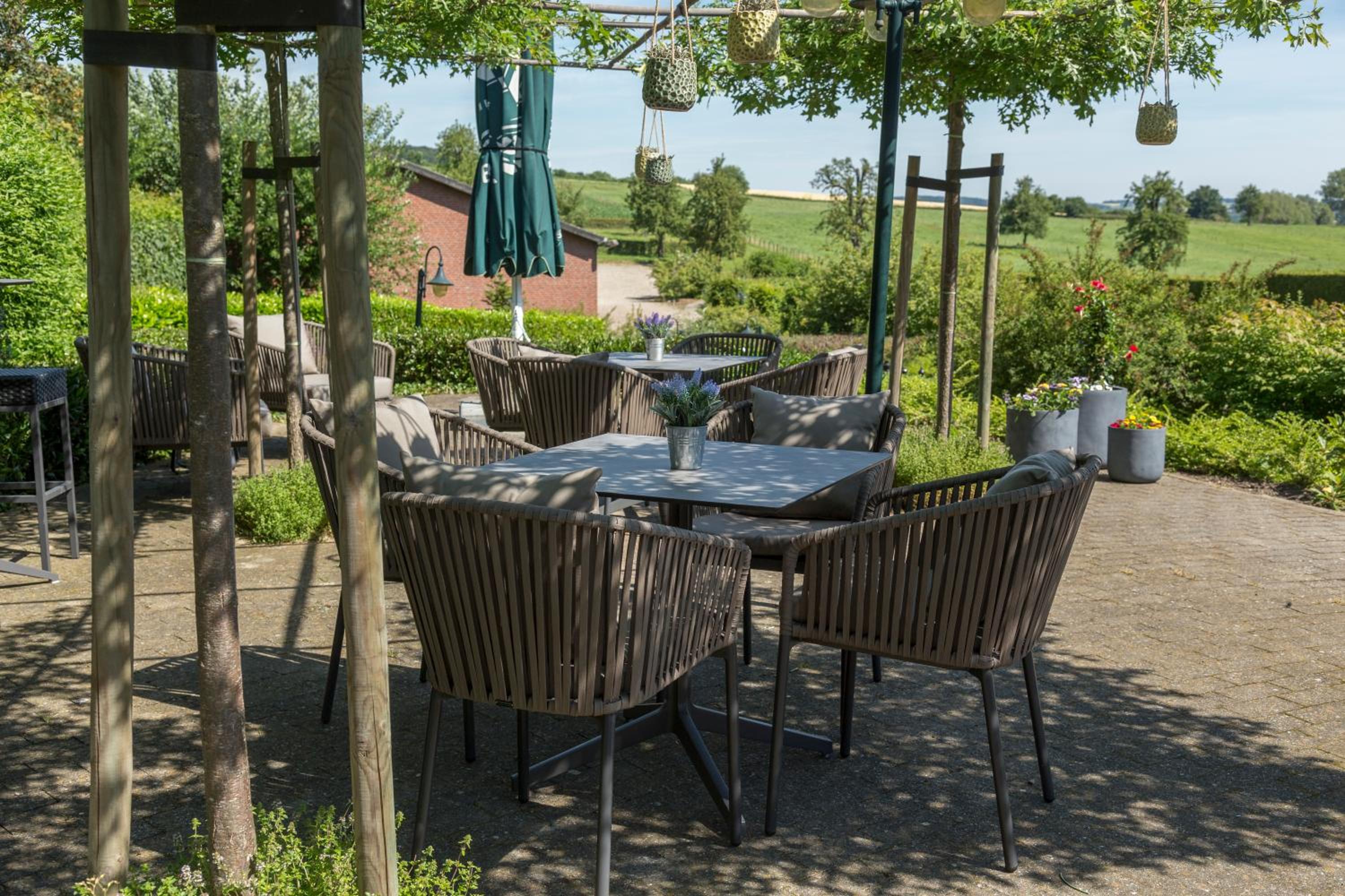 The landscaped garden with a patio overlooking the Limburgish Hills provides a perfect setting for relaxation. Enjoy shaded seating areas, sun loungers, and even garden games like a giant chess set.