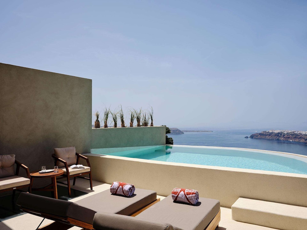 The Andronis properties are some of the nicest on the island! This is no exception, the suites are very spacious, the private pool water is not hot but warmer than the main pool which did not seem heated, the spa treatments were quality… the only thing about this place is location. It’s in imerovigli which is between oia and fora. They don’t really have a restaurant there, they have one but it’s more like a pool bar. Must people catch a shuttle to oia that comes every hour and is complimentary if you want to not have to do that I would suggest there other properties in oia and Arcadia looked like the best of those and had a great restaurant called Pacmon where you can see the sunset! If I had a do over I’d stay there instead! Other than that pretty pleased with the experience! The morning breakfast is very good!