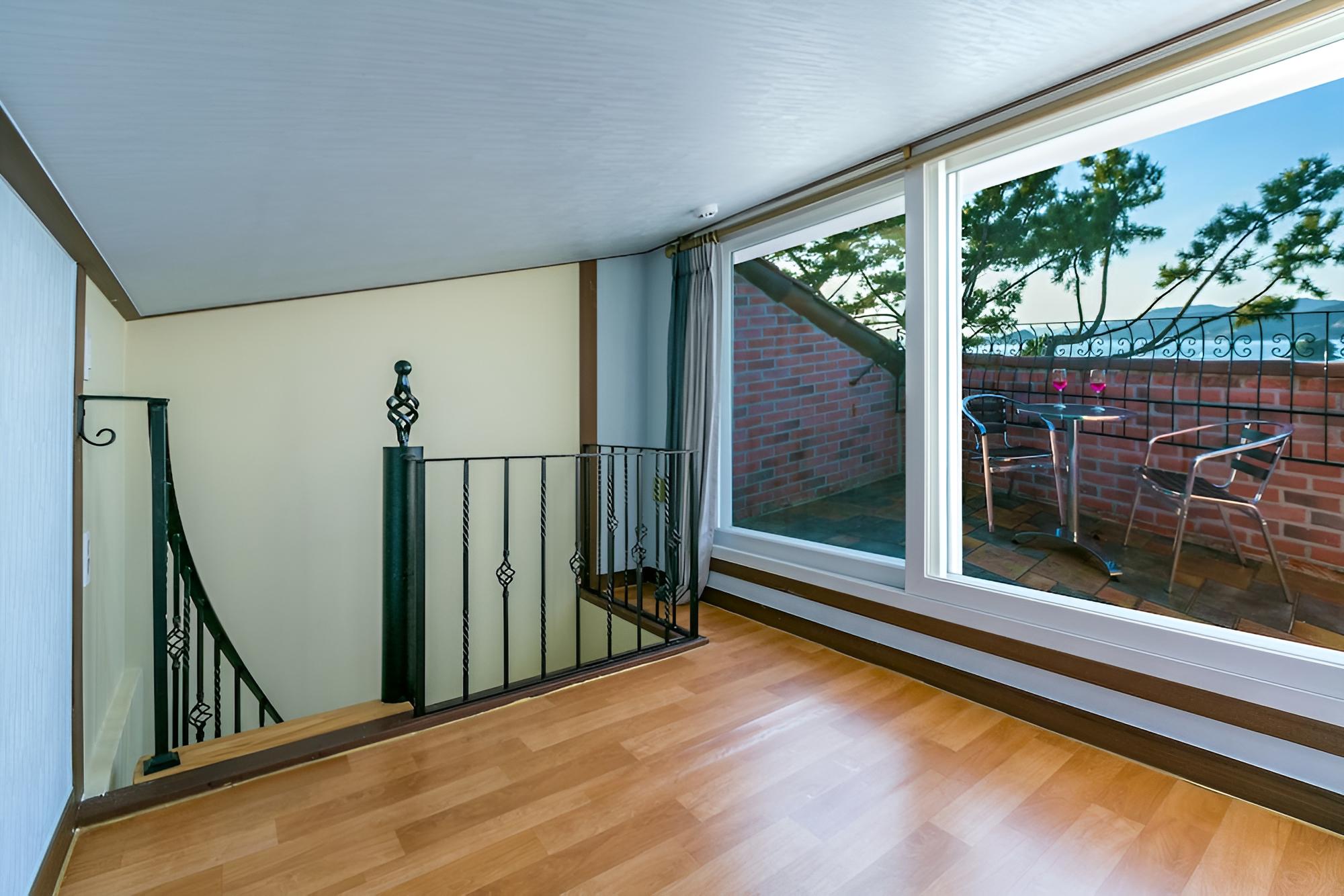Recreational Amenities and Views: Indulge in the seasonal outdoor pool and terrace view at Tongyeong Beach Castle Hotel.