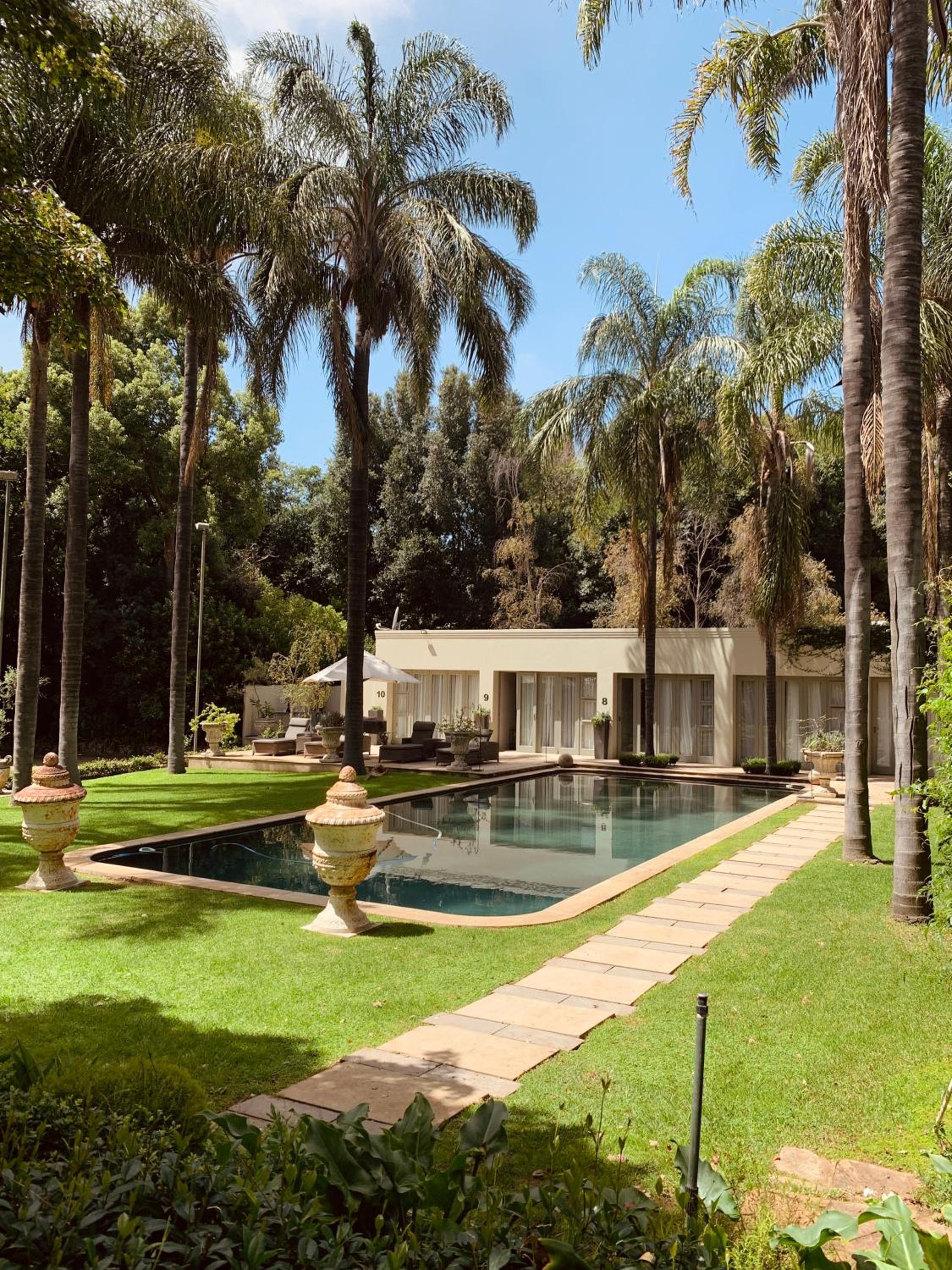 Hoeveld House in Sandton offers elegant rooms with modern amenities. Each room features a flat-screen TV, private bathroom, and comfortable seating area. Indulge in luxury with plush bathrobes and complimentary toiletries for a relaxing stay.