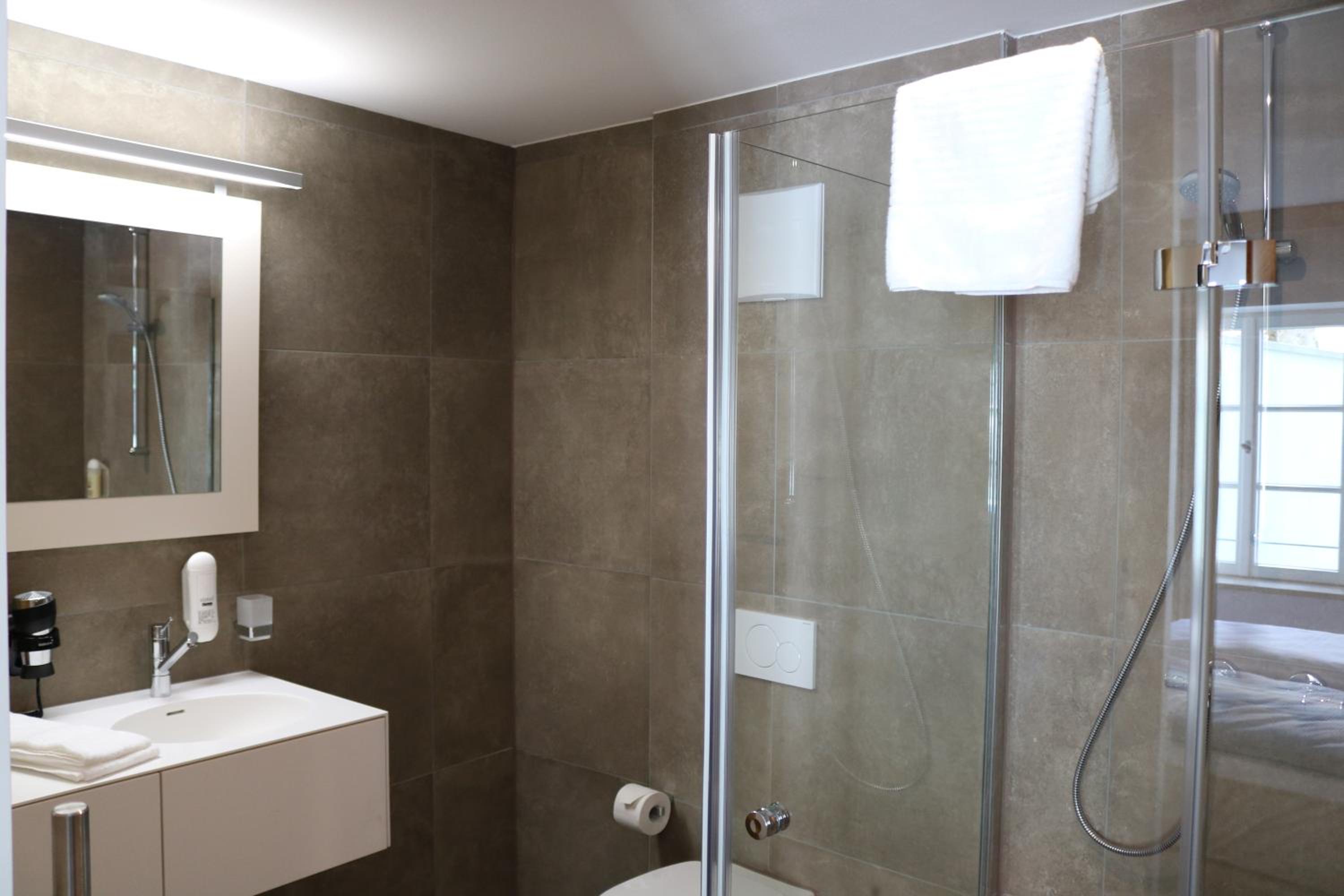 Sehr ruhig im.oberen Stock. Viel Platz im Zimmer, alle da, was frau braucht.