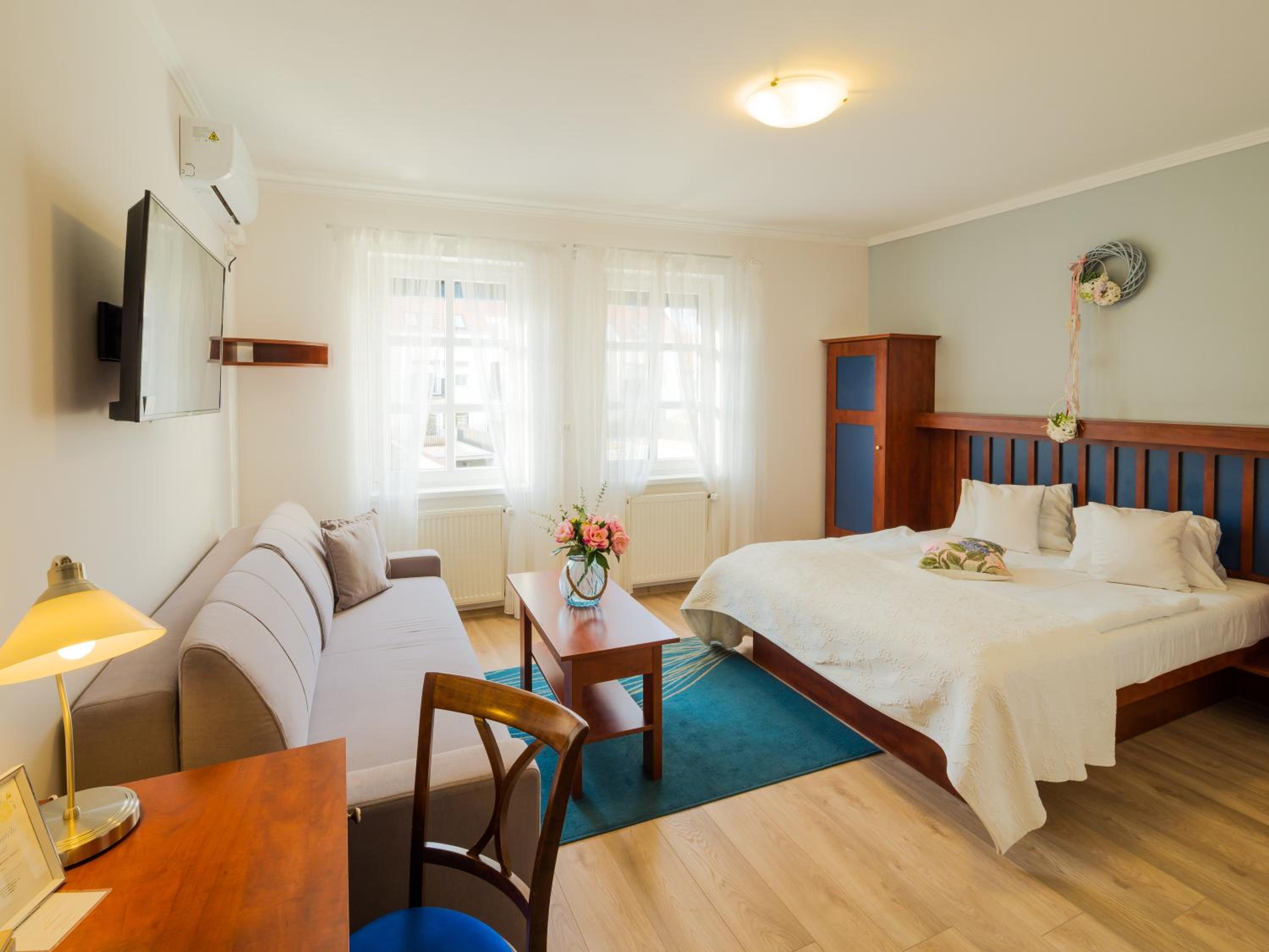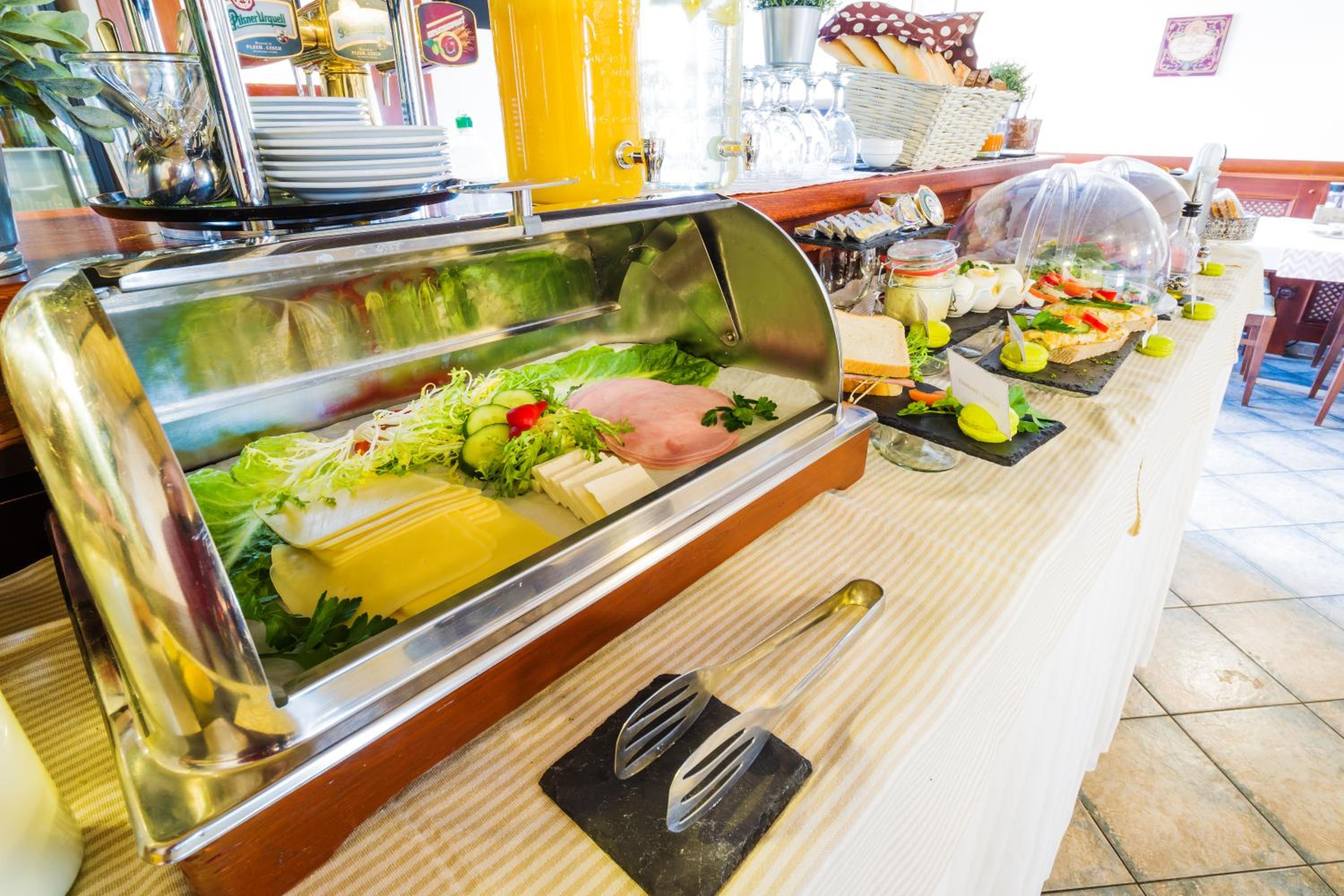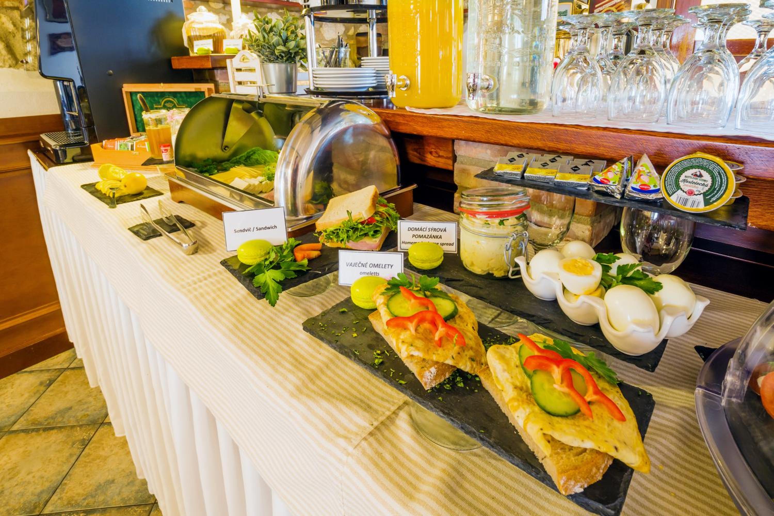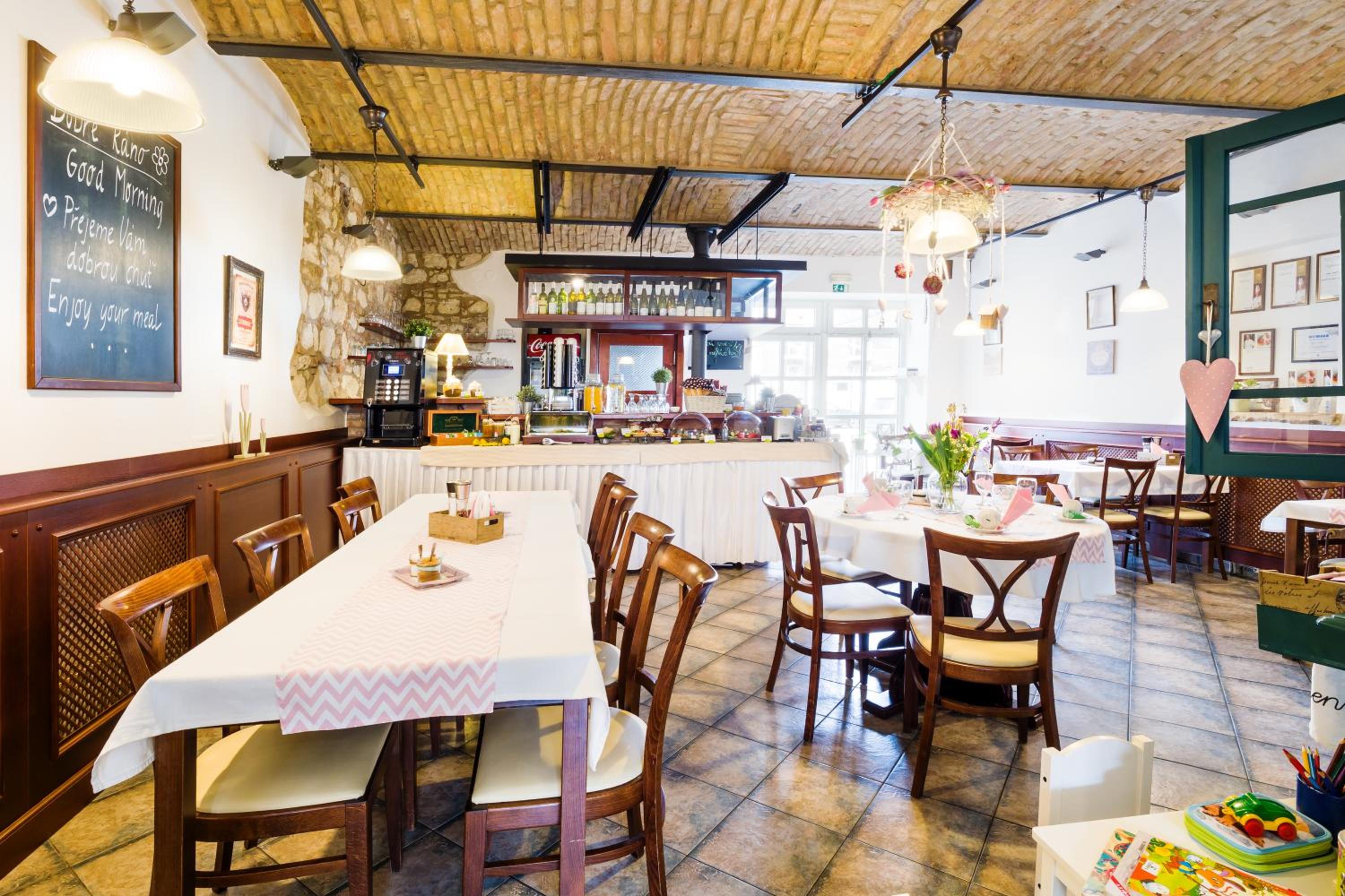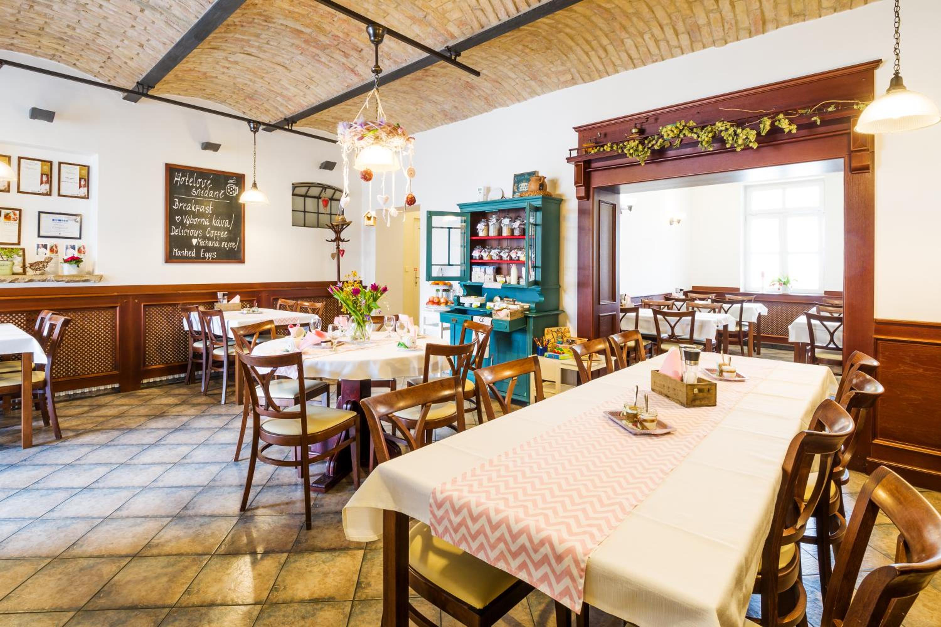 Guests can relish a daily breakfast spread in the charming dining lounge or outside on the spacious garden terrace. For lunch and dinner, the on-site restaurant specializes in Moravian delicacies and wines, creating a delectable culinary journey.