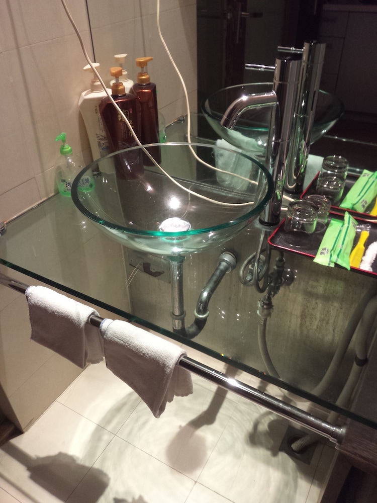 Well for starters our room was different than the pictures. It was not clean, someone (probably another guest) left their glass (with who knows what inside) and cigarette butts on the table. The bathroom was decent and included amenities, such as toothbrushes, soap, shampoo, etc. The mini fridge didn't work and I didn't bother using the kitchenette. There is a 24 hr check-in receptionist on the 16th floor, he didn't speak English but he was polite and tried his best. They also let us store our bags after we checked out so that's kind of a plus.